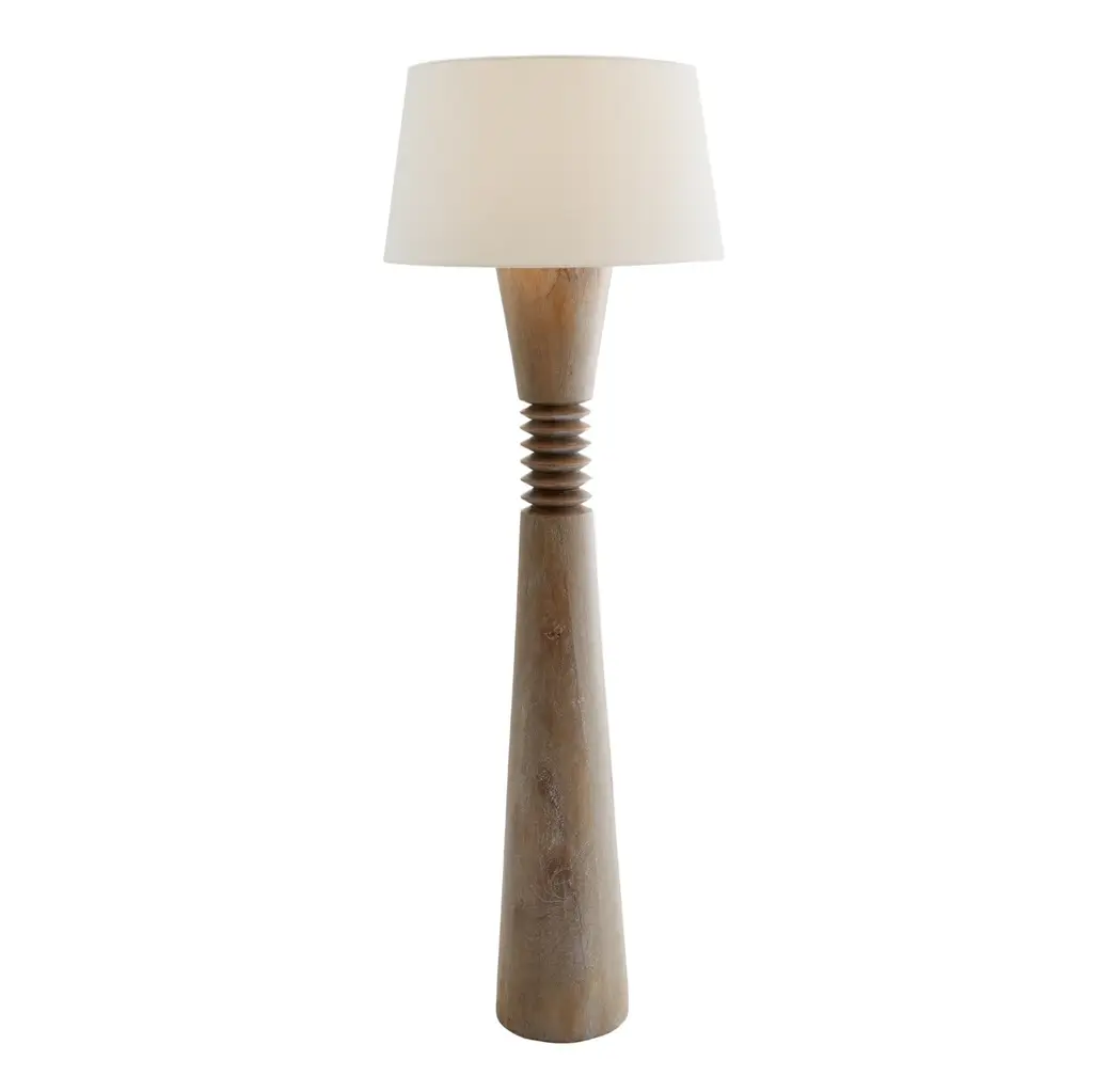 The turned-wood Sedona lamp exemplifies minimalism on maximalist scale. The cerused oak floor lamp is designed with a cinched, carved waist to create textural contrast. A polished nickel finial accessorizes the piece. The lamp is topped with an off-white, tapered linen shade lined in off-white cotton. Finish will vary.