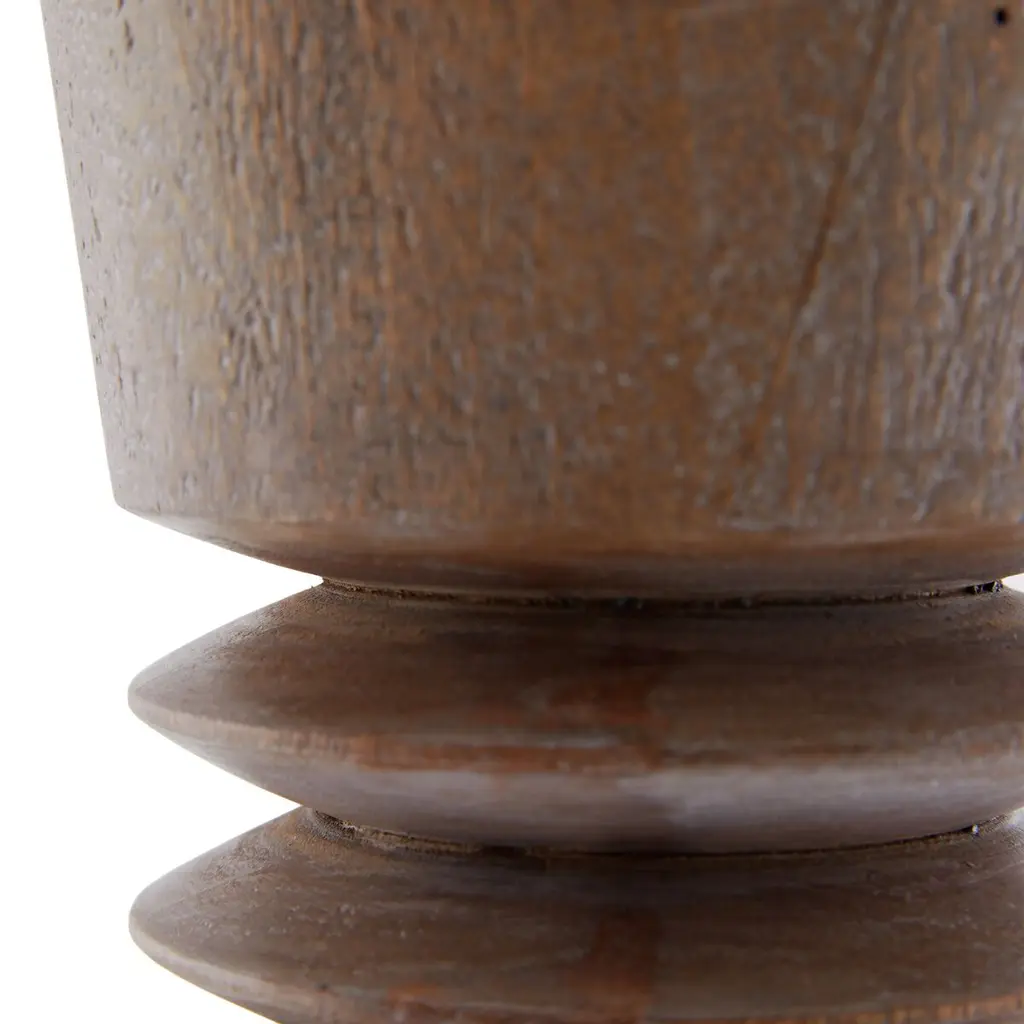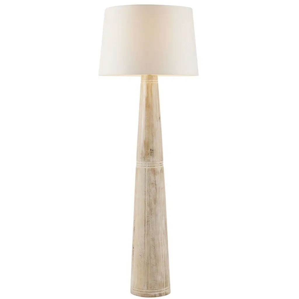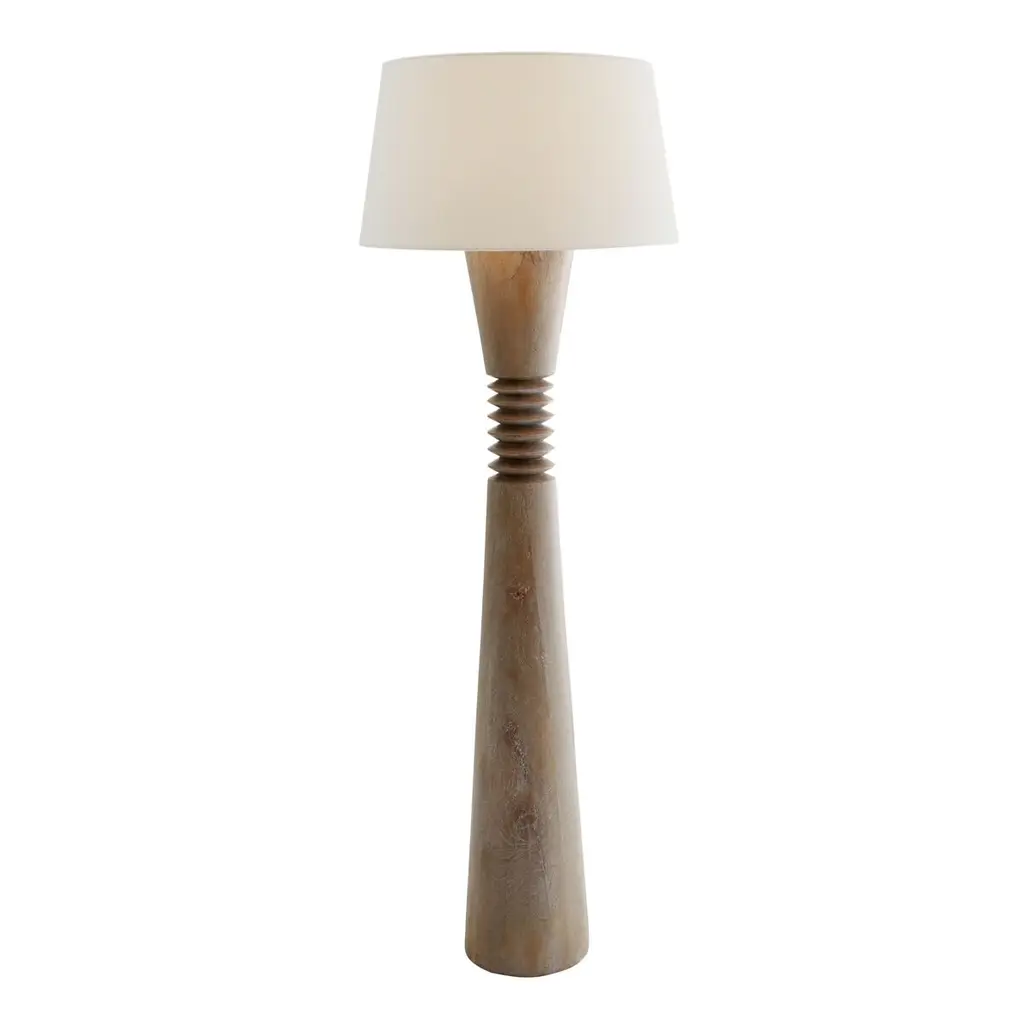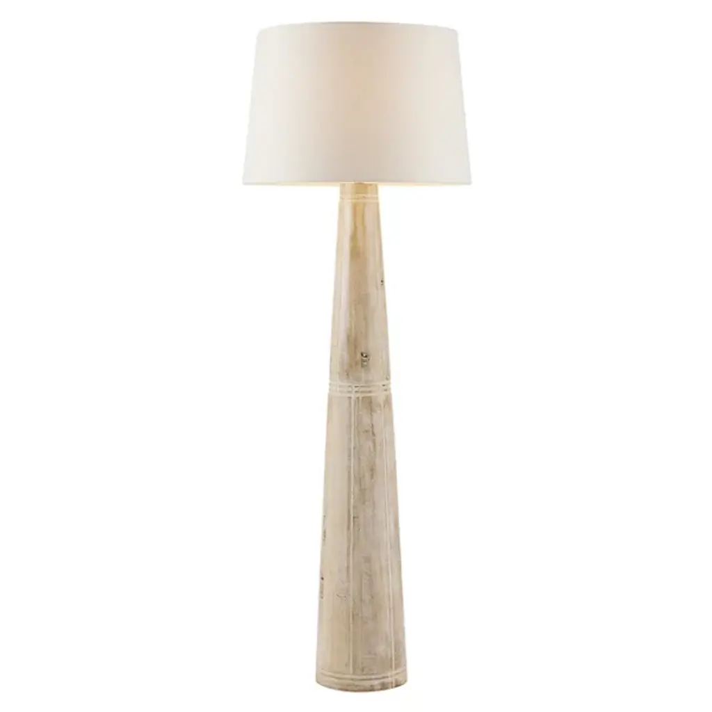 The turned-wood Sedona lamp exemplifies minimalism on maximalist scale. The cerused oak floor lamp is designed with a cinched, carved waist to create textural contrast. A polished nickel finial accessorizes the piece. The lamp is topped with an off-white, tapered linen shade lined in off-white cotton. Finish will vary.