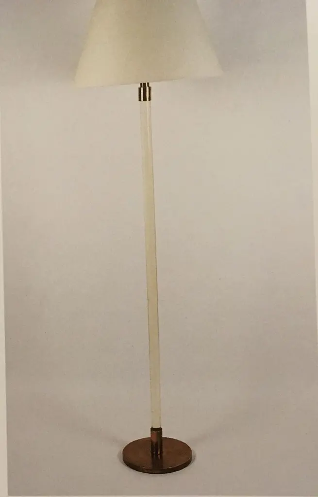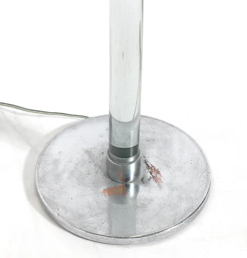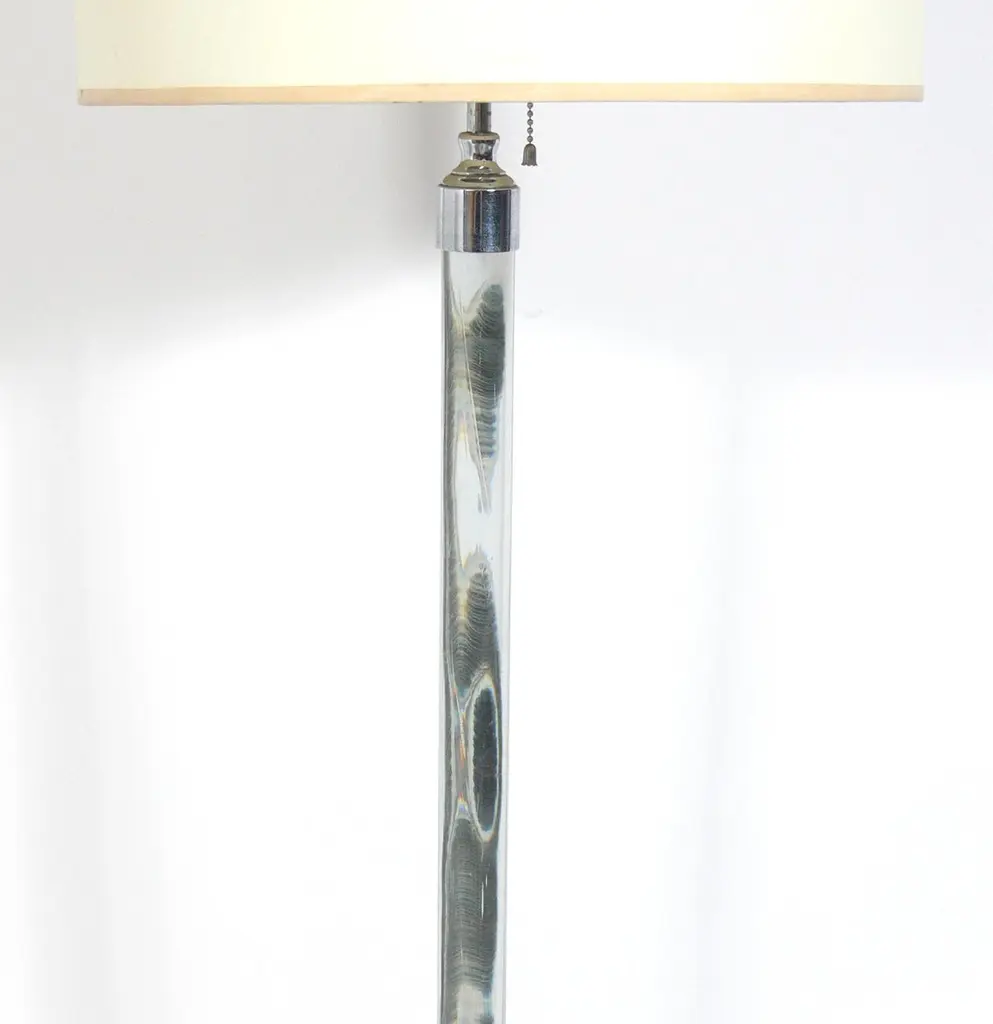 Selection of Glass Rod Floor Lamps, by Hansen, American, circa 1940s. These lamps are probably based on a Jean Michel Frank design, see last photo for the Frank design. These thick glass rod lamps were a favourite choice of Samuel Marx and are used in many of his interiors. See second to last photo. The lamp pictured on the left measures 63" height to the top of the shade x 17" shade width. The lamp pictured on the right measures 57" height to the top of the shade x 17" shade width. The bases of each lamp measure 10" diameter. They have both been rewired.