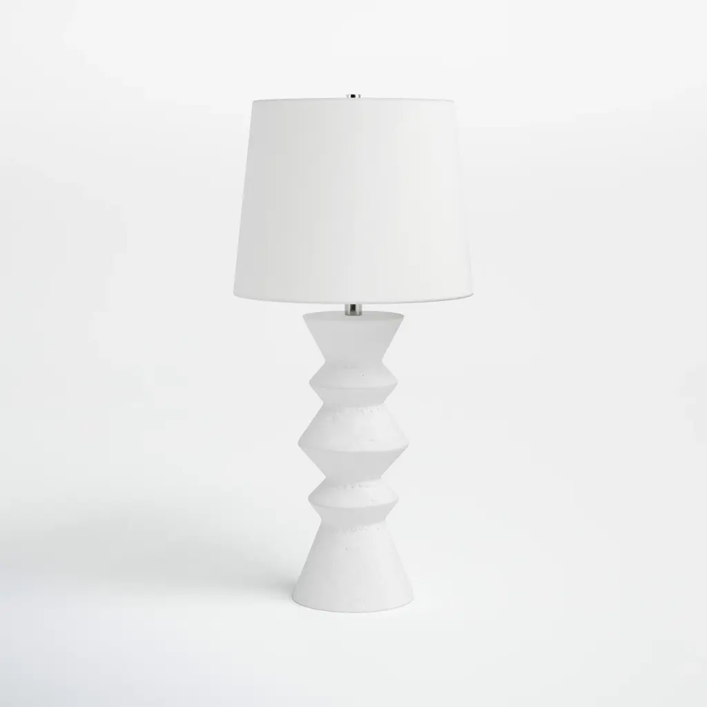 Designed by David Aguirre, notched floor lamp is finished in matte white plaster, lending rich texture and an artisanal feel. A crisp linen drum shade on top casts soft, ambient light. CB2 exclusive.