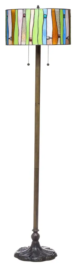 This gorgeous Contemporary Tiffany style Floor Lamp has been handcrafted in bright hues of blue, green and yellow to accent any modern home decor. Jeweled cabochons on a drum shade give this stained glass lamp a spectacular look. The shade is complimented with a metal base in bronze finish.Dimensions: 60 in. tall x 16 in. Dia at shadeThe lamp is 58" tall and 16" widthEasy to use 2 pull chains for on/off lighting. Uses two 60-Watt bulbs and can use CFL or LED bulbs. Bulbs not included. UL listed.