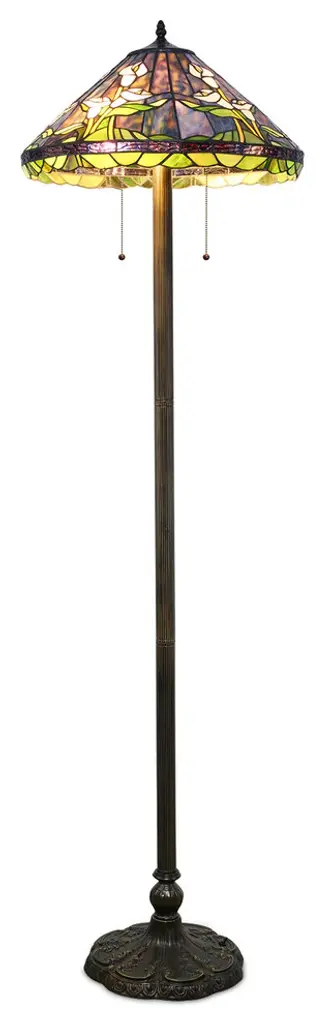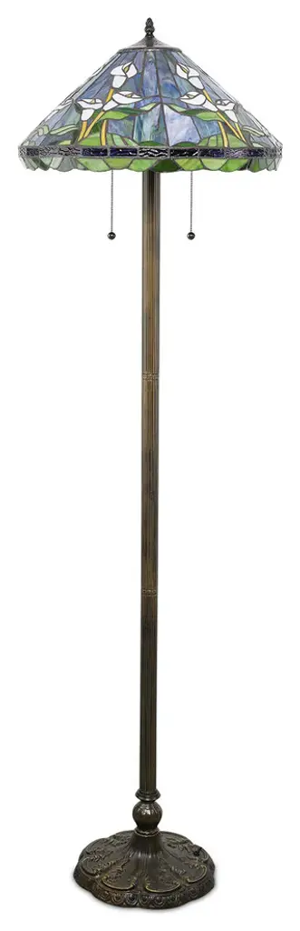 The Calla Lilly Floor Lamp has been handcrafted using methods first developed by Louis Comfort Tiffany in the early 1900s. The shade is made of hand-cut pieces of stained glass, each wrapped in fine copper foil. Unique calla lily inspired lighting will bring the elegance of nature to your home decor with its beautiful vibrant colors.Ornate bronze metal base provides design and stabilityThe lamp is 58" tall and 18" widthEasy to use 2 pull chains for on/off lighting. Uses two 60-Watt bulbs and can use CFL or LED bulbs. Bulbs not included. UL listed.