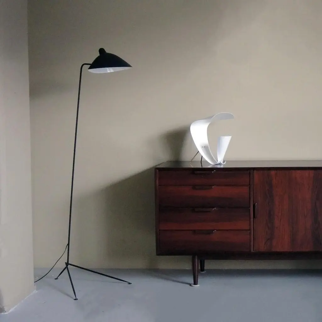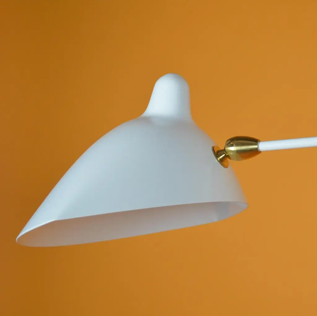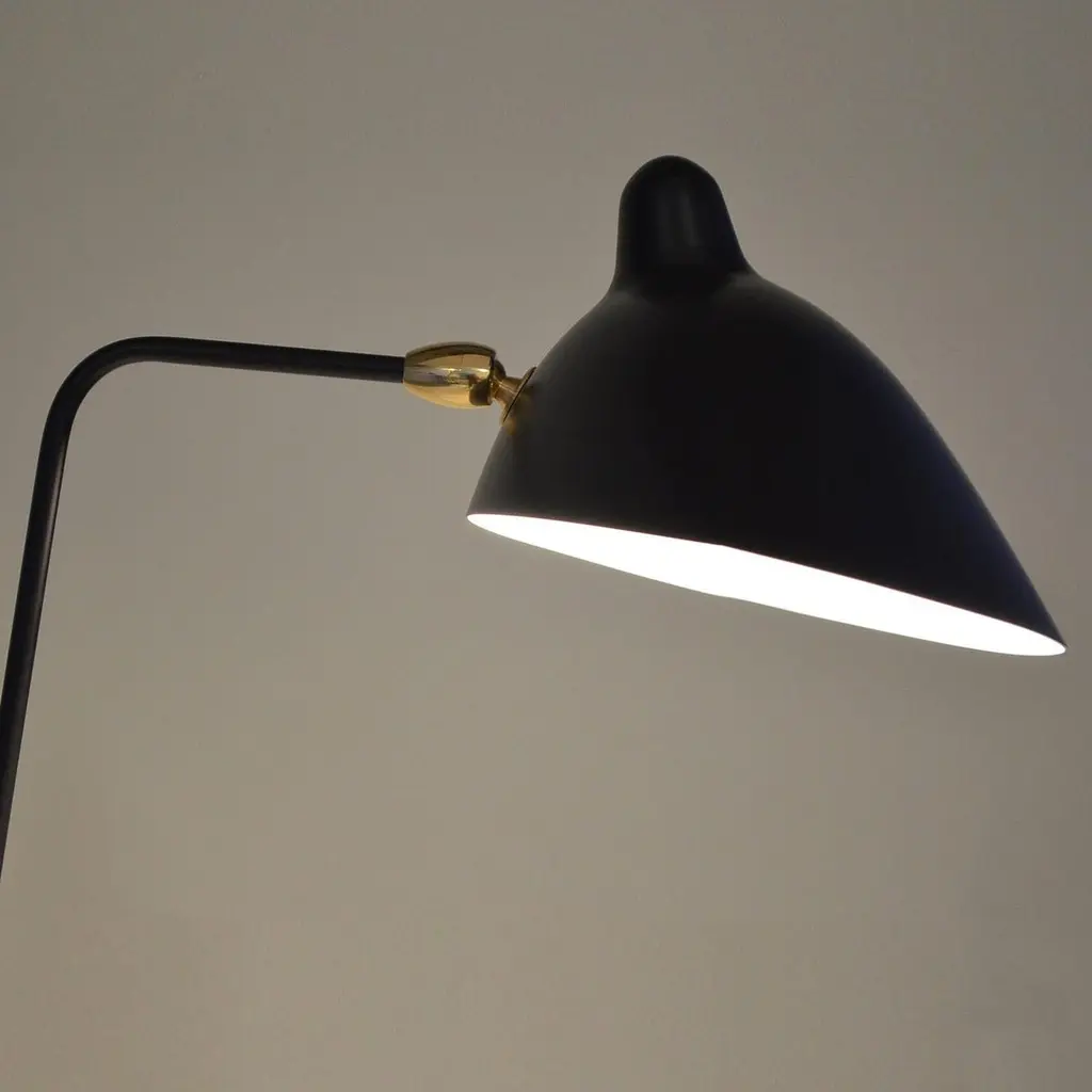Description:Clean, simple lines describe the elegance of this Serge Mouille floor lamp. A long, slender arm supported by a tapered triangular base allows the swiveling shade to illuminate at any angle.Measures: 18"w x 21½d x 63"hFeatures:The elegance redifined. Shade rotate and swivelCustomization:No Customization possible on this model.Switch Options:This model features a foot switchWHAT SETS US APART? - Technical expertise - Full line of products - Availability - Customization - 5-year guarantee - Secured shipment - Small Repairs - After-sale service - Experience (we introduced these lamps to the US 23 years ago).WHAT TO LOOK OUT FOR:- No expensive international shipping, - No Customs fee- No deadlineUpon arrival, all lamps were thoroughly inspected with our 44 checkpoints, which gives us the confidence to offer a 5-year guarantee to our clients.