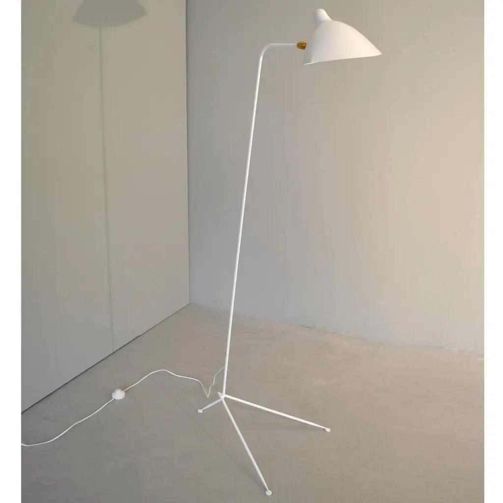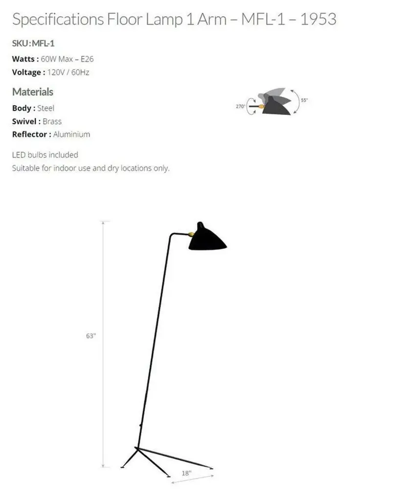 Description:Clean, simple lines describe the elegance of this Serge Mouille floor lamp. A long, slender arm supported by a tapered triangular base allows the swiveling shade to illuminate at any angle.Measures: 18"w x 21½d x 63"hColor Option:Available in black or whiteFeatures:The elegance redifined. Shade rotate and swivelCustomization:No Customization possible on this model.Switch Options:This model features a foot switchWHAT SETS US APART? - Technical expertise - Full line of products - Availability - Customization - 5-year guarantee - Secured shipment - Small Repairs - After-sale service - Experience (we introduced these lamps to the US 23 years ago).WHAT TO LOOK OUT FOR:- No expensive international shipping, - No Customs fee- No deadlineUpon arrival, all lamps were thoroughly inspected with our 44 checkpoints, which gives us the confidence to offer a 5-year guarantee to our clients.