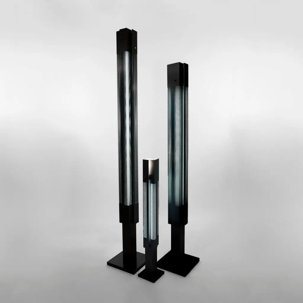 Set of floor lamp model 'Signal Column Lamp' designed by Serge Mouille in 1962.Manufactured by Editions Serge Mouille in France. The production of lamps, wall lights and floor lamps are manufactured using craftsman’s techniques with the same materials and techniques as the first models.Each lamp has a personal serial number and a specific certificate of authenticity when delivered. Materials and color:Anodized and brushed aluminum, black color.This models are also available in aluminum color.Dimensions small Model:H 42.51 in. x W 7.08 in. x D 7.08 in.H 108 cm x W 18 cm x D 18 cmDimensions medium Model:H 75.59 in. x W 12.99 in. x D 12.99 in.H 192 cm x W 33cm x D 33 cmDimensions large Model:H 86.61 in. x W 12.99 in. x D 12.99 in.H 220 cm x W 33cm x D 33 cmTechnical details:CE : bulb 70W max - E27 - fluorescent tube 65W max - 230V - 50HzUS : bulb 60W max - E26 - fluorescent tube 65W max - 120V - 60HzIndoor use and dry locations only.Serge Mouille (24 December 1922-1988) was a French Industrial designer and goldsmith. He is best known for his light fixture designs. After having worked a few years in the workshop of Gabriel Lacroix, he opened his own workshop in 1945 with the intention of creating silverware utensils.In 1953 he began researching and designing light fixtures. During this period he was also supervising the gold smithing department at l'École des Arts Appliqués. In 1955 he was inducted into the Société des Artistes Décorateurs ("the Interior Decorators' Society").The following year, Steph Simon opened a design gallery at 145 Bd St Germain in Paris. Displaying the work of Charlotte Perriand and Jean Prouvé, the gallery soon also featured the work of Serge Mouille, Isamu Noguchi and Jean Luce. The designs of these artists soon become more widely known thanks to orders placed by institutions such as, Cité universitaire d’Antony, University of Strasbourg, University of Aix-Marseille and Centre d’essais en vol de Brétigny. Serge Mouille suffered from tuberculosis for many years and in 1959 he was forced to suspend his design activities and undergo treatment. In 1961, thanks to the Société de Création des Modèles, he was able to exhibit his latest light fixture designs at the trade show Salon des arts ménagers. These designs combined the concepts of fluorescence and incandescence. Production of his light fixtures stopped definitively in 1961.Serge Mouille remains famous primarily for his Minimalistic designs and use of uniformly black painted metal materials. His wall-mounted spot light fixture with articulated arms is typical for his discrete, yet highly functional designs.