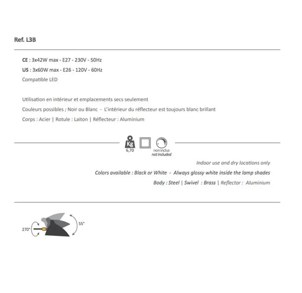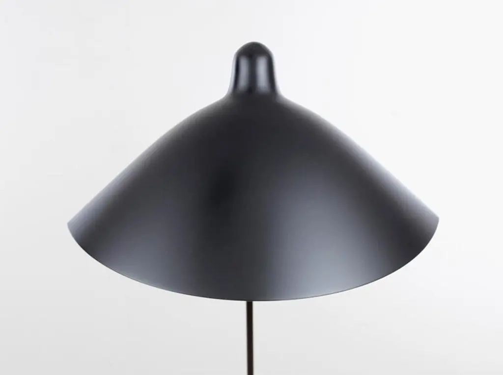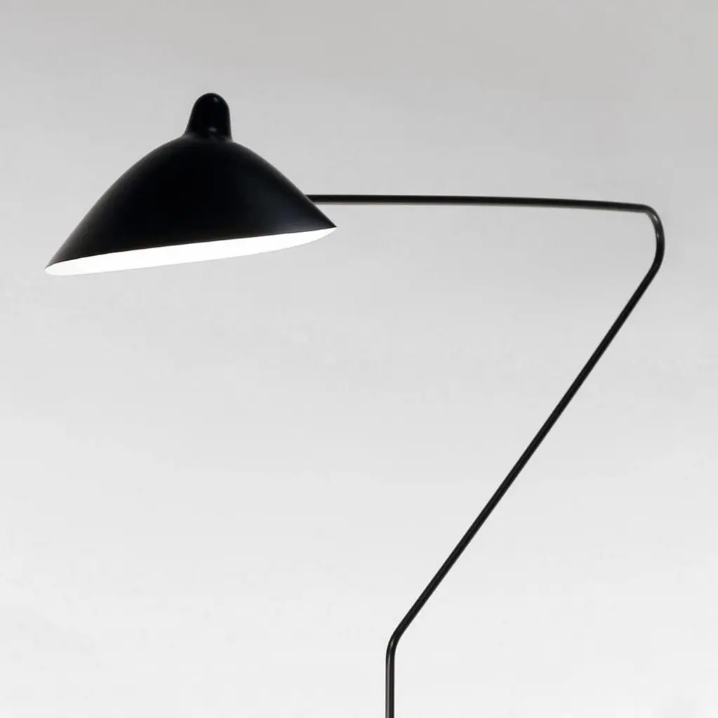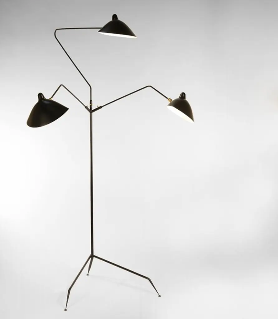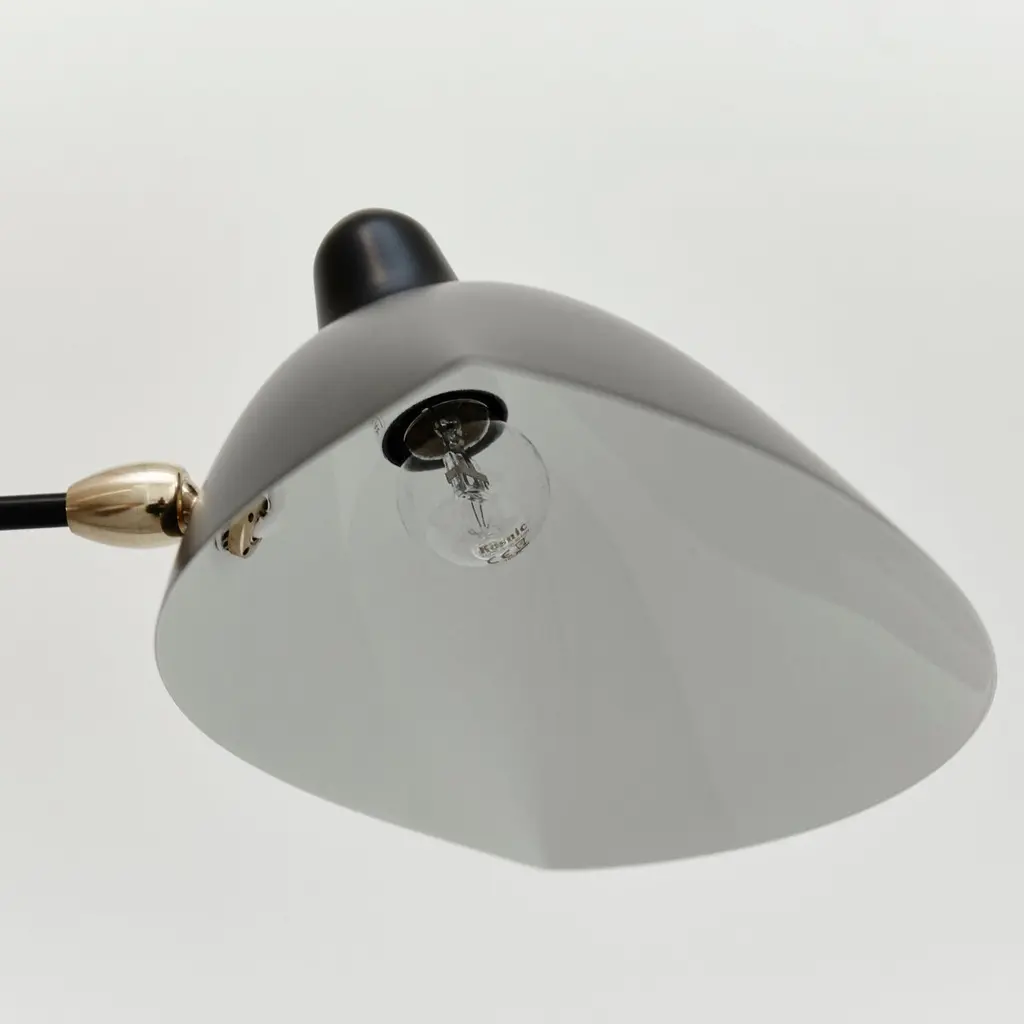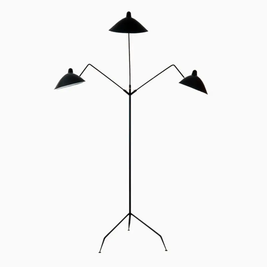 Floor lamp model 'Three Rotating Arms Floor Lamp' designed by Serge Mouille in 1952.Manufactured by Editions Serge Mouille in France. The production of lamps, wall lights and floor lamps are manufactured using craftsman’s techniques with the same materials and techniques as the first models.Materials and color:Body: Steel swivel: Brass reflector: AluminiumBlack lacquered - always glossy white inside the lamp shadesThis model is also available in white.Dimensions:H 82.68 in. x W 53.15 in. x D 57.09 in.H 210 cm x W 135 cm x D 145 cmTechnical details:CE: 3x42W max - E27 - 230V - 50HzUS: 3x60W max - E26 - 120V - 60HzIndoor use and dry locations only.Serge Mouille (24 December 1922-1988) was a French Industrial designer and goldsmith. He is best known for his light fixture designs. After having worked a few years in the workshop of Gabriel Lacroix, he opened his own workshop in 1945 with the intention of creating silverware utensils.In 1953 he began researching and designing light fixtures. During this period he was also supervising the gold smithing department at l'École des Arts Appliqués. In 1955 he was inducted into the Société des Artistes Décorateurs ("the Interior Decorators' Society").The following year, Steph Simon opened a design gallery at 145 Bd St Germain in Paris. Displaying the work of Charlotte Perriand and Jean Prouvé, the gallery soon also featured the work of Serge Mouille, Isamu Noguchi and Jean Luce. The designs of these artists soon become more widely known thanks to orders placed by institutions such as, Cité universitaire d’Antony, University of Strasbourg, University of Aix-Marseille and Centre d’essais en vol de Brétigny. Serge Mouille suffered from tuberculosis for many years and in 1959 he was forced to suspend his design activities and undergo treatment. In 1961, thanks to the Société de Création des Modèles, he was able to exhibit his latest light fixture designs at the trade show Salon des arts ménagers. These designs combined the concepts of fluorescence and incandescence. Production of his light fixtures stopped definitively in 1961.Serge Mouille remains famous primarily for his Minimalistic designs and use of uniformly black painted metal materials. His wall-mounted spot light fixture with articulated arms is typical for his discrete, yet highly functional designs.