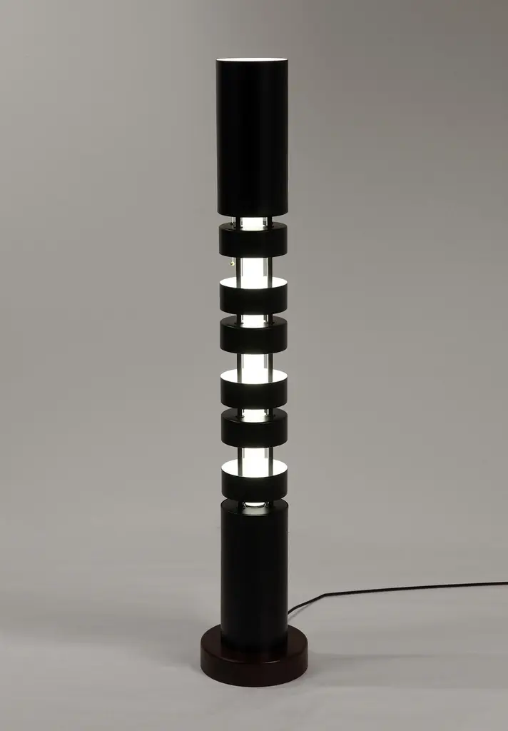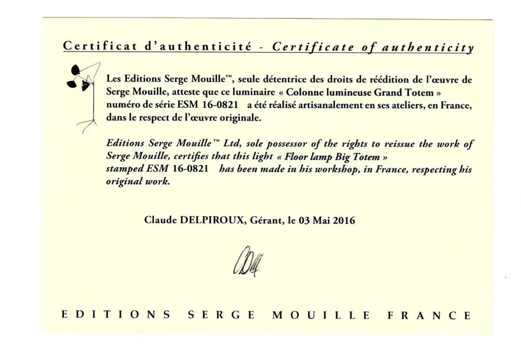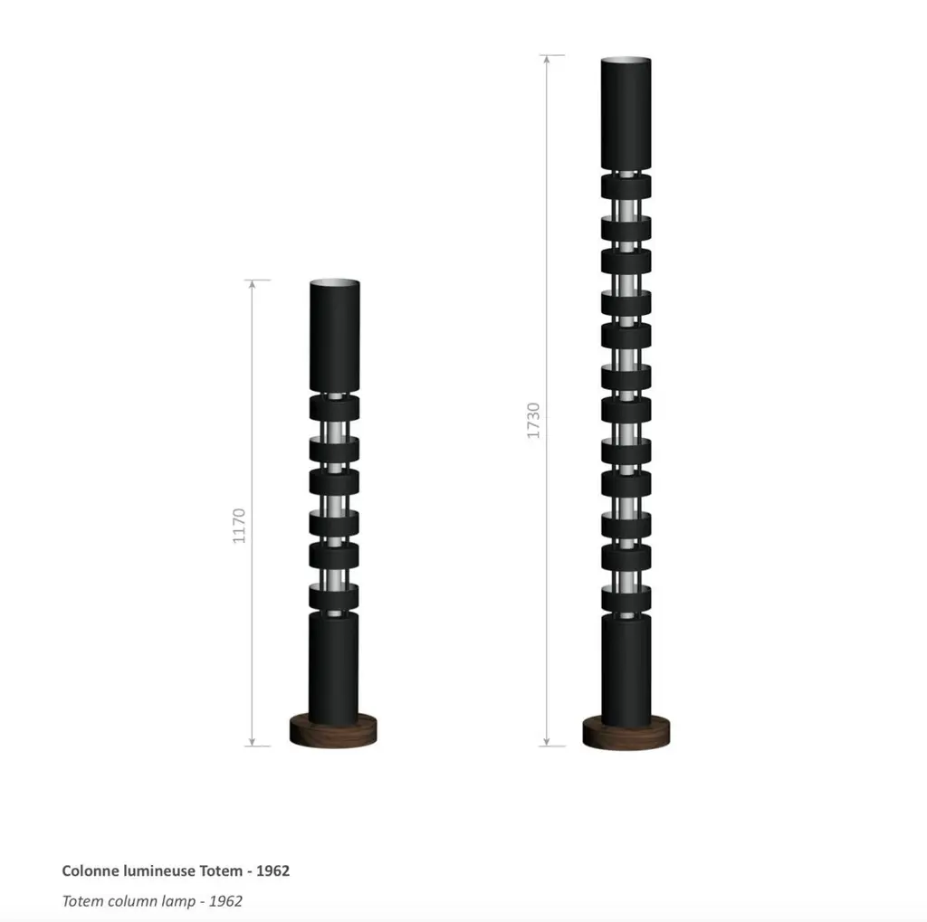 Floor lamp model 'Small Totem Column Lamp' designed by Serge Mouille in 1962.Manufactured by Editions Serge Mouille in France. The production of lamps, wall lights and floor lamps are manufactured using craftsman’s techniques with the same materials and techniques as the first models.Each lamp has a personal serial number and a specific certificate of authenticity when delivered. Materials and color:Anodized and brushed aluminum: black color.This model is also available in aluminum.Current production delay is aprox. 34 weeks.Dimensions:H 117 cm x Dm 8 cmTechnical details:CE: bulb 70W max - E27 - fluorescent tube 65W max - 230V - 50HzUS: bulb 60W max - E26 - fluorescent tube 65W max - 120V - 60HzIndoor use and dry locations only.Serge Mouille (24 December 1922-1988) was a French Industrial designer and goldsmith. He is best known for his light fixture designs. After having worked a few years in the workshop of Gabriel Lacroix, he opened his own workshop in 1945 with the intention of creating silverware utensils.In 1953 he began researching and designing light fixtures. During this period he was also supervising the gold smithing department at l'École des Arts Appliqués. In 1955 he was inducted into the Société des Artistes Décorateurs ("the Interior Decorators' Society").The following year, Steph Simon opened a design gallery at 145 Bd St Germain in Paris. Displaying the work of Charlotte Perriand and Jean Prouvé, the gallery soon also featured the work of Serge Mouille, Isamu Noguchi and Jean Luce. The designs of these artists soon become more widely known thanks to orders placed by institutions such as, Cité universitaire d’Antony, University of Strasbourg, University of Aix-Marseille and Centre d’essais en vol de Brétigny. Serge Mouille suffered from tuberculosis for many years and in 1959 he was forced to suspend his design activities and undergo treatment. In 1961, thanks to the Société de Création des Modèles, he was able to exhibit his latest light fixture designs at the trade show Salon des arts ménagers. These designs combined the concepts of fluorescence and incandescence.Production of his light fixtures stopped definitively in 1961.Serge Mouille remains famous primarily for his Minimalistic designs and use of uniformly black painted metal materials. His wall-mounted spot light fixture with articulated arms is typical for his discrete, yet highly functional designs.
