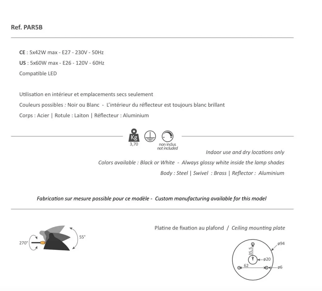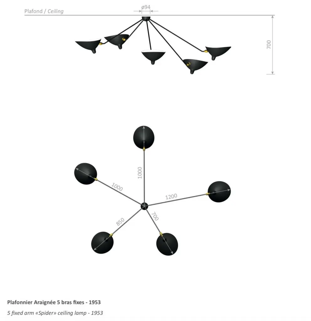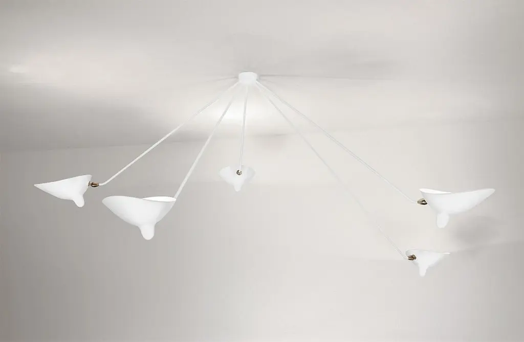 Ceiling wall lamp model 'five fixed arms spider ceiling lamp' designed by Serge Mouille in 1953.Manufactured by Editions Serge Mouille in France. The production of lamps, wall lights and floor lamps are manufactured using craftsman’s techniques with the same materials and techniques as the first models.Each lamp has a personal serial number and a specific "certificate of authenticity" when delivered. Materials and color:body : steel swivel : brass reflector : aluminiumwhite lacquered - always glossy white inside the lamp shades.The picture is a digital preview, colors may vary.This model is also available in black.Dimensions:H 27.56 in. x D m 86.62 in.H 70 cm x D m 220 cm.Technical details:CE : 5x42W max - E27 - 230V - 50HzUS : 5x60W max - E26 - 120V - 60HzIndoor use and dry locations only.Serge Mouille (24 December 1922-1988) was a French Industrial designer and goldsmith. He is best known for his light fixture designs. After having worked a few years in the workshop of Gabriel Lacroix, he opened his own workshop in 1945 with the intention of creating silverware utensils.In 1953 he began researching and designing light fixtures. During this period he was also supervising the gold smithing department at l'École des Arts Appliqués. In 1955 he was inducted into the Société des Artistes Décorateurs ("the Interior Decorators' Society").The following year, Steph Simon opened a design gallery at 145 Bd St Germain in Paris. Displaying the work of Charlotte Perriand and Jean Prouvé, the gallery soon also featured the work of Serge Mouille, Isamu Noguchi and Jean Luce. The designs of these artists soon become more widely known thanks to orders placed by institutions such as, Cité universitaire d’Antony, University of Strasbourg, University of Aix-Marseille and Centre d’essais en vol de Brétigny. Serge Mouille suffered from tuberculosis for many years and in 1959 he was forced to suspend his design activities and undergo treatment. In 1961, thanks to the Société de Création des Modèles, he was able to exhibit his latest light fixture designs at the trade show Salon des arts ménagers. These designs combined the concepts of fluorescence and incandescence. Production of his light fixtures stopped definitively in 1961.Serge Mouille remains famous primarily for his Minimalistic designs and use of uniformly black painted metal materials. His wall-mounted spot light fixture with articulated arms is typical for his discrete, yet highly functional designs.