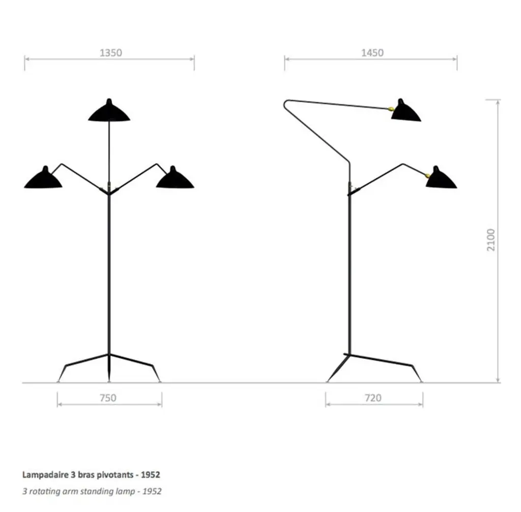Floor lamp model 'Three Rotating Arms Floor Lamp' designed by Serge Mouille in 1952.Manufactured by Editions Serge Mouille in France. The production of lamps, wall lights and floor lamps are manufactured using craftsman’s techniques with the same materials and techniques as the first models.Each lamp has a personal serial number and a specific certificate of authenticity when delivered. Materials and color:Body : Steel swivel : Brass reflector : AluminiumWhite lacquered - Always glossy white inside the lamp shadesThe picture is a digital preview, colors may vary.This model is also available in black.Dimensions:H 82.68 in. x W 53.15 in. x D 57.09 in.H 210 cm x W 135 cm x D 145 cmTechnical details:CE: 3x42W max - E27 - 230V - 50HzUS: 3x60W max - E26 - 120V - 60HzIndoor use and dry locations only.Serge Mouille (24 December 1922-1988) was a French Industrial designer and goldsmith. He is best known for his light fixture designs. After having worked a few years in the workshop of Gabriel Lacroix, he opened his own workshop in 1945 with the intention of creating silverware utensils.In 1953 he began researching and designing light fixtures. During this period he was also supervising the gold smithing department at l'École des Arts Appliqués. In 1955 he was inducted into the Société des Artistes Décorateurs ("the Interior Decorators' Society").The following year, Steph Simon opened a design gallery at 145 Bd St Germain in Paris. Displaying the work of Charlotte Perriand and Jean Prouvé, the gallery soon also featured the work of Serge Mouille, Isamu Noguchi and Jean Luce. The designs of these artists soon become more widely known thanks to orders placed by institutions such as, Cité universitaire d’Antony, University of Strasbourg, University of Aix-Marseille and Centre d’essais en vol de Brétigny. Serge Mouille suffered from tuberculosis for many years and in 1959 he was forced to suspend his design activities and undergo treatment. In 1961, thanks to the Société de Création des Modèles, he was able to exhibit his latest light fixture designs at the trade show Salon des arts ménagers. These designs combined the concepts of fluorescence and incandescence.Production of his light fixtures stopped definitively in 1961.Serge Mouille remains famous primarily for his Minimalistic designs and use of uniformly black painted metal materials. His wall-mounted spot light fixture with articulated arms is typical for his discrete, yet highly functional designs.