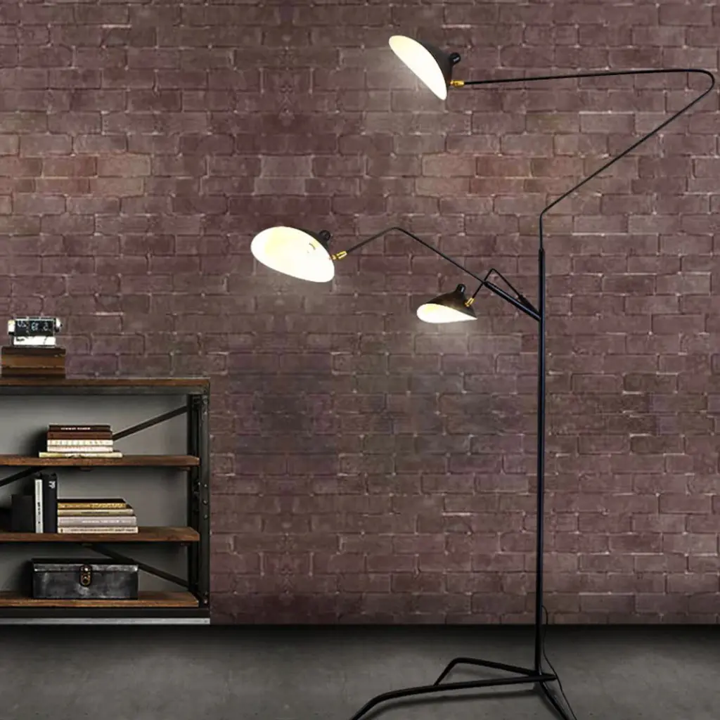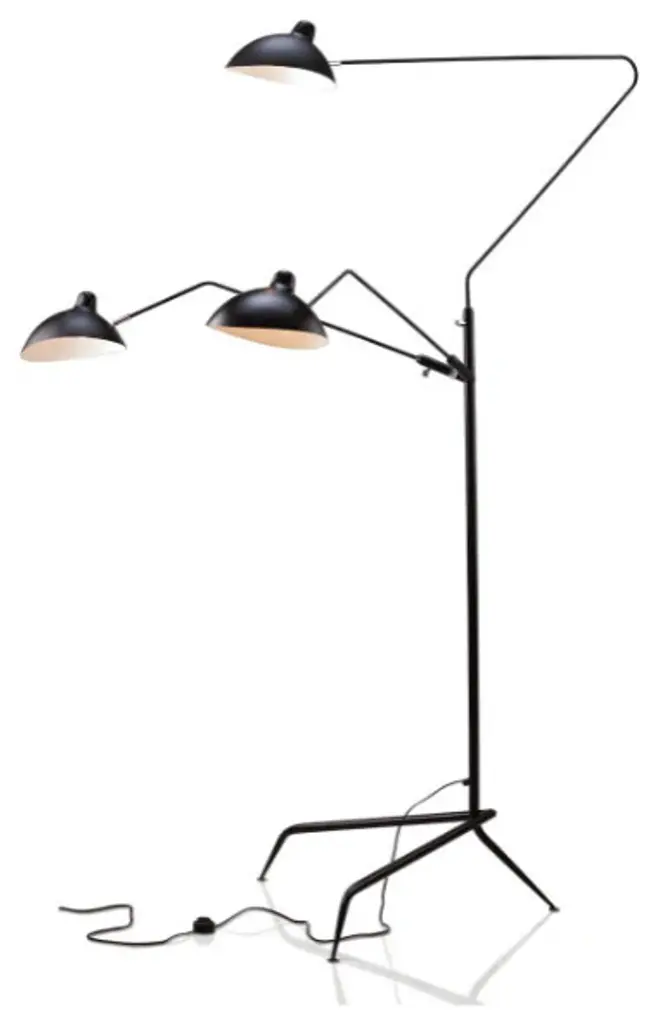 A stunning French icon, the 3 Arm Floor Lamp is the most versatile piece of Mouille''s acclaimed lighting series. Dramatic shapes and angles create a theatrical feel within the room, making this lamp as much a work of art as it is a source of illumination. Consisting of iron arms, stem and tripod base, the main feature of this piece is the aluminium chapeau styled shades. All three arms and shades are spectacularly positioned to target as much space as possible, adding a touch of practicality to a legendary design. The entire piece is coated in a black matte lacquer, with only the interior of the shades finished in white to maximize the bulbs reflective qualities. Designed with the intention of supplying as much light as possible, this standing lamp would be a head turning centerpiece in any room. This is a replica of the original.Dimensions:W 55" x H 83" x D 61"Bulb(s) Included: NNumber of Bulbs: 3Bulb Type: E12Wattage: 60W