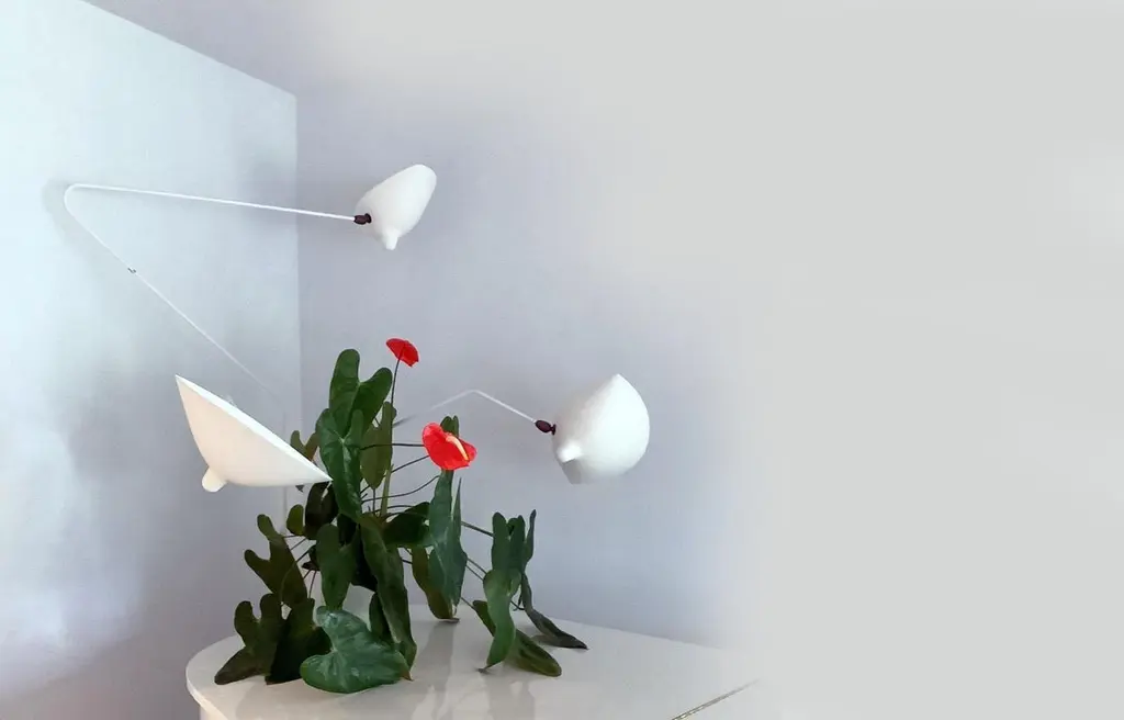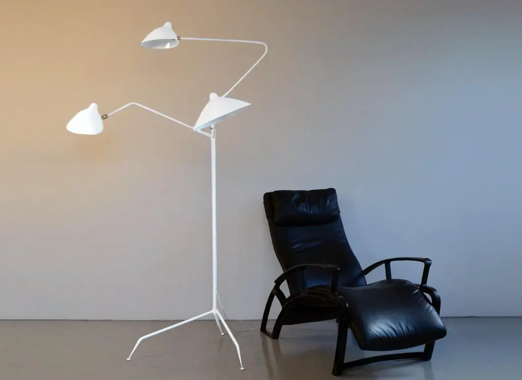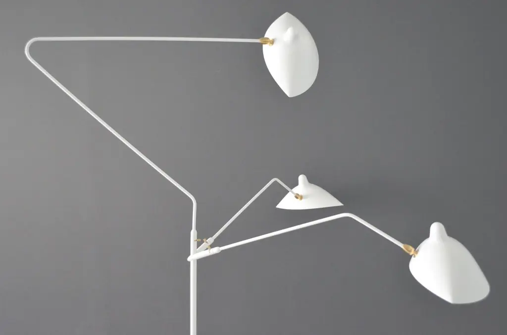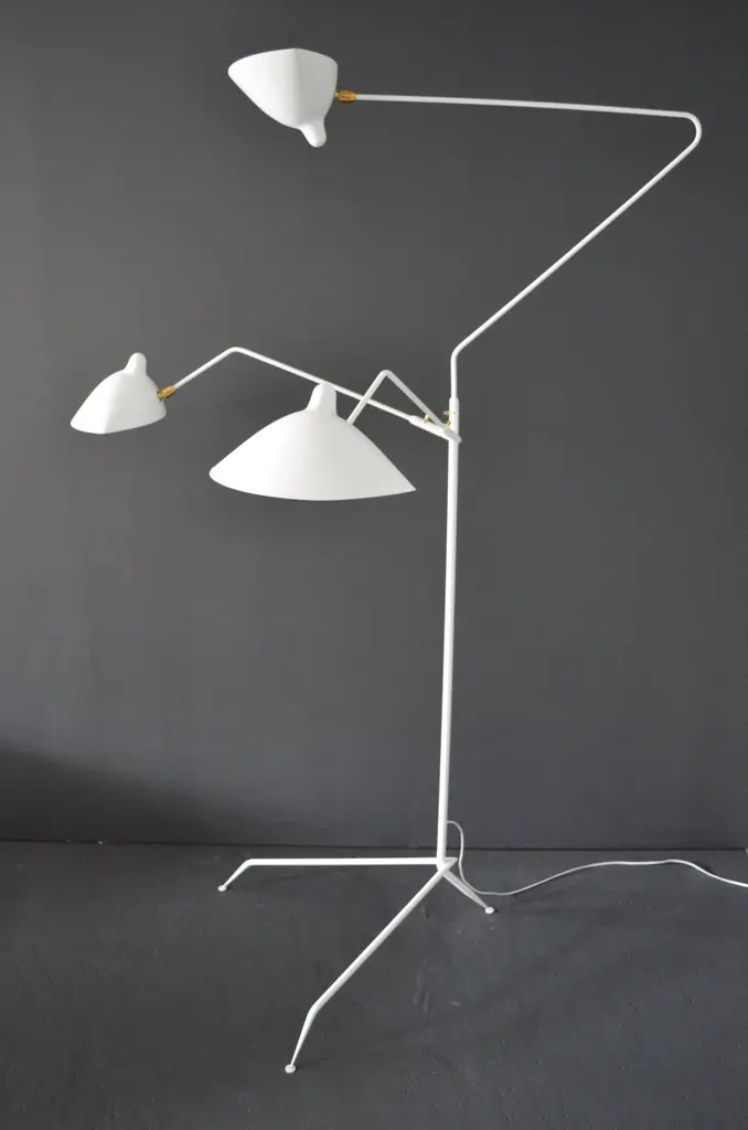 This is the most versatile lamp of the Mouille collection. Each ‘chapeau’ shade can be oriented differently. Sculptural in form with 3 rotating arms, it stands majestically on a tripod base ending with tapered legs. COLOR OPTIONAvailable in Black or WhiteFEATURESSymmetrical per design, most often asymmetrical in everyday usage. This is not only the first lamp Serge Mouille created (1951), but the most versatile lamp of the collection. This is also the first lamp that crossed the Atlantic ocean thanks to Henry Fonda who stubbornly refused to step out of Serge Mouille Ateliers until Mouille caved in and accepted to build one upon Fonda's request.CUSTOMIZATIONNo Customization possible on this model.SWITCH OPTIONSThis model features a foot switchWHAT SETS US APART? - Technical expertise - Full line of products - Availability - Customization - 5-year guarantee - Secured shipment - Small Repairs - After-sale service - Experience (we introduced these lamps to the US 23 years ago).WHAT TO LOOK OUT FOR:- No expensive international shipping, - No Customs fee- No deadlineUpon arrival, all lamps were thoroughly inspected with our 44 checkpoints, which gives us the confidence to offer a 5-year guarantee to our clients.
