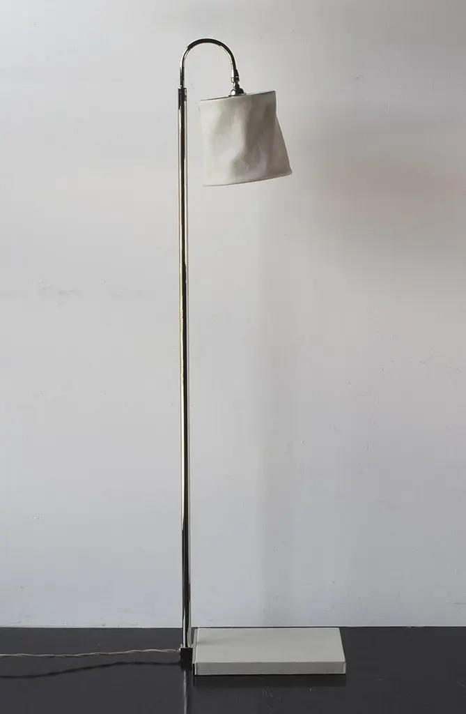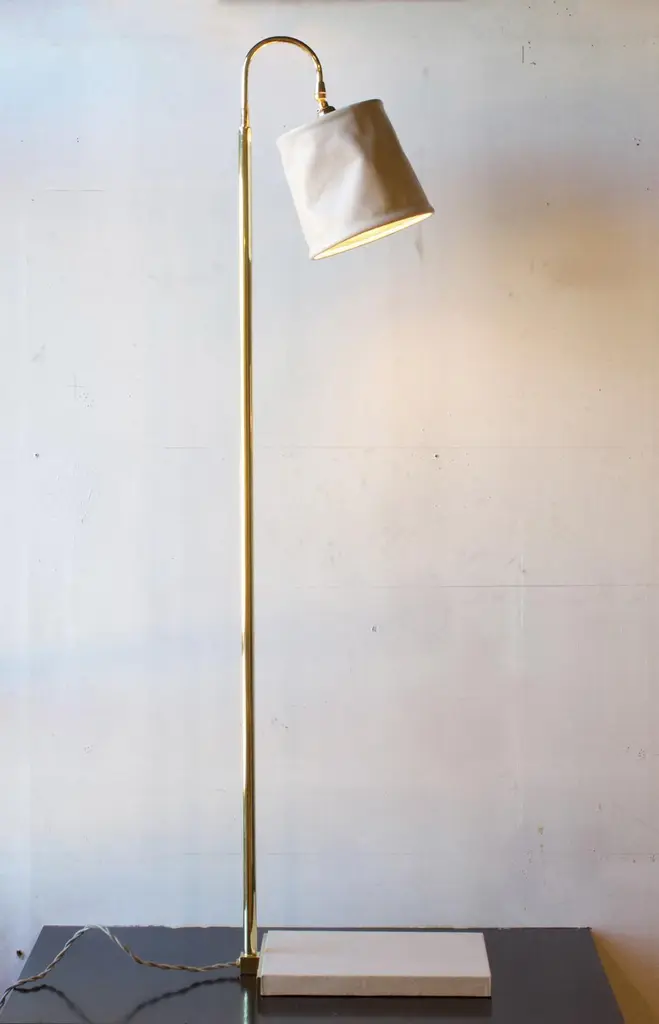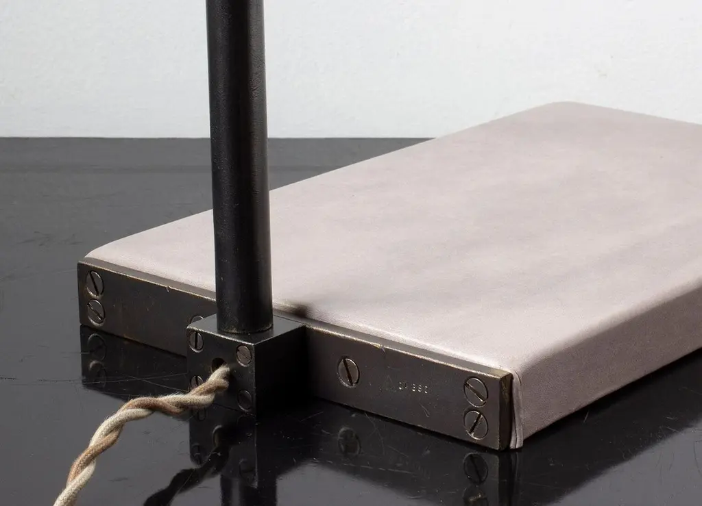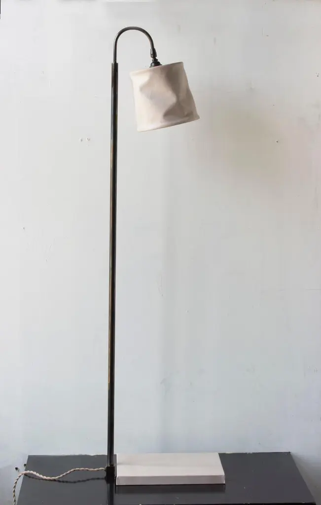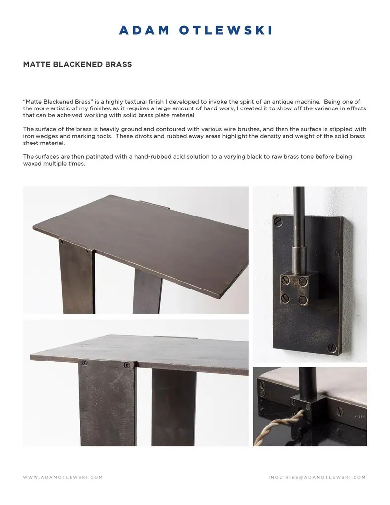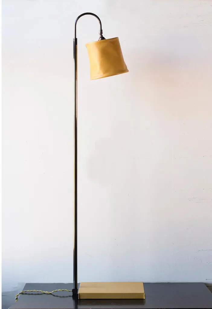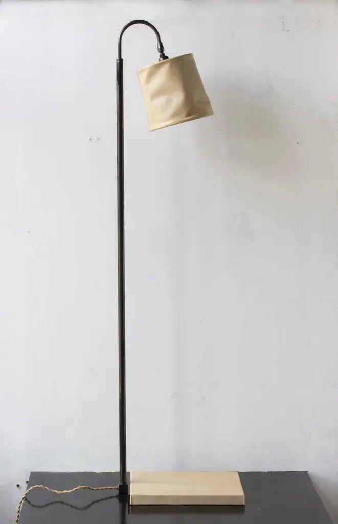 Solid machined brass in Matte Blackened Brass, hand-dyed and waxed leather wrapped wood, soft unstructured pivoting leather shade, hand-dyed braided cotton cord. "Matte Blackened Brass" is a heavily textured, roughened finish with tool markings and edge-wearing to invoke the patina of an antique machine. Please compare the example photos carefully before ordering. All material finishes are living finishes: they will change and patina for the better with time and use. Light does not pass through leather shade; overall effect is a compact ambient lighting that can be directed any way and works well as a reading light next to a chair or sofa.Individually hand assembled and stamped with a unique serial number. Slight variations in color, size and shape are to be expected. Recommended bulb “60 Watt equivalent G18-1/2 White” included, max 60 watt bulb. Overall 19" H x 8-1/4" D x 6" W, Shade diameter 4" x 4" H.Dark patinated brass components can be buffed with a soft dry cloth to rebrighten over time; to regain leather sheen, simply buff by hand with a soft dry cloth (no chemicals or liquids). Never clean lamp with any liquid products or detergents.Provided wired as per North American standards. UL certification available upon request, please enquire regarding modifications and additional fee. Each piece is individually hand-made to order and slotted in frequent production batches; exact lead time is determined once order is placed.Please confirm leather color and brass finish when placing order; price shown for Matte Blackened Brass.