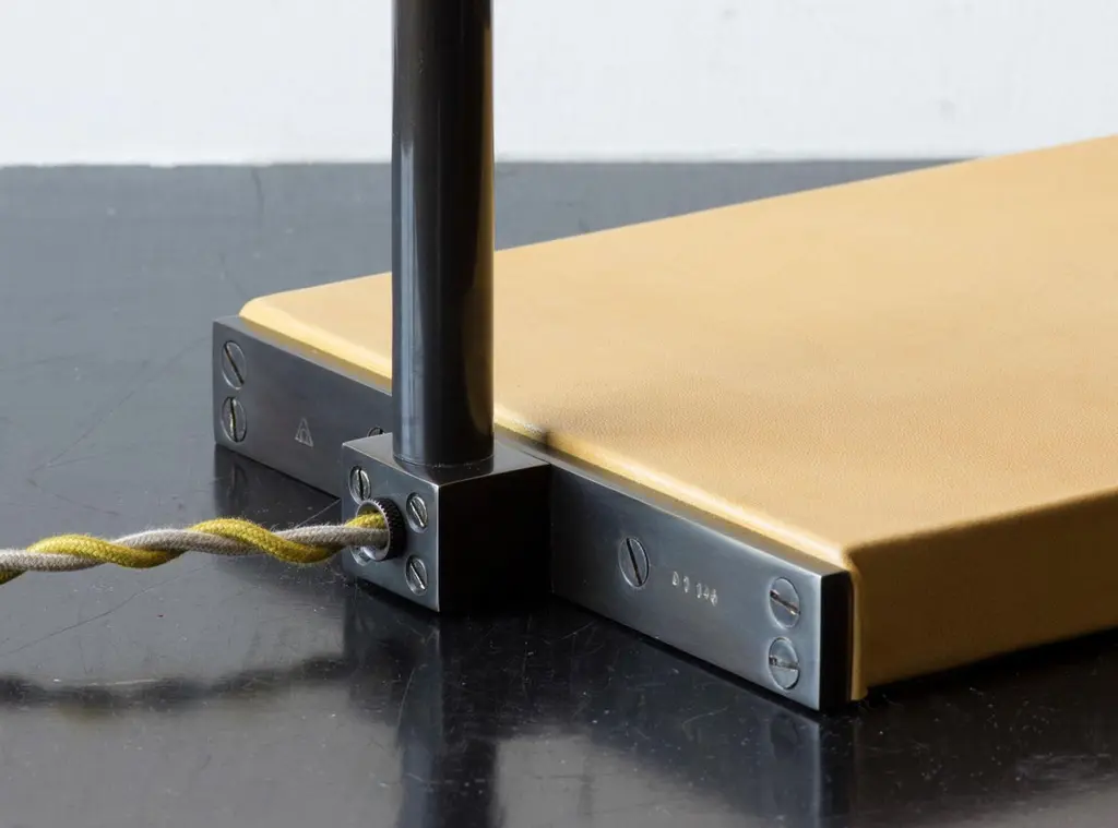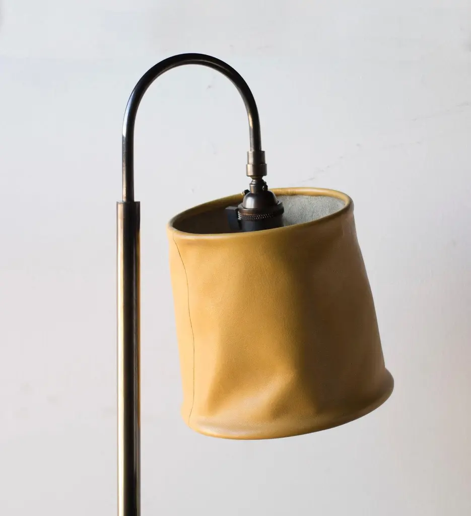 Solid machined brass in dark patinated brass finish, hand-dyed and waxed leather wrapped wood, soft unstructured pivoting leather shade, hand-dyed braided cotton cord. All material finishes are living finishes: they will change and patina for the better with time and use. Light does not pass through leather shade; overall effect is a compact ambient lighting that can be directed any way and works well as a reading light next to a chair or sofa.Individually hand assembled and stamped with a unique serial number. Slight variations in color, size and shape are to be expected. Recommended bulb “60 Watt equivalent G18-1/2 White” included, max 60 watt bulb. Measures: Overall 19"H x 8-1/4"D x 6"W, shade diameter 4" x 4" height.Dark patinated brass components can be buffed with a soft dry cloth to rebrighten over time; to regain leather sheen, simply buff by hand with a soft dry cloth (no chemicals or liquids) . Never clean lamp with any liquid products or detergents.Provided wired as per North American standards. UL certification available upon request. Each piece is individually hand-made to order and slotted in frequent production batches; exact lead time is determined once order is placed.Please confirm leather color and brass finish when placing order; price shown for dark patinated brass.