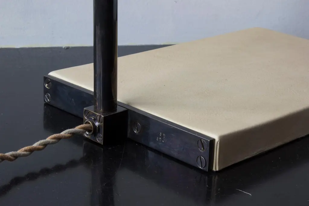 Solid machined brass in dark patinated brass finish, hand-dyed and waxed leather wrapped wood, soft unstructured pivoting leather shade, hand-dyed braided cotton cord. All material finishes are living finishes: they will change and patina for the better with time and use. Light does not pass through leather shade; overall effect is a compact ambient lighting that can be directed any way and works well as a reading light next to a chair or sofa.Individually hand assembled and stamped with a unique serial number. Slight variations in color, size and shape are to be expected. Recommended bulb “60 Watt equivalent G18-1/2 White” included, max 60 watt bulb. Overall 19"H x 8-1/4"D x 6"W, shade diameter 4" x 4" height.Dark patinated brass components can be buffed with a soft dry cloth to rebrighten over time; to regain leather sheen, simply buff by hand with a soft dry cloth (no chemicals or liquids) . Never clean lamp with any liquid products or detergents.Provided wired as per North American standards. UL certification available upon request. Each piece is individually hand-made to order and slotted in frequent production batches; exact lead time is determined once order is placed.Please confirm leather color and brass finish when placing order; price shown for dark patinated brass.