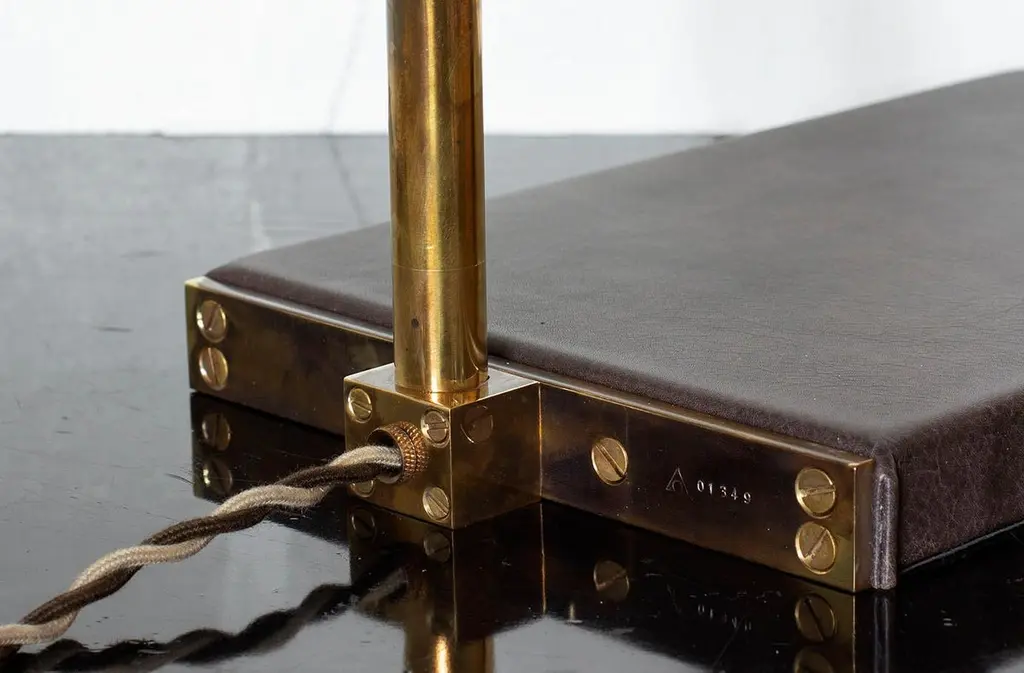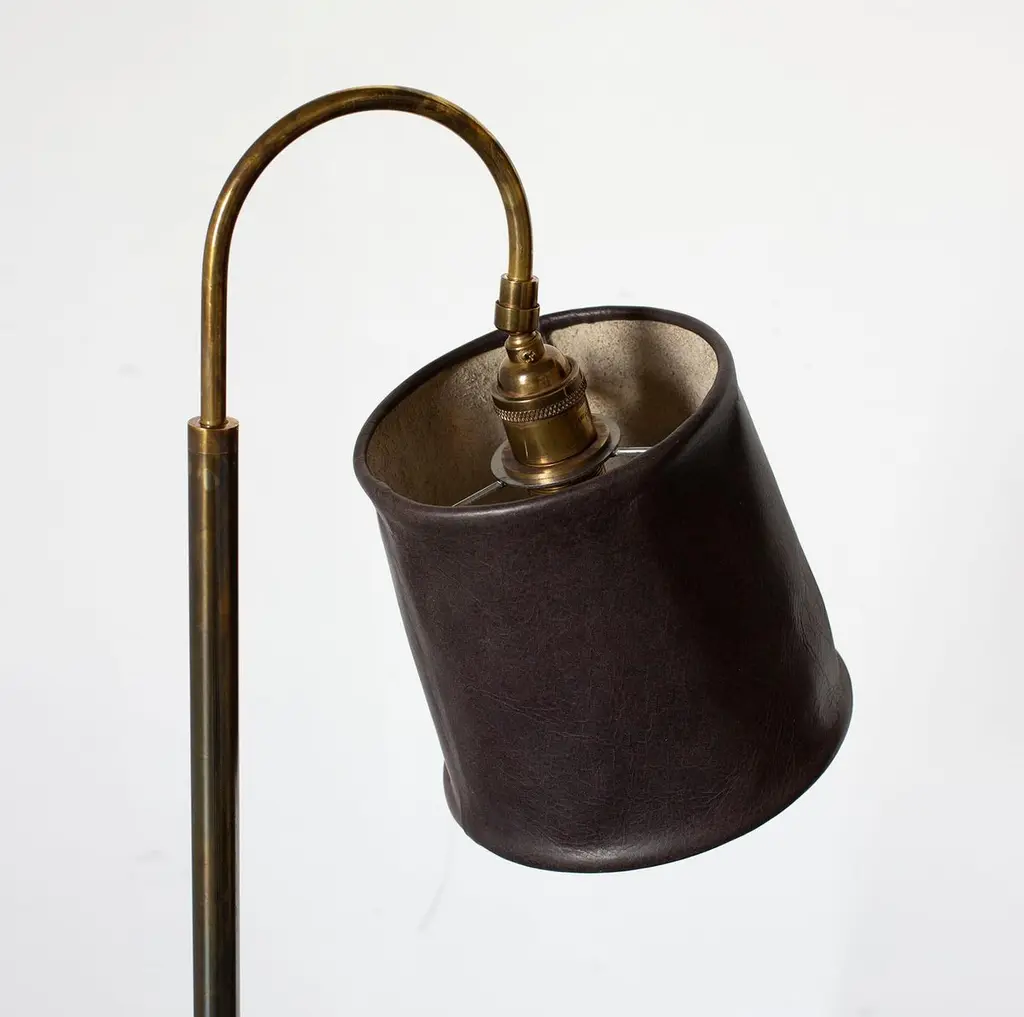 Solid machined brass in "Smoke" acid patinated finish, hand-dyed and waxed leather wrapped wood, soft unstructured pivoting leather shade, hand-dyed braided cotton cord. All material finishes are living finishes: they will change and patina for the better with time and use. Light does not pass through leather shade; overall effect is a compact ambient lighting that can be directed any way and works well as a reading light next to a chair or sofa.Individually hand assembled and stamped with a unique serial number. Slight variations in color, size and shape are to be expected. Recommended bulb “60 Watt equivalent G18-1/2 White” included, max 60 watt bulb. Measures: Overall 19" H x 8-1/4" D x 6" W, shade diameter 4" x 4" height."Smoke" acid patinated brass components can be buffed with a soft dry cloth to rebrighten over time; to regain leather sheen, simply buff by hand with a soft dry cloth (no chemicals or liquids). Never clean lamp with any liquid products or detergents.Provided wired as per North American standards. UL certification available upon request. Each piece is individually hand-made to order and slotted in frequent production batches; exact lead time is determined once order is placed.Please confirm leather color and brass finish when placing order, price shown for "Smoke" acid patinated brass.