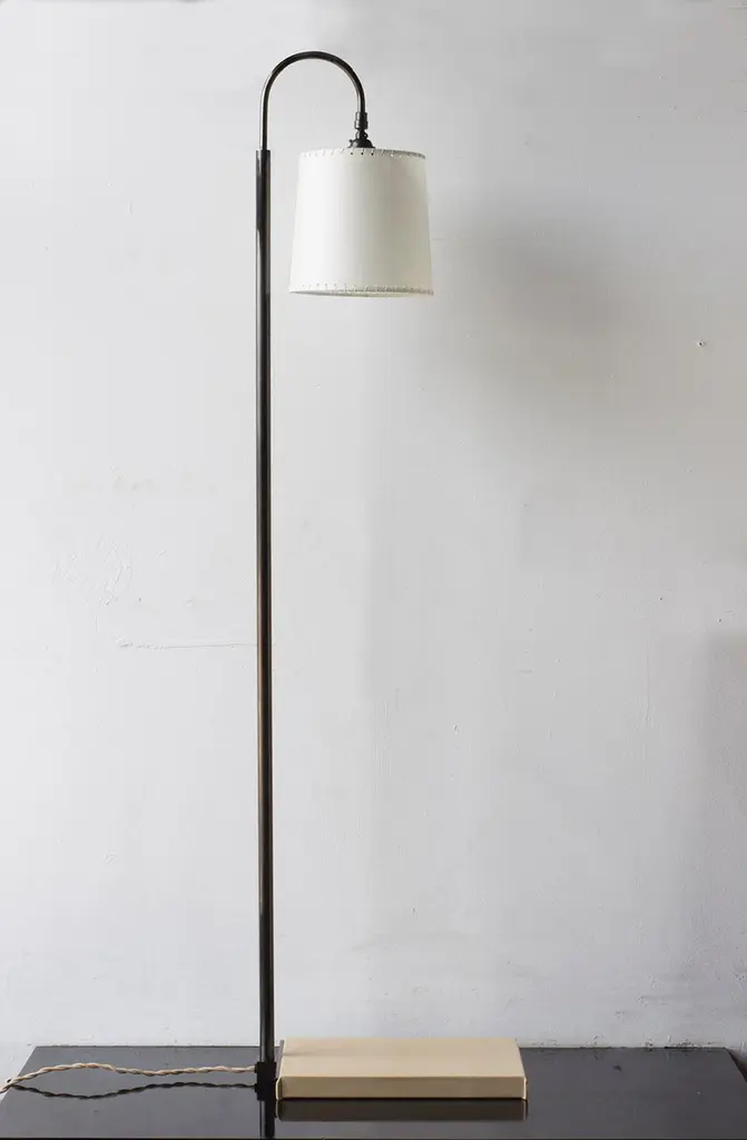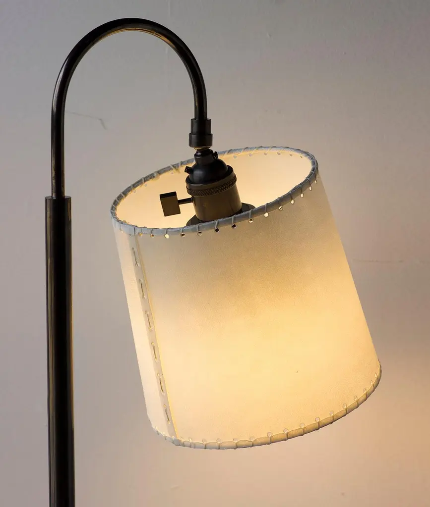 Solid machined brass in dark patinated brass finish, hand-dyed and waxed leather wrapped wood, goatskin parchment pivoting shade with hand stitched edge, hand-dyed braided cotton cord, putty leather wrapped base. All material finishes are living finishes: they will change and patina for the better with time and use. Shades are made from genuine goatskin parchment, hand-selected for each lamp for its natural texture, pattern and color. Reminiscent of the lunar surface, its superior quality of light is unlike paper of any kind. Variations in pattern and texture are the be expected as each skin is unique. Shade construction is unlined, utilizing a single layer of parchment for optimal light transmission and may have a slight bow or curvature of the surface. This is a natural characteristic of the grain of the animal hide as well as the hand stretching and tanning process.Individually hand assembled and stamped with a unique serial number. Slight variations in color, size and shape are to be expected. Recommended bulb “60 Watt equivalent G18-1/2 White” included, max 60 watt bulb. Measures: Overall 51" H x 13-1/4" D x 8" W, Shade diameter 7" x 7" H.Dark patinated brass components can be buffed with a soft dry cloth to rebrighten over time; to regain leather sheen, simply buff by hand with a soft dry cloth (no chemicals or liquids) . Never clean lamp with any liquid products or detergents.Provided wired as per North American standards. UL certification available upon request, please enquire regarding modifications and additional fee. Each piece is individually hand-made to order and slotted in frequent production batches; exact lead time is determined once order is placed.Please confirm leather color and brass finish when placing order; price shown for dark patinated brass.