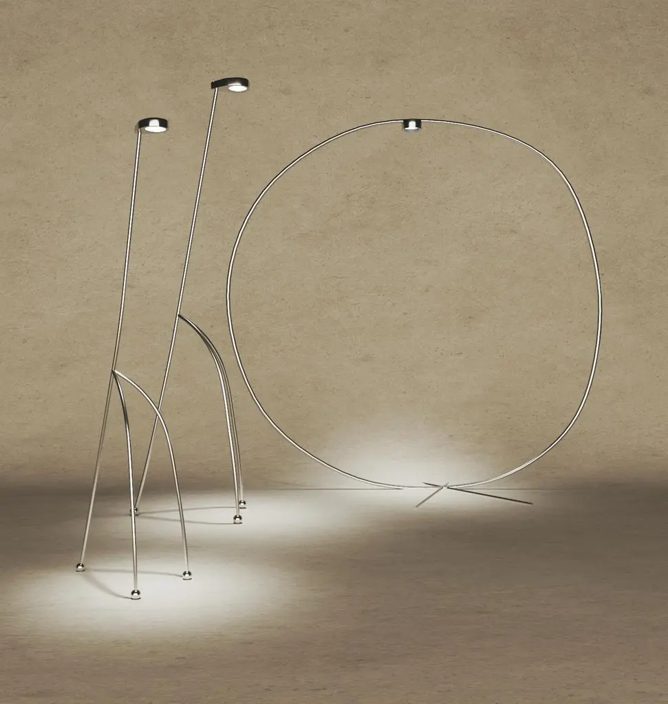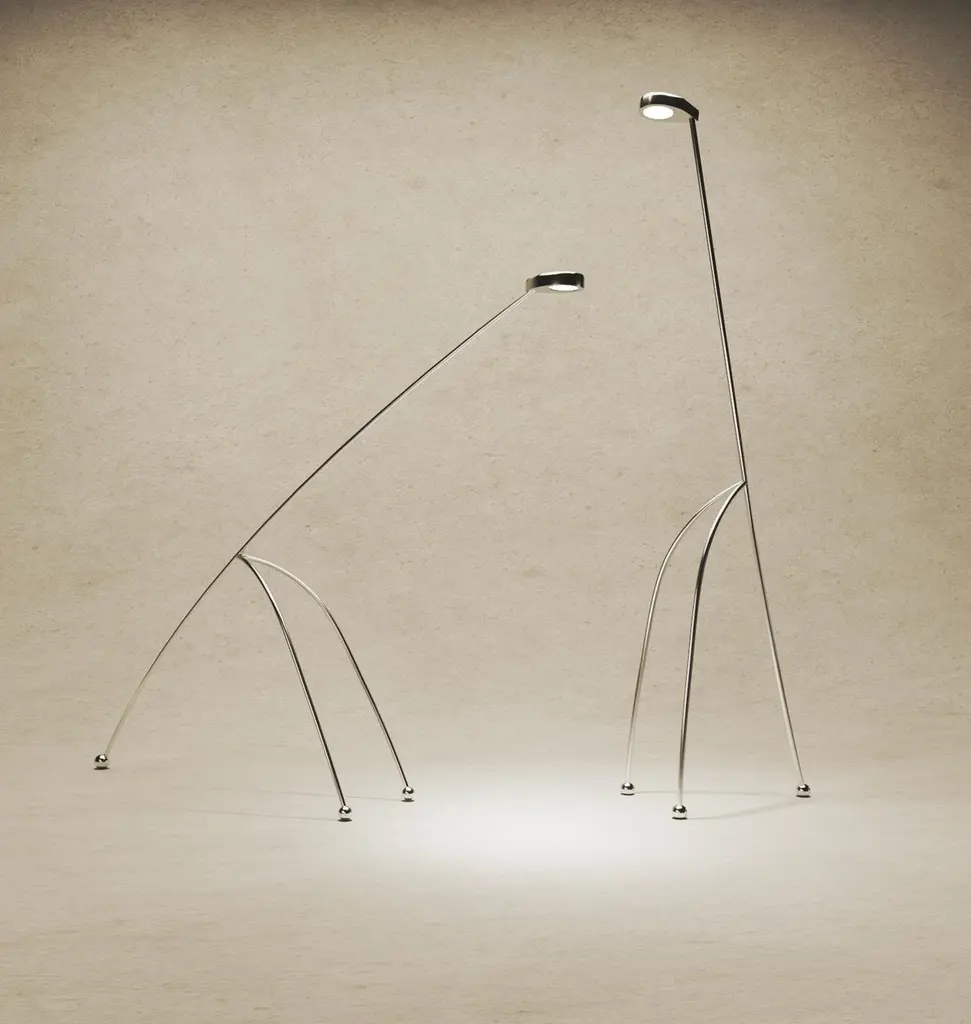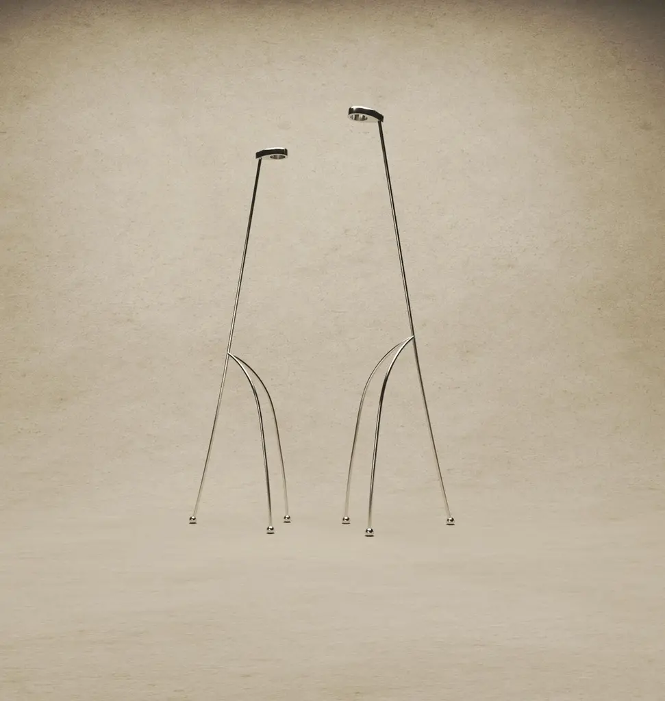 Set of 2 the Giraffe Lamps by KilziDimensions: D 65 x W 65 x H 210 cm, D 55 x W 55 x H 185 cm.Materials: Polished stainless steel.All our lamps can be wired according to each country. If sold to the USA it will be wired for the USA for instance. Please contact us.These polished stainless steel tubular lamps are going to be most likely the tallest object in their room. They also display a vigilant attitude combined with the elegance giraffes and other savanna animals display. This lamp is intended to be presented in two positions, “standing” and “grassing". Materials may vary. Please contact us.Jorge Suárez-Kilzi was born in Venezuela to immigrant parents of Spanish andSyrian descent. His collection of works is signed under his mother’s last name, Kilzi, which is also often used to describe a person who works with plaster and chalk-unconsciously leading Jorge down a path he was destined for. The name has a link to a hard childhood in movement, to an immigrant background, to Latin American and its vernacular arts, to a sense of movement and evolution.As a grown man, the sensibilities of his childhood took him all the way to Japan, where worked as an architect in the offices of Sejima+Nishizawa Associated Architects/ SANAA and Junya Ishigami. Swiss architecture, which seemed in contrast, firm and steady, called upon him on a different basis, a return to order but also a reconnection to nature. A recent trip to Mexico and the mesoamericas, felt to Jorge as forgiveness to his early history and aesthetics. Driven by years of immersion in exotic culture and architectural experience, in 2018, he made the decision to become a freelance architect and artist, going from fields of architectural visualisations to ceramics and furniture, giving special attention to drawings and decorative motives. Every piece is expressed in simple forms and delicate emotions, where fluid silhouettes accompany each other like a soul in companionship. Jorge’s recent creation is titled “Mush” Lamps, comprised of two mushroom-shaped lamps made entirely of fibreglass and organic resins. This opaque material allows light to spread outwards, imbuing a warm glow and ambiance into any interior - existing as both a practical light source and ornamental piece. Jorge shares that his project began with no particular form in mind but later found a resemblance to mushrooms when complete-which he also shares a fascination for the fungi kingdom.“.