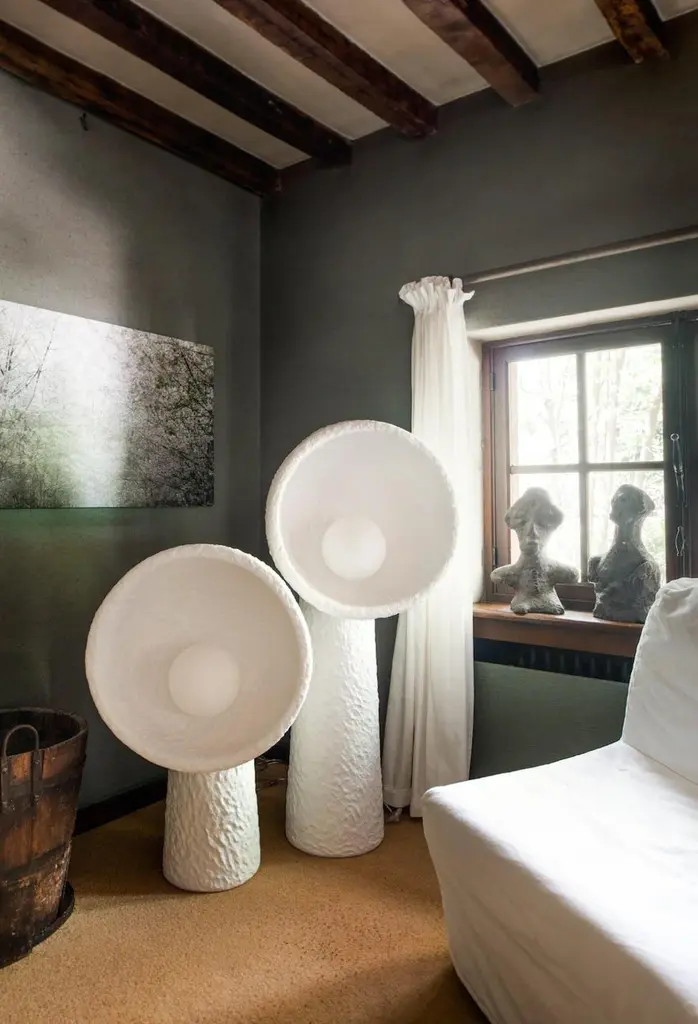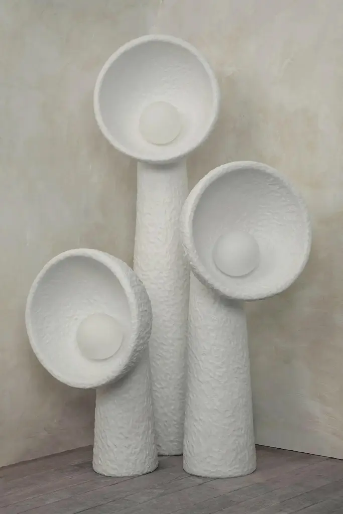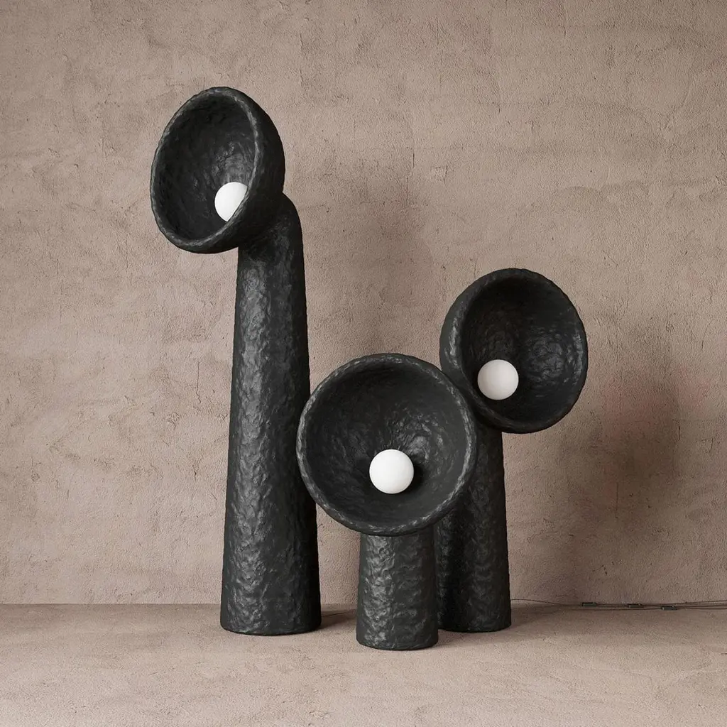 Set of 3 Contemporary Floor Lamps - Soniah by Victoriya Yakusha for FainaDesign: Victoriya YakushaMaterial: upcycled steel, flax rubber, wood chips, cellulose, and clay all withbiopolymer coverDimensions: Small: H 105 x W 60 x L 30 cmMedium: H 135 x W 60 x L 33 cmBig: H 200 x W 60 x L 40 cmCable length: 5mOn/off cord foot switchGlass lamp plafond1 x E26/27 LED Bulb max 60W, non dimmableAvailable in 6 colours. Please refer to the color card in the image section.All Faina lamps can be wired according to each country. If sold to the US it will be wired for the US for instance.Handcrafted in The Ukraine.FAINA:FAINA is an authentic collection of furniture, lighting, and décor. Established in 2014 as a reflection of the strong social-cultural changes in Ukraine, FAINA takes roots in the country's cultural heritage and represents modern Ukrainian design.Following the philosophy of live design, the FAINA collection is released two times per year — during Winter and Summer solstice, days of natural renewal.In 2018 brand launched a unique project — design expedition “Land inspires” aimed to draw attention to the rich cultural heritage of Ukraine. In 2019 interior by Yakusha Design was selected among the 5 best offices in the world by the Dezeen Awards, and the studio’s founder Victoria Yakusha gained the title the designer of the year — ELLE Decoration Design Award.In 2019 Yakusha Design opened a residential showroom of FAINA in Belgium, Brussels. Now the studio works internationally both on private and commercial projects focusing on live design and sustainable approach.Victoria Yakusha:The founder of YAKUSHA and FAINA, she is the mastermind behind live minimalism, a cultural heritage architect, and a global ambassador of Ukrainian design.Victoria is one of the most famous Ukrainian architects worldwide, whose artistic endeavours shape contemporary Ukrainian design as a brand. She creates heritage—the ideas and objects that gain power, meaning, and value over time and impact the culture of future generations.As an architect, she established ‘live minimalism’, a direction in architecture and design that marries laconic to environmentally friendly in an embodiment of contact between living environments and materials that breathe and exude energy. It’s about existing in co-authorship with nature, leaving a cultural footprint rather than an environmental one.Promoting live ethnics and artisanship as a source of inspiration, Victoria conceived design expeditions—the first project of its kind aiming to introduce artists worldwide to Ukrainian artisans’ work and spread the latter’s ideas globally.