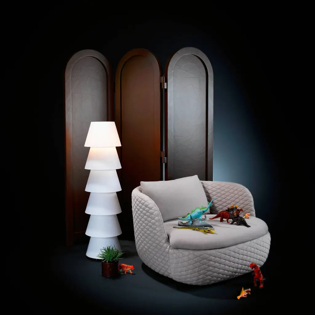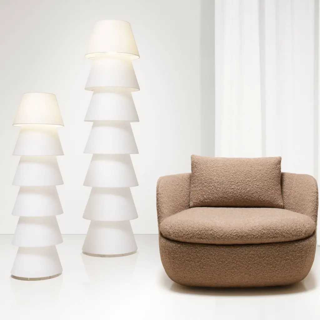 Set Up Shades seeming consists of separately stacked lampshades but it is actually a solid piece that radiates beautifully soft light. Designer Marcel ruminates on the conical form in 3 versions of the floor lamp, piling the lampshades 6, 7 or 8 high. Discarding expectations of what a lamp should look like, the designer arrives at a whimsical but completely functional room addition.