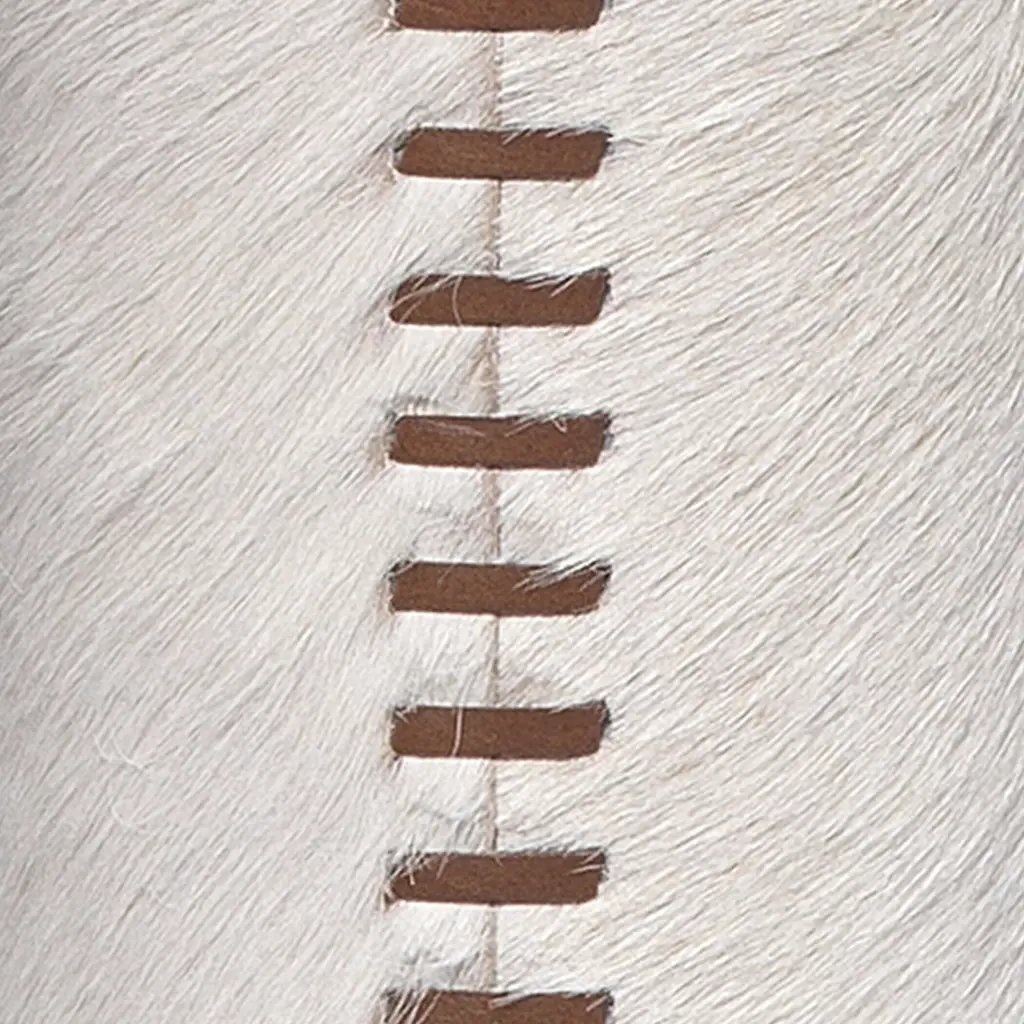 Warm oil rubbed bronze is wrapped in white hair-on hide in this exceptional lighting option. The hides for each are selected by hand; no two hides will be identical. Their masculine edge is enhanced with a bronze finial and softened with an off-white linen drum shade, resulting in a unique choice for study, living area, or den.