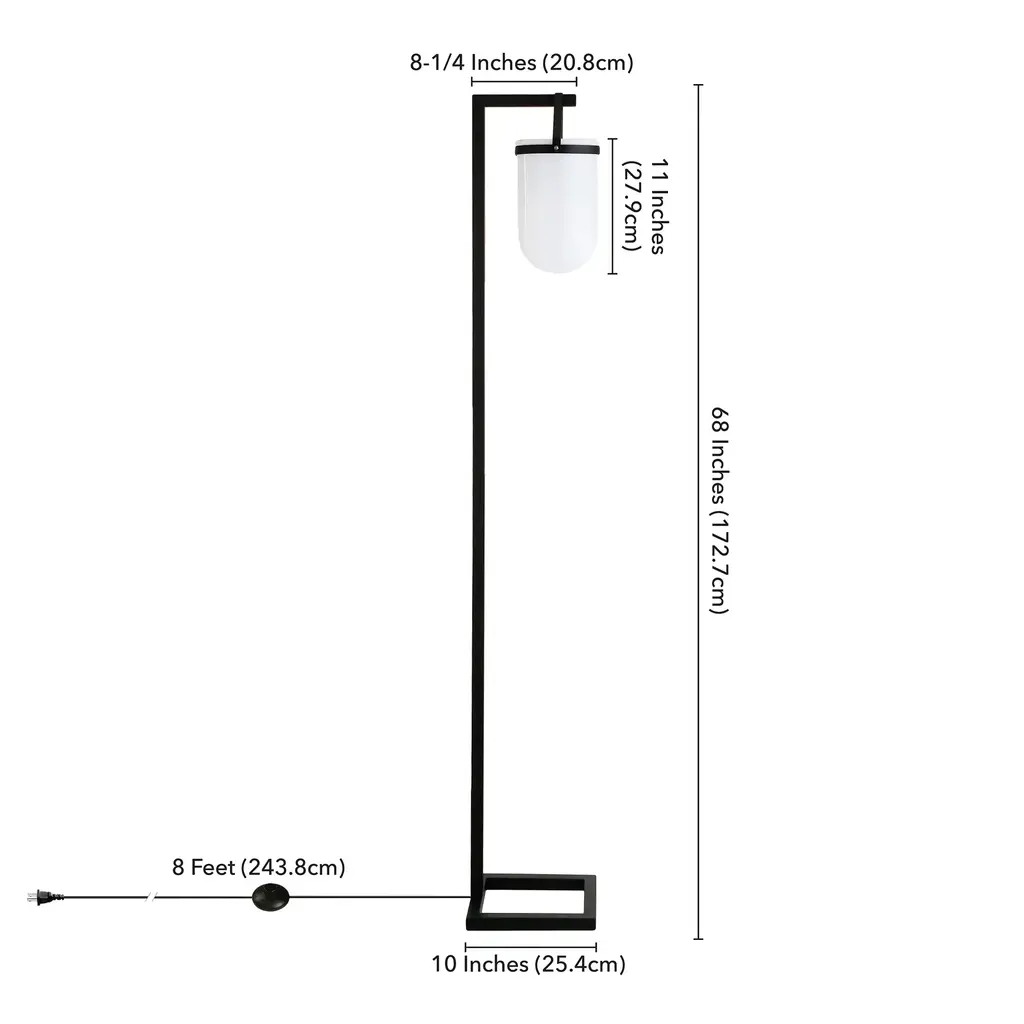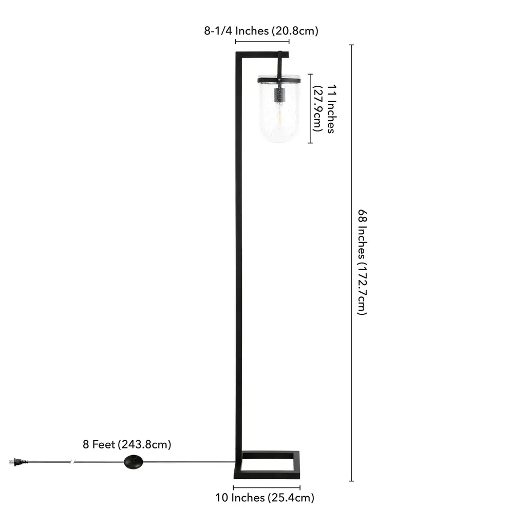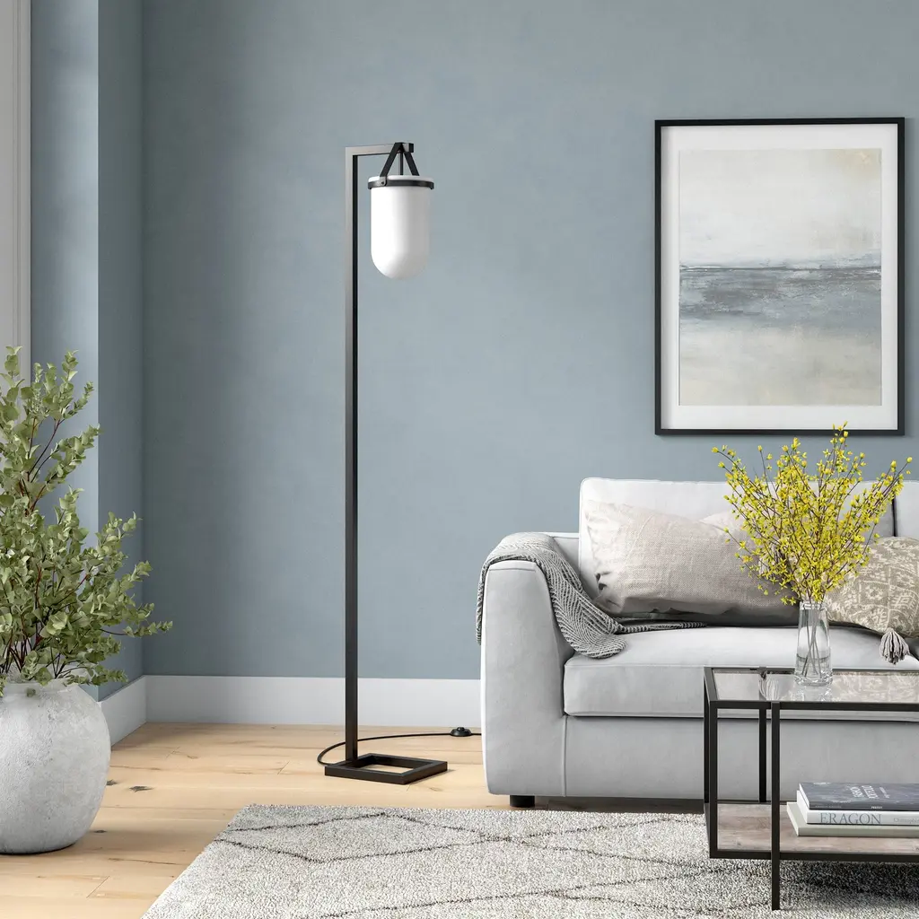 Modern farmhouse meets the big city with this lantern-inspired floor lamp featuring an angular industrial-inspired base. The domed cylindrical glass shade hangs from three steel supports and is encircled by a coordinating metal collar for a crisp modern look. At 68" tall, this lamp will add eye-catching style to any room of your home.Features:The hanging lantern style diffuses light throughout the room.Paired with a domed cylindrical shade.Includes an 8 ft. cord.Rated for one 100W incandescent bulb; 9W LED bulb, 23W fluorescent (CFL) bulb, or 9W self-ballasted LED bulb. E26-base bulb.Features easy assembly.Clean with a soft, dry cloth; no harsh chemicals or abrasive cleaning materials.