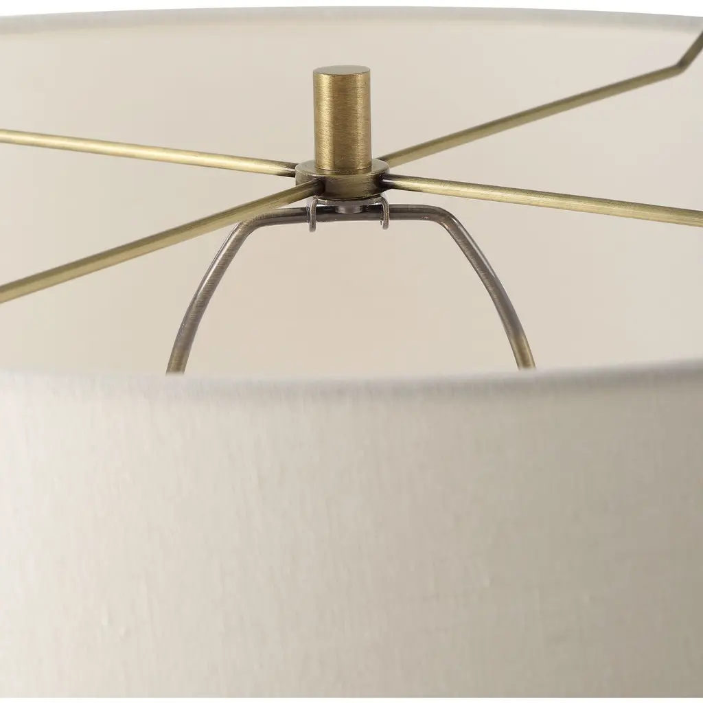 The Shino Floor Lamp Seamlessly Blends Both Contemporary And Traditional Decors. Crafted In Iron And Finished In Plated Antique Brass, The Timeless Design Is Displayed On A Thick Black Travertine Foot. The Slightly Tapered Round Hardback Shade Is A White Linen Fabric With Light Slubbing.