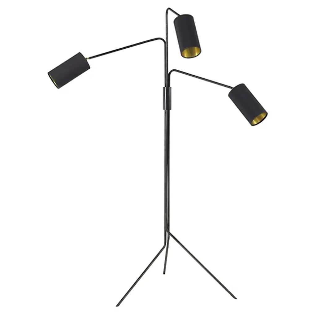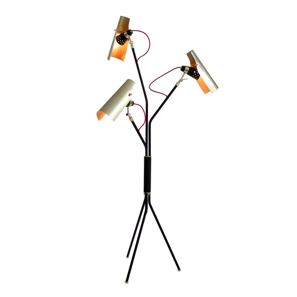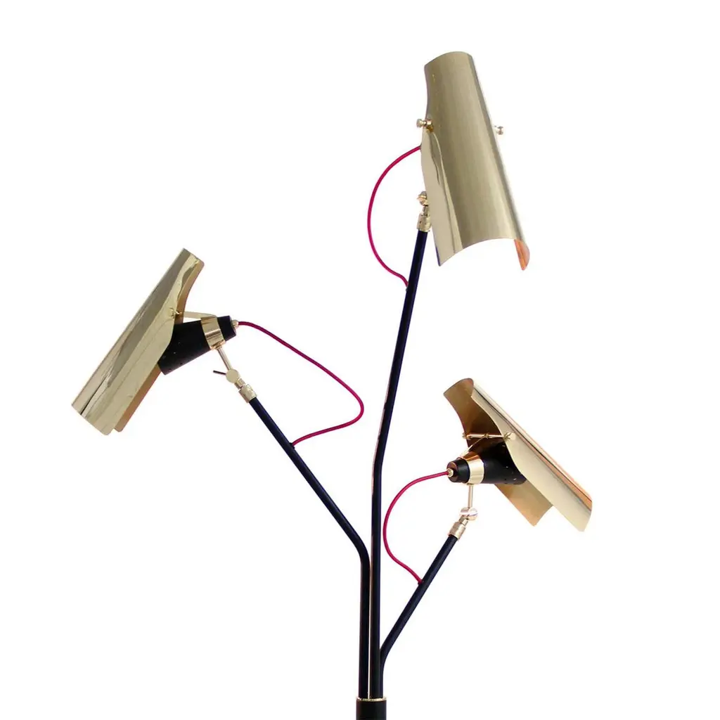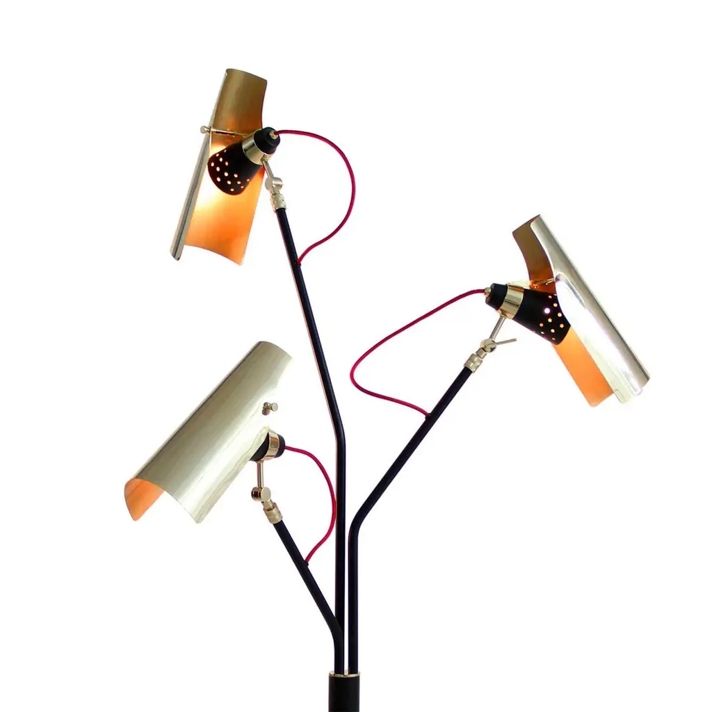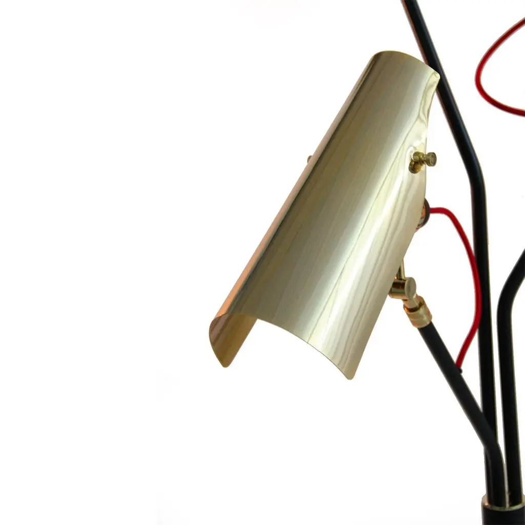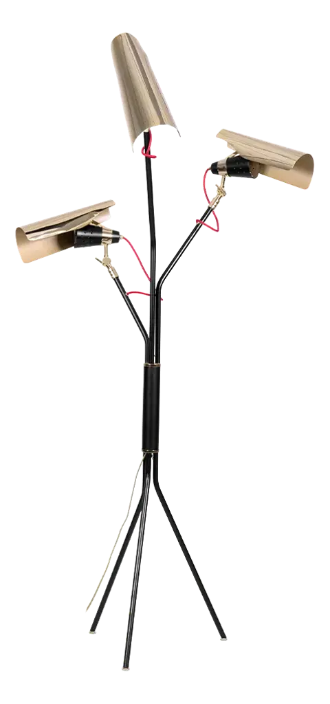 Floor lamp sight with base and body structurein brass in black finish and polished brass finish.Shades in aluminium in brass finish with red cords.With 3 bulbs, lamp holder type GU10, max 40wattsper bulb. Bulbs not included.