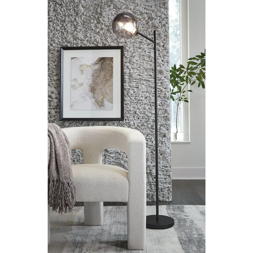 This floor lamp is designed to shine light where you need it most without compromising on style. Its contemporary black finish pairs well with neutrals or pops of color, while the smoky glass shade brings a fresh take to the look. The lamp is a smart addition by a sofa, in a reading nook or tucked into the corner of an office.Features:Made of metal with smoky glass shadeBlack finishOn-off foot switch1 E26 socket, type A bulb recommended (not included); 40 watts max or CFL 8 watts max; UL ListedAssembly required