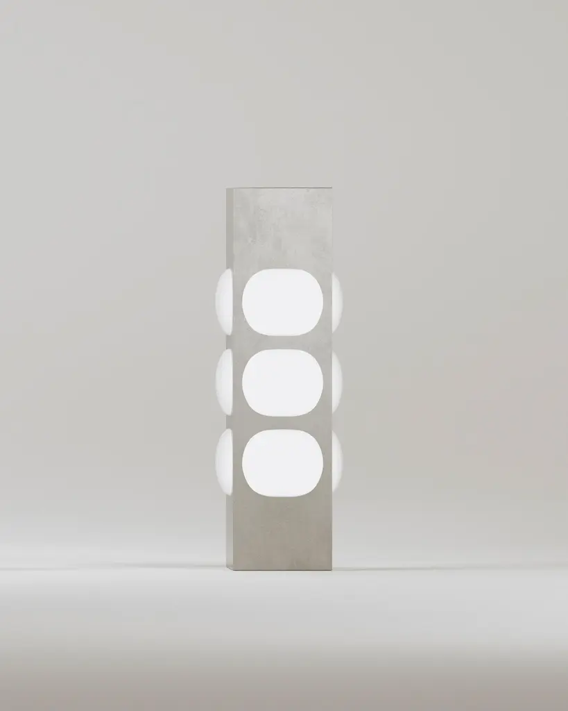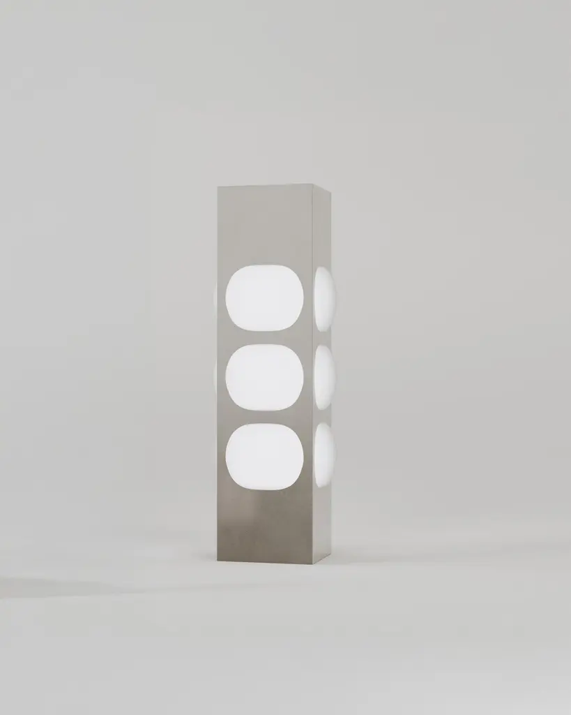 Silica 3 Floor Lamp by DualismoDimensions: W 53 x D 53 x H 165 cmMaterials: Polished Stainless Steel.About:Dualismo is an art and design studio creating work at the intersection of art, objects, and spaces. the studio is dedicated to the creation of sculptural and functional collectible art and design.Sabrina Canals is the founder and creative mind behind Dualismo Studio, where she creates sculptural pieces that blur the lines between art & design. At the heart of her work is a fascination with how objects can feel both timeless and forward-looking, as if they belong to another world or era. Through the blend of raw and industrial materials she shapes pieces that are bold, striking, and rooted in unique craftsmanship and precision. Sabrina’s approach to design is deeply intuitive and personal, guided by a desire to create objects that evoke a sense of mystery and that draw from her interest in ancient art history, symbolism, and spirituality. With Peruvian heritage, Sabrina had an early fascination with the Incan civilization, which then expanded into a deep interest of the ancient world; captivated by its architecture, art, astronomical insights, as well as their reverence for nature. With a background in interior architecture and furniture design from the School of the Art Institute of Chicago, Sabrina’s practice has expanded to include architectural lighting, experiential installations & events, and art direction & set design for film and television. She sees these diverse disciplines as essential facets of her creative path, each adding depth and perspective to her work. Through Dualismo Studio, Sabrina continues to explore the boundaries of art and design, pursuing honest expressions that bring purpose and passion to her life.All our lamps can be wired according to each country. If sold to the USA it will be wired for the USA for instance.