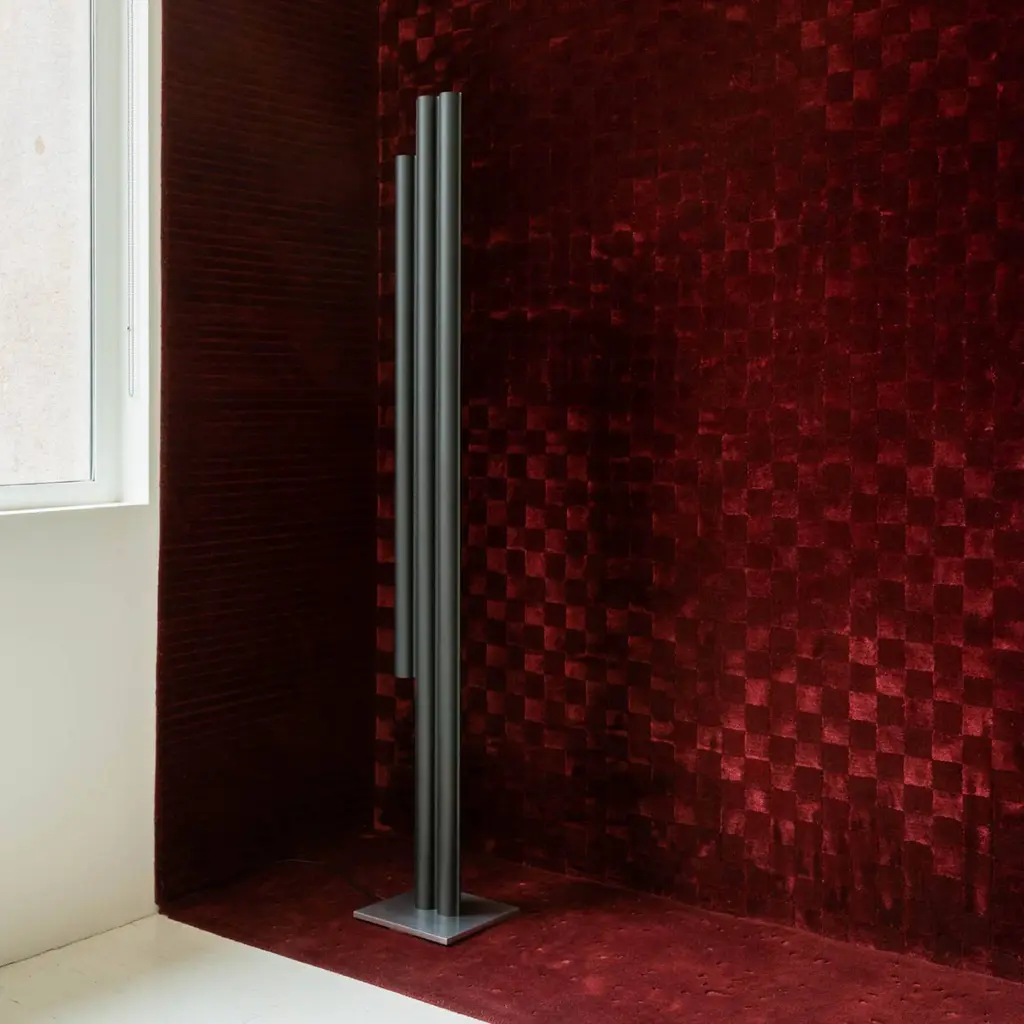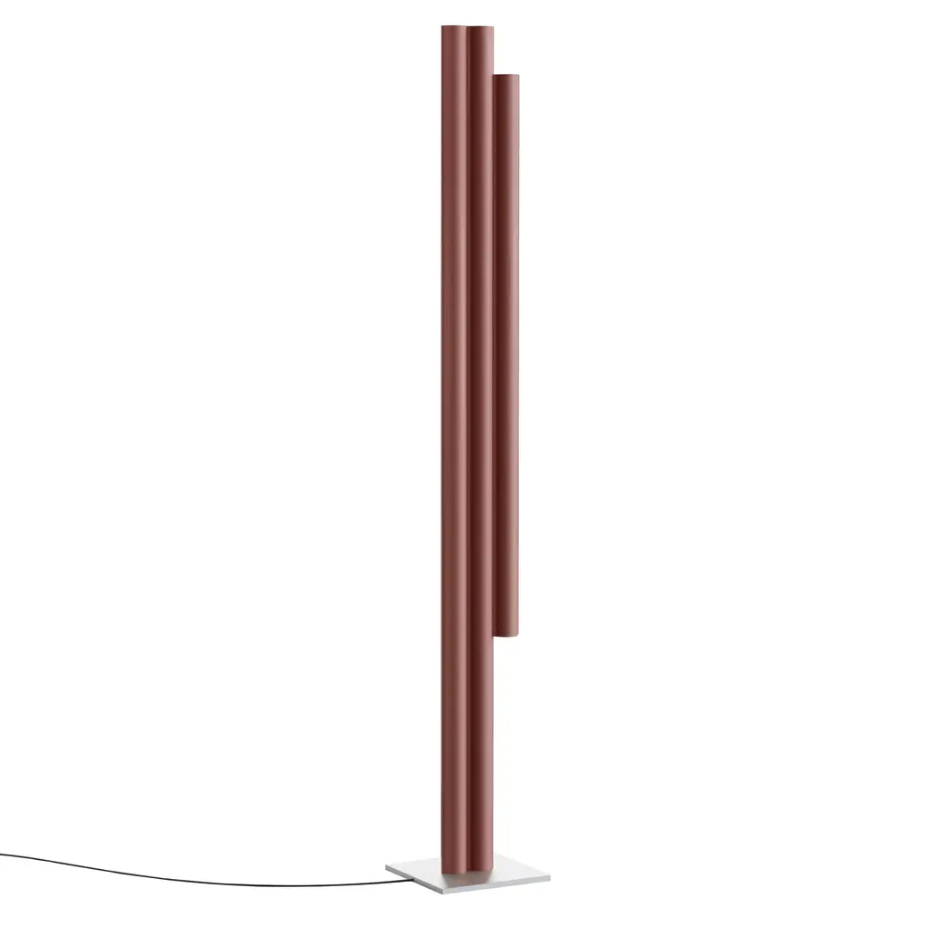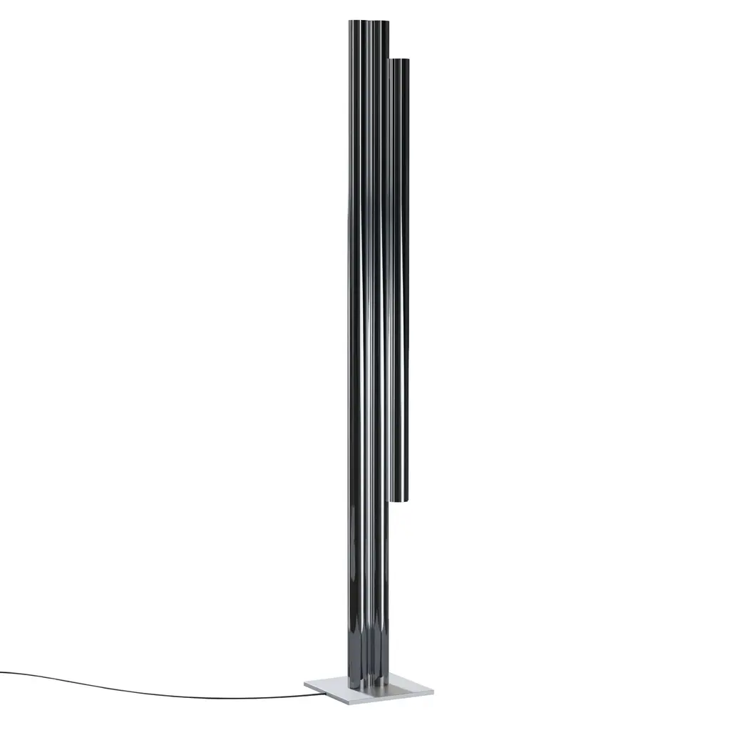 Silo 3FH floor is a sculptural take on the traditional standing lamp, with a linear presence that makes a statement whether off or illuminated. Providing light upward from its 3 channels and downward as well from the shorter cylinder, the floor light is fashioned using custom aluminum extrusions in either metallic or color finishes, set on a plinth-style base.