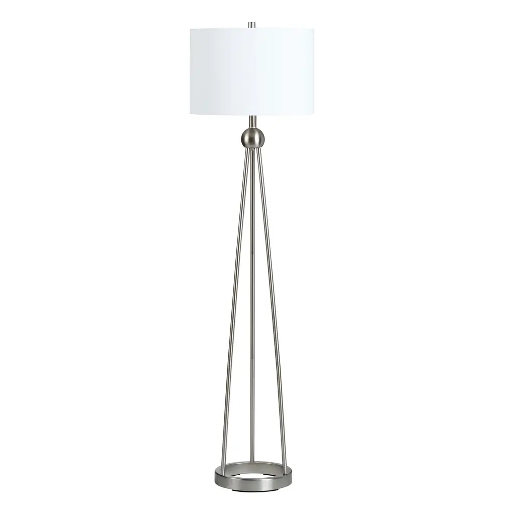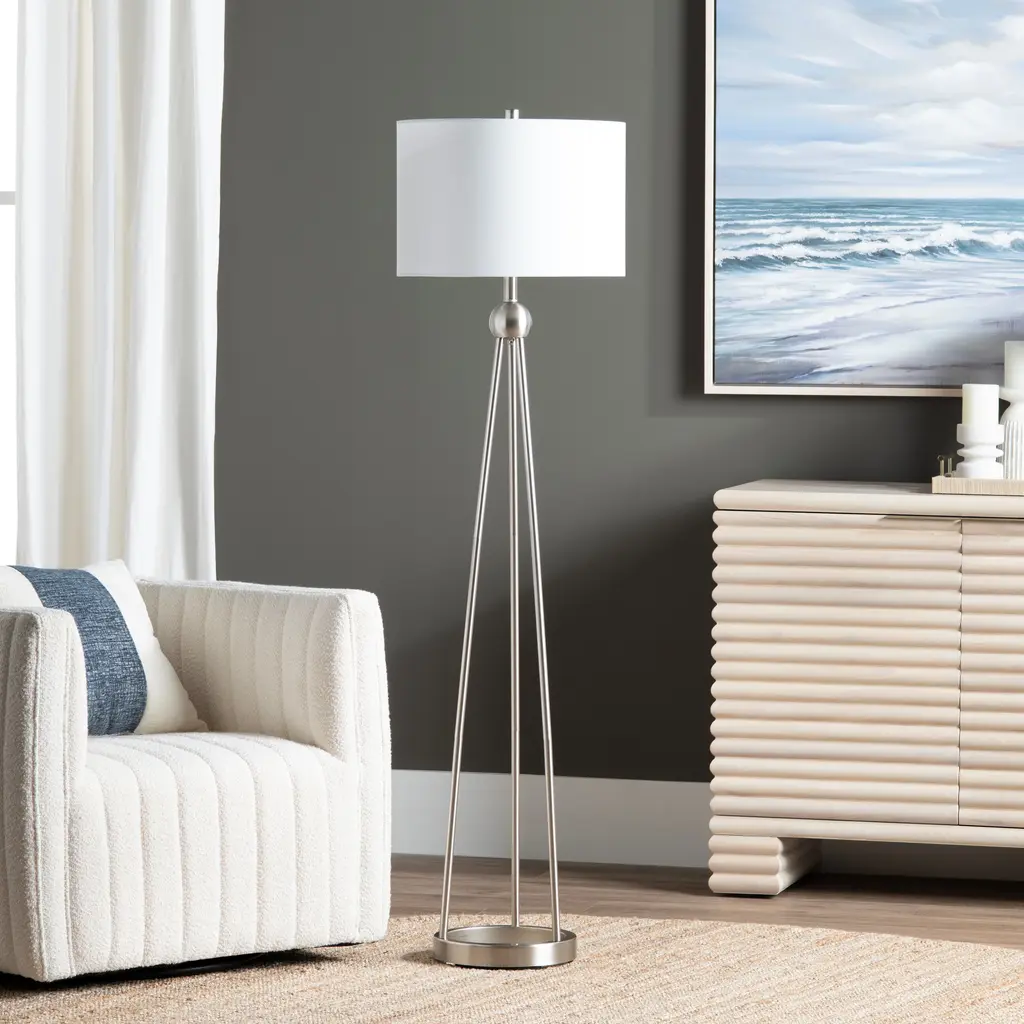 Sleek and modern, this Silver Metal Floor Lamp adds a sophisticated touch to any room. Its minimalist design features a sturdy silver metal frame with three slender legs that form a tripod base, providing both style and stability. The lamp is topped with a crisp white drum shade, which diffuses light beautifully for a warm ambiance. Equipped with a Type A rotary switch, it supports a 150W bulb. Measuring 16.5" in width and length, and 61" height, this floor lamp is ideal for living rooms, bedrooms, or offices.