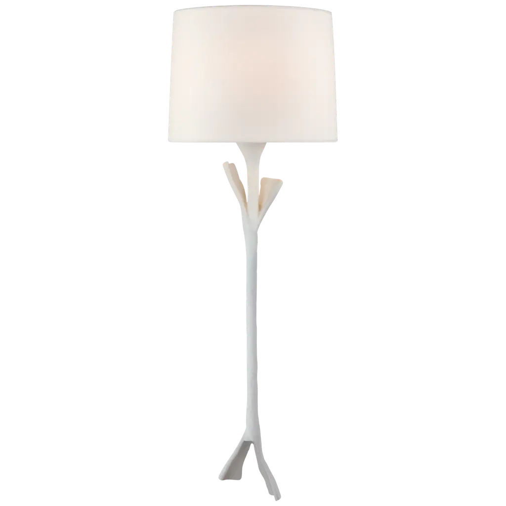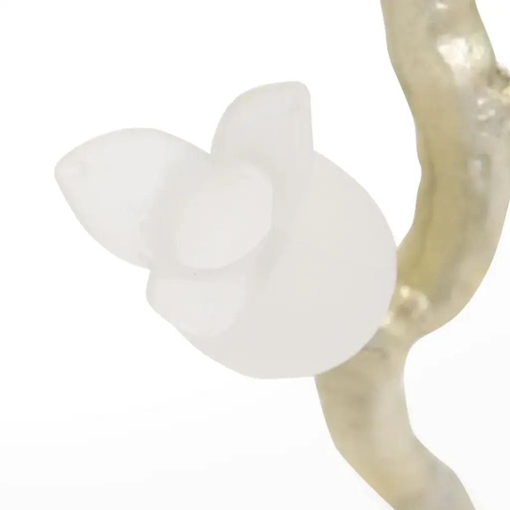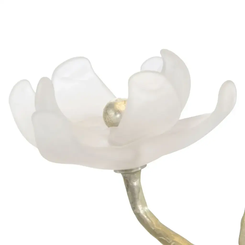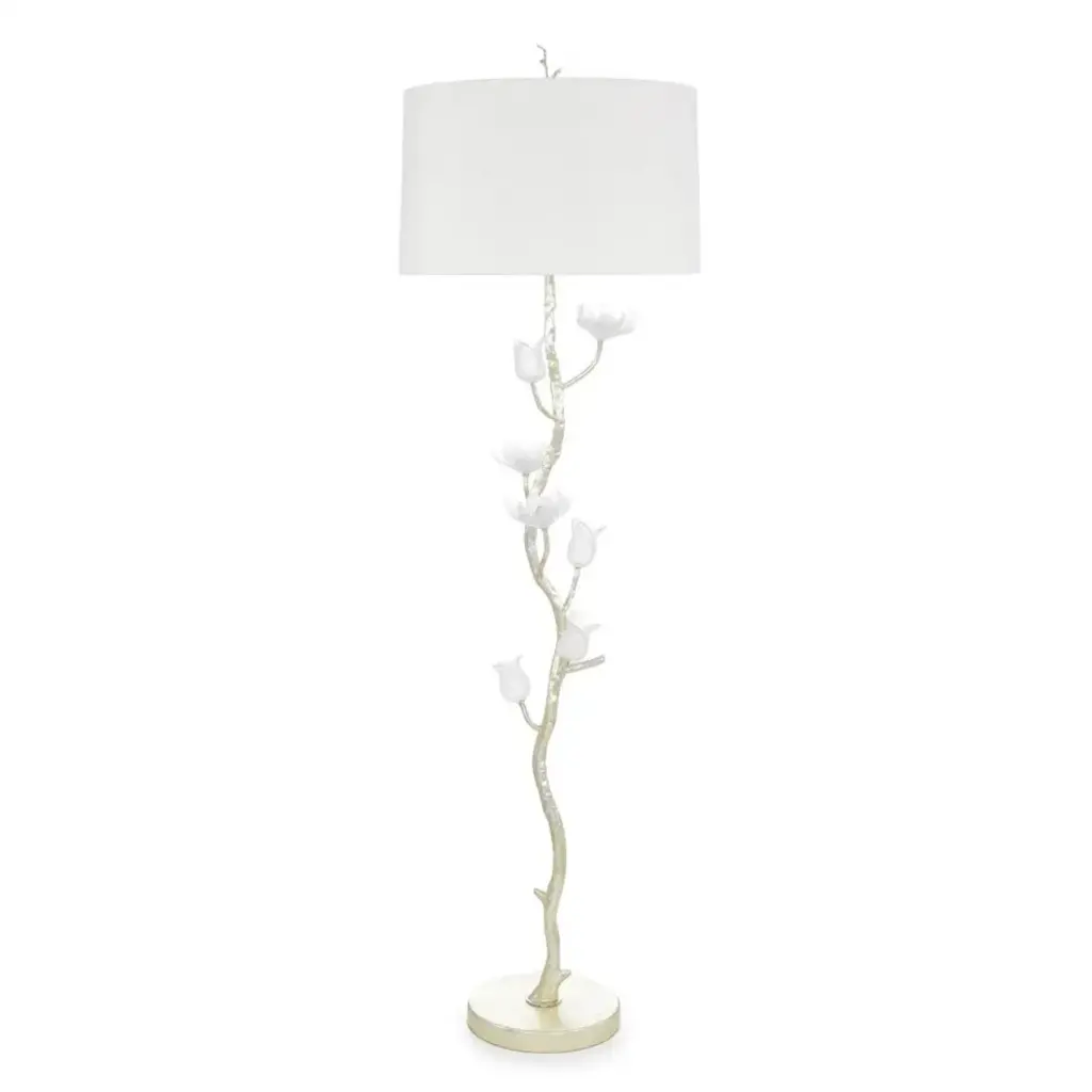 The Silver Perennial Floor Lamp showcases a gorgeous body that emulates Mother Nature’s wonderful creations. Taking the shape of a stunning tree, this turnkey lamp features elegant flora of frosted glass that adorns its branches. Expertly crafted from brass, the tree and rounded base have been adorned in a lustrous silver leaf that lends a sense of gravitas to an interior space. The finial takes the shape of a small branch, matching the body and completing the natural motif.