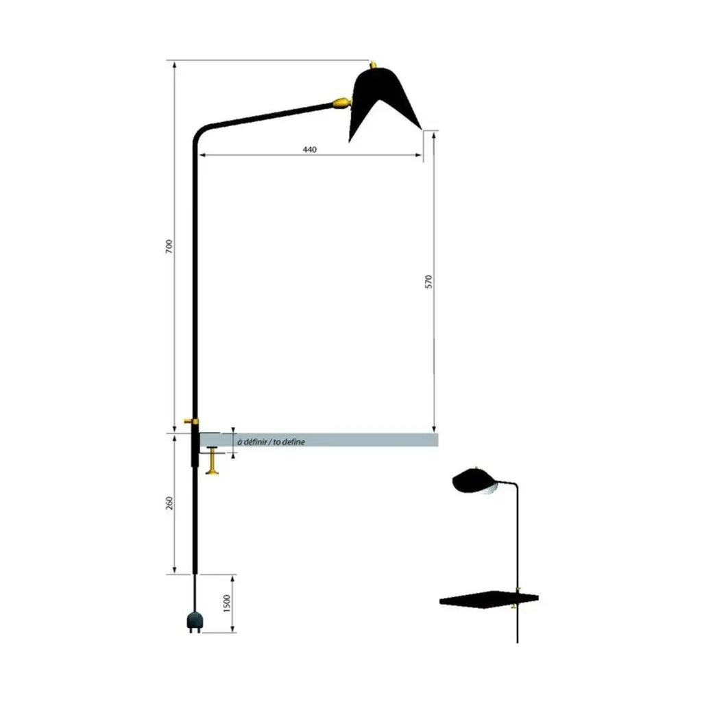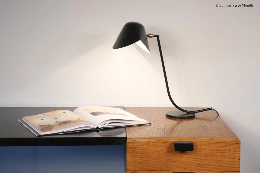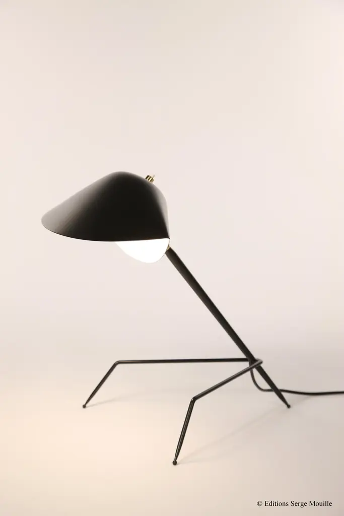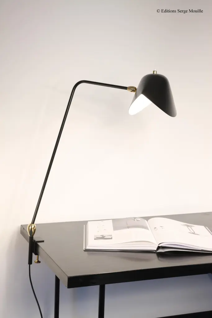 Simple Agrafée by Serge MouilleDimensions: D44 x H70 cmMaterials: Brass, steel, aluminiumOne of a King. Numbered.Also available in different colour. All our lamps can be wired according to each country. If sold to the USA it will be wired for the USA for instance.The Agrafée simple Serge Mouille lamp is an iconic model from 1957, made in France and reissued by Éditions Serge Mouille. Fitted with a curved steel arm, it has a black lacquered aluminum reflector with a glossy white interior, which can be adjusted using a brass ball joint. Designed to fit your needs, the width of the binding is to be defined when ordering. Delivered quickly, this numbered model with certificate of authenticity is also available in white.Serge MouilleBorn in Paris in 1922, Serge Mouille is today considered one of the greatest lighting designers in the world. He developed a talent for drawing and creation very early on and was the youngest student of his time to be admitted to the School of Applied Arts at the age of 13.Master goldsmith, Serge Mouille learned the art of modeling metal with a Hammer thanks to his mentor Gabriel Lacroix and worked for several goldsmith houses in Paris. It was his meeting with Jacques Adnet, director of the Compagnie des arts français, that would mark a turning point in his career.In 1951, Jacques Adnet commissioned Serge Mouille to create a “large light fixture” for his South American customers: the first three-arm floor lamp was born. This innovative Luminaire in molded black steel with organic shapes will influence his famous series of "Black Forms" and will forever mark the history of design. Serge Mouille then passes from the status of master craftsman to that of creative artist.At the beginning of the 1960s, Serge Mouille decided to radically distance himself from everything he had created until then by developing a series of light columns with fluorescent tubes. In 1963, he stopped producing lights to devote himself to teaching.Suffering from tuberculosis, Serge Mouille died in 1988 and his widow, Gin Mouille, decided to continue to bring his art to life by publishing under license his most emblematic creations. Each copy is made in France by Éditions Serge Mouille and has an engraved serial number, accompanied by a certificate of authenticity.
