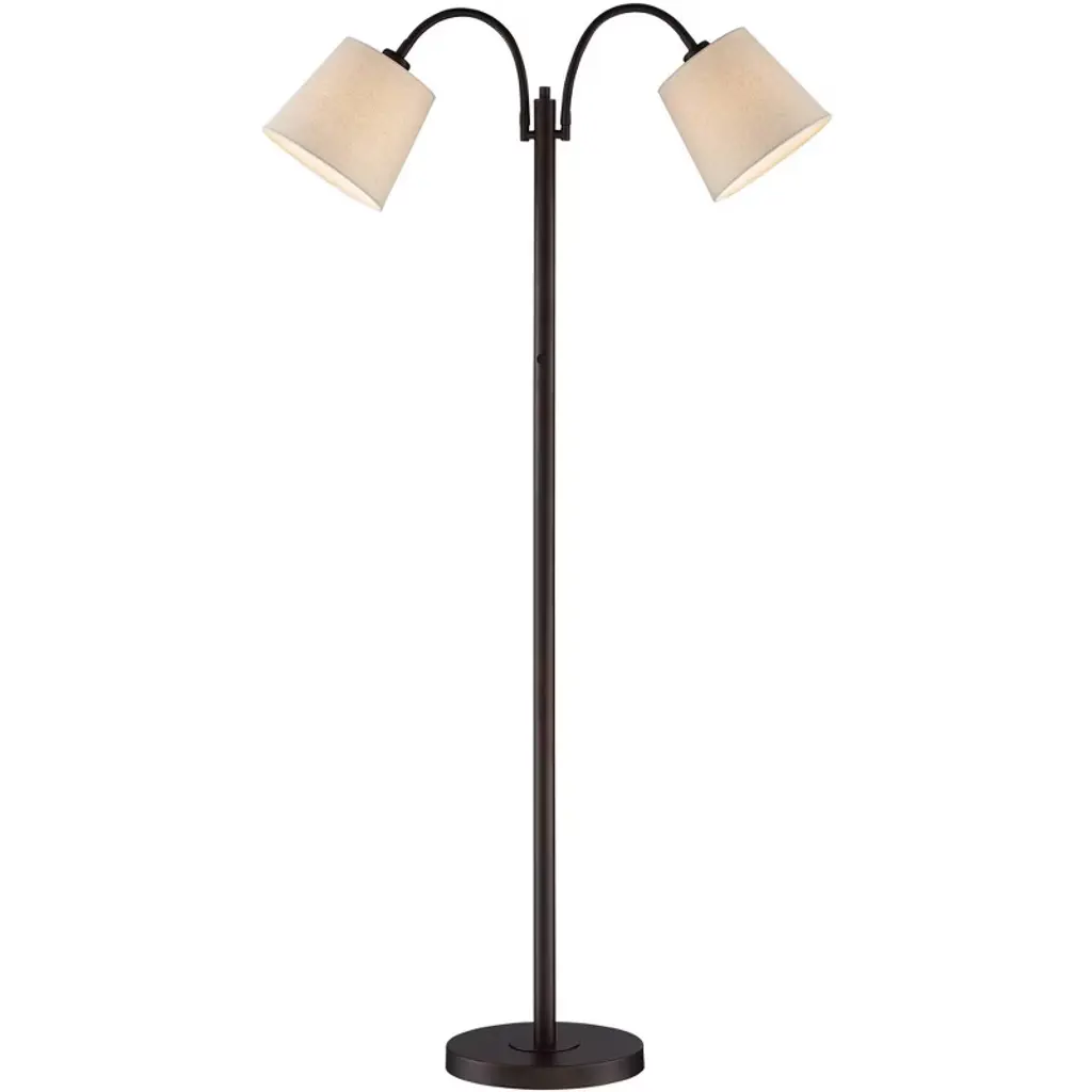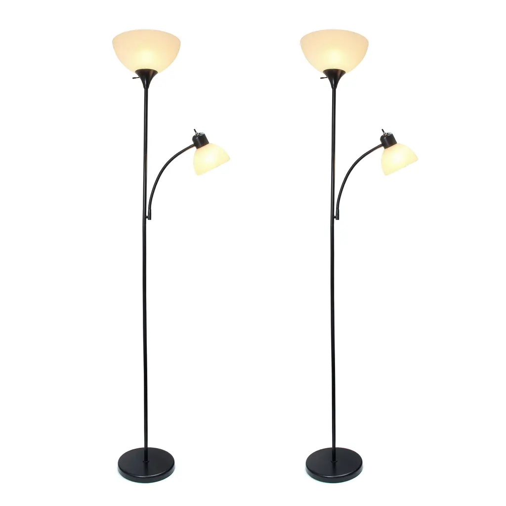 A charming, inexpensive, and practical floor lamp set to meet your basic lighting needs. This simple mother/daughter floor lamp set with reading lights features a painted finish and plastic white shades. Perfect for living room, bedroom, office, kids room, or college dorm.