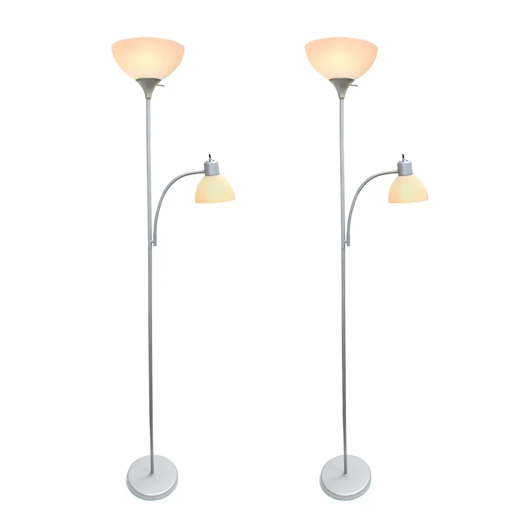 A charming, inexpensive, and practical floor lamp set to meet your basic lighting needs. This simple mother/daughter floor lamp set with reading lights features a painted finish and plastic white shades. Perfect for living room, bedroom, office, kids room, or college dorm.