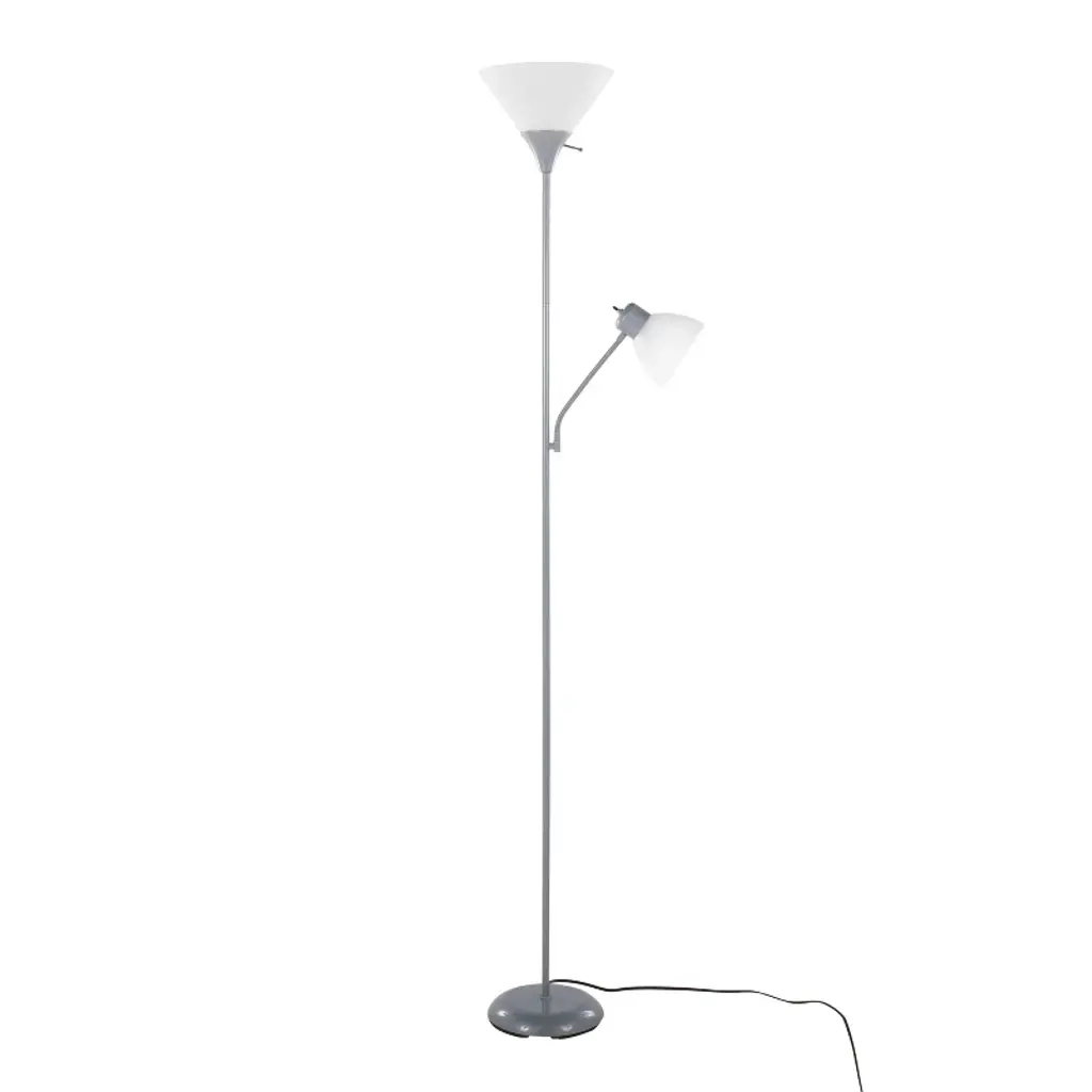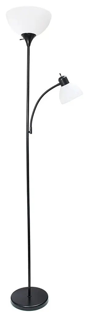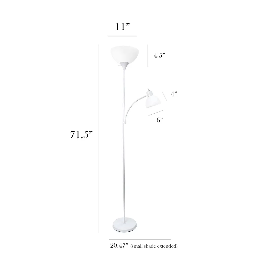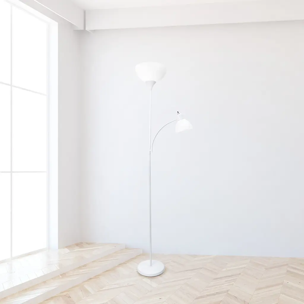 A charming, inexpensive, and practical floor lamp to meet your basic lighting needs. This simple mother/daughter floor lamp with reading light features a painted finish and plastic white shades. Perfect for living room, bedroom, office, kids room, or college dorm.