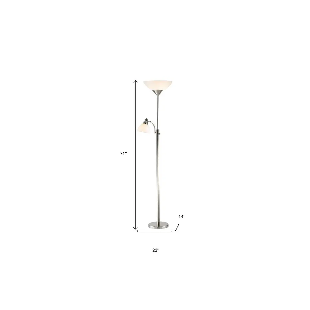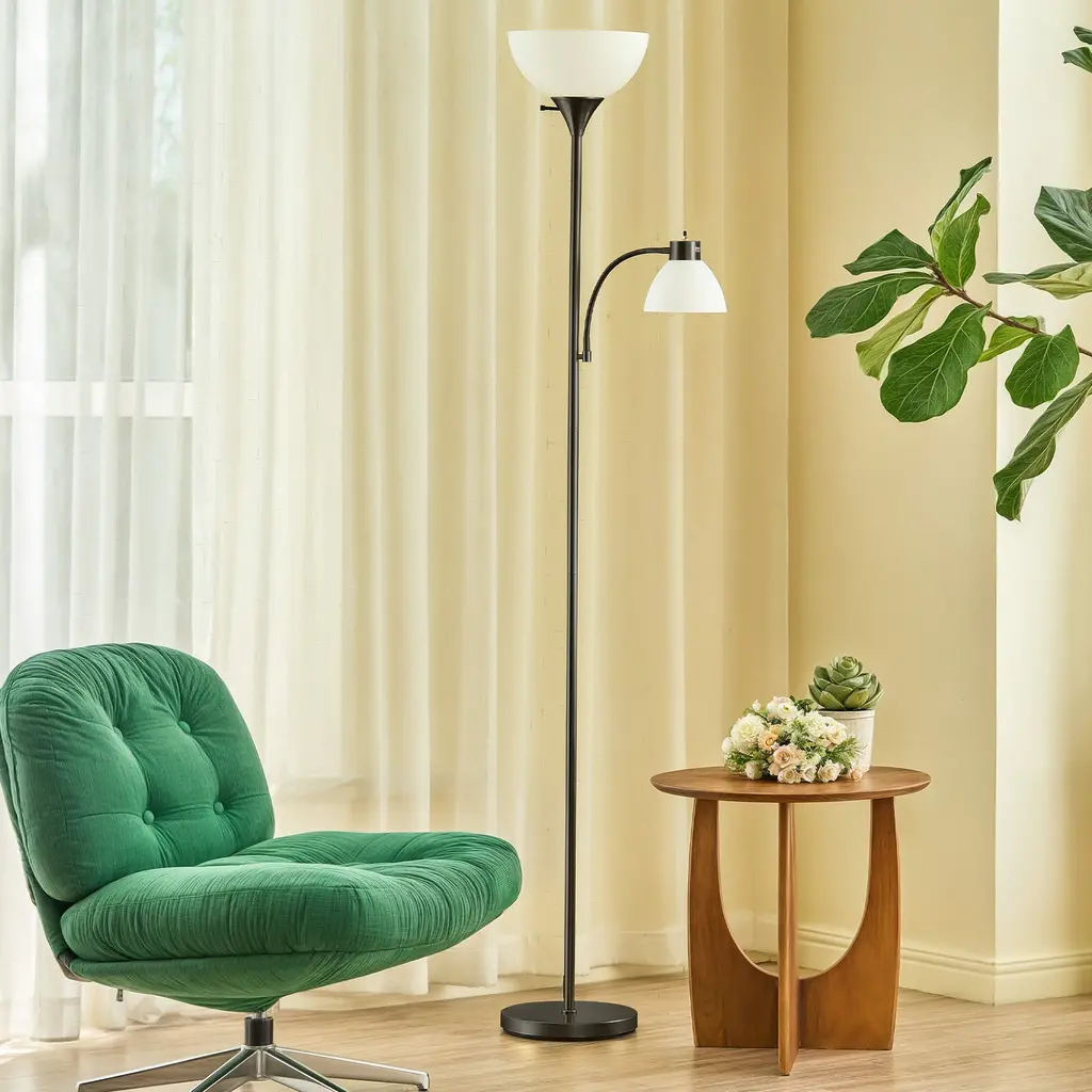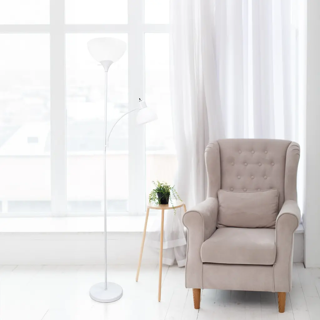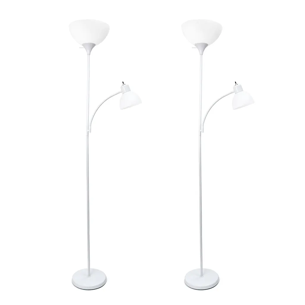 A charming, inexpensive, and practical floor lamp to meet your basic lighting needs. This simple mother/daughter floor lamp with reading light features a painted finish and plastic white shades. Perfect for living room, bedroom, office, kids room, or college dorm.