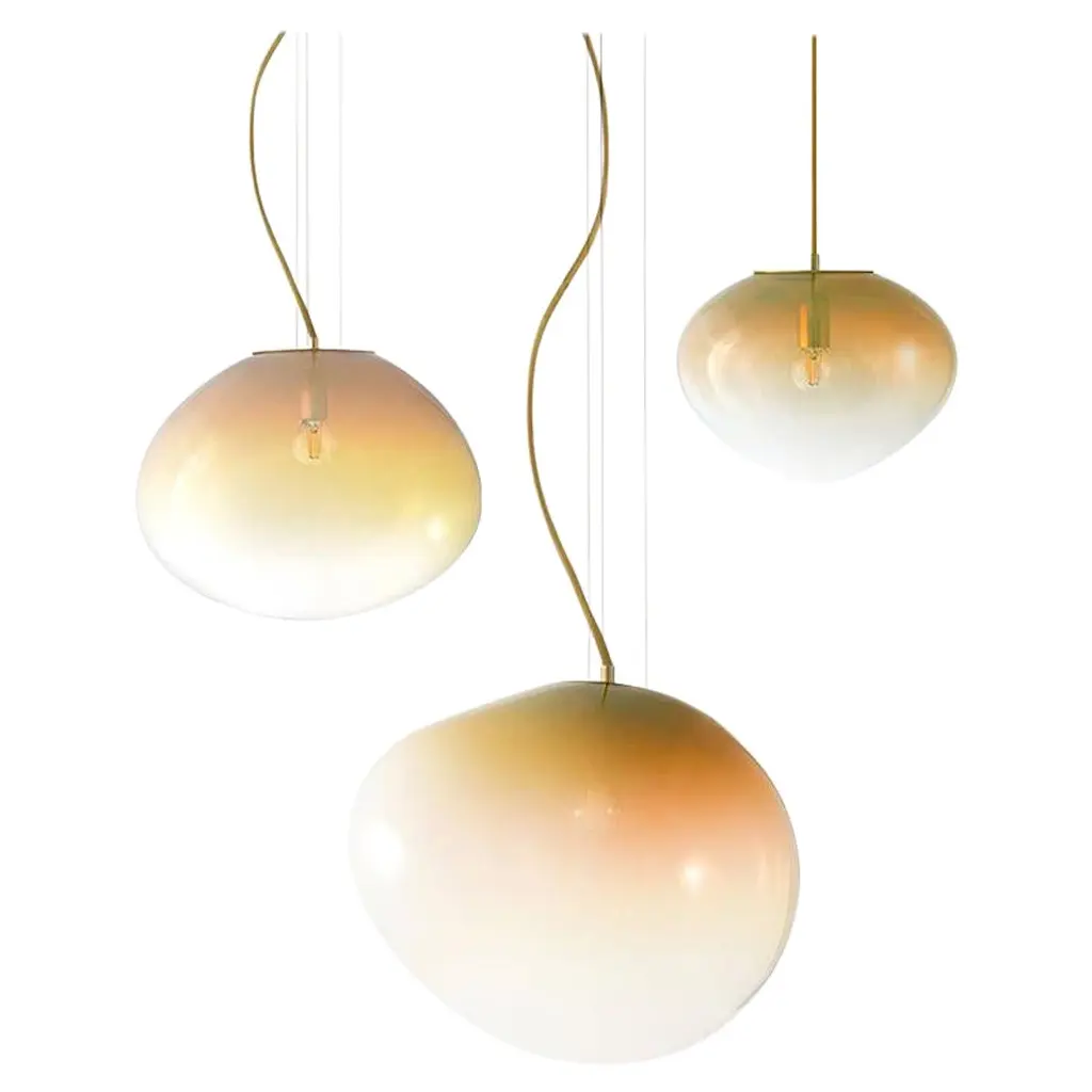 Solitary or in constellation, these lights create individual light concepts and associate with star constellations. Each glass piece is named after a star or a planet. They exist as hanging, floor, standing and wall luminaries.The creator combines the craft of ancient glassblowing with a simple, yet distinct design. In order to achieve the large size of the glass objects and working without forms, it takes a high level of refined craftsmanship and skill performed by only a few master glassblowers.Sirius is the most visible star in the sky. SIRIO lamp combines the liveliness of light with the beauty of organically rounded horizontal shapes – bringing a majestic feeling of levitation into your space. It sparkles, suspended from the ceiling, with its pleasingly irregular form creating an impression of quiet movement throughout the room. Its iridescent amber hues contain all the colors of the light spectrum – giving out a warm glow and surrounding you with a cozy cocoon of calm.Available in different size, colours and finishings: see every product page and pick up your favourite!