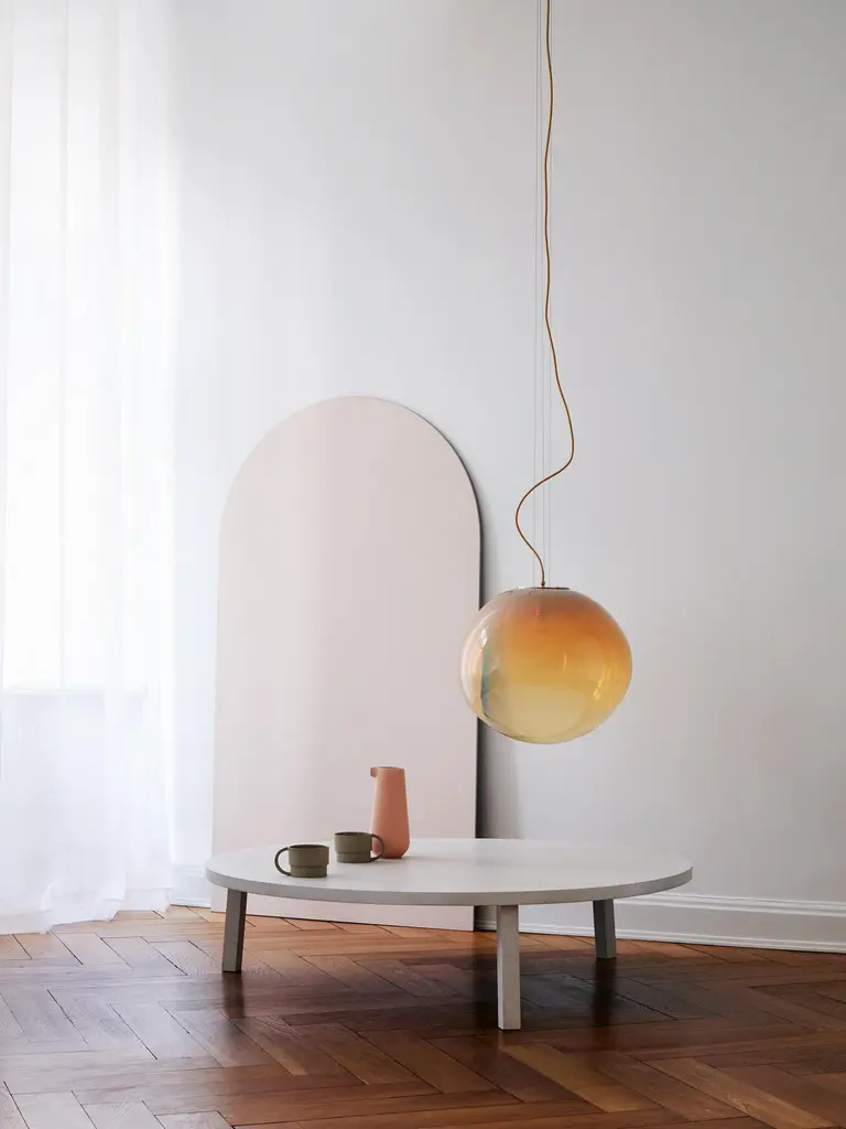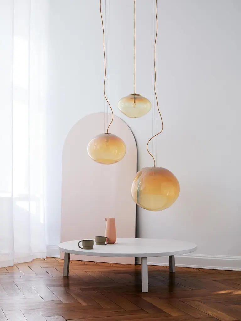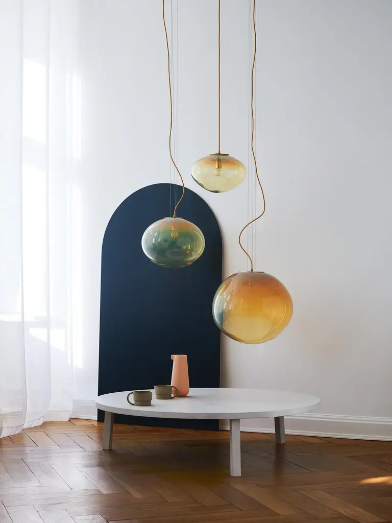 Solitary or in constellation, these lights create individual light concepts and associate with star constellations. Each glass piece is named after a star or a planet. They exist as hanging, floor, standing and wall luminaries.The creator combines the craft of ancient glassblowing with a simple, yet distinct design. In order to achieve the large size of the glass objects and working without forms, it takes a high level of refined craftsmanship and skill performed by only a few master glassblowers.Sirius is the most visible star in the sky. SIRIO lamp combines the liveliness of light with the beauty of organically rounded horizontal shapes – bringing a majestic feeling of levitation into your space. It sparkles, suspended from the ceiling, with its pleasingly irregular form creating an impression of quiet movement throughout the room. Its iridescent amber hues contain all the colors of the light spectrum – giving out a warm glow and surrounding you with a cozy cocoon of calm.Available in different size, colours and finishings: see every product page and pick up your favourite!