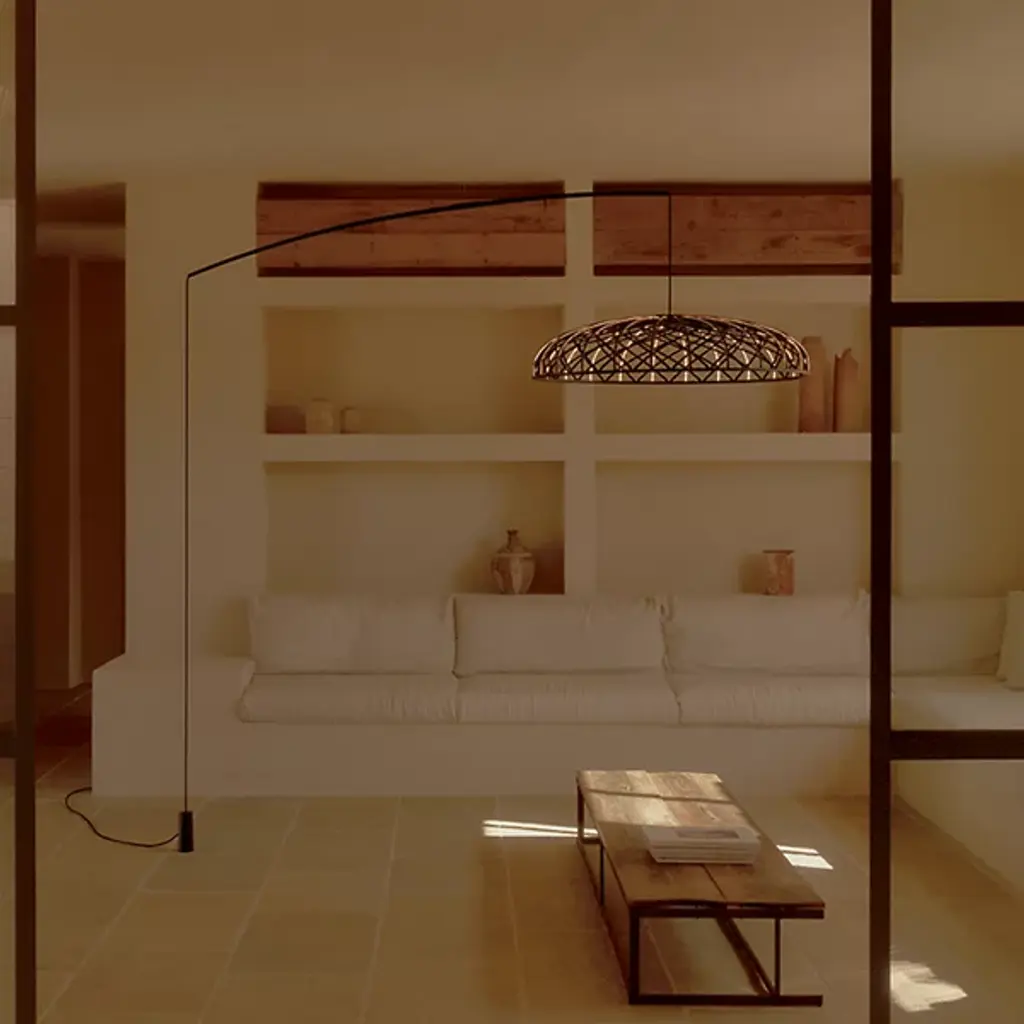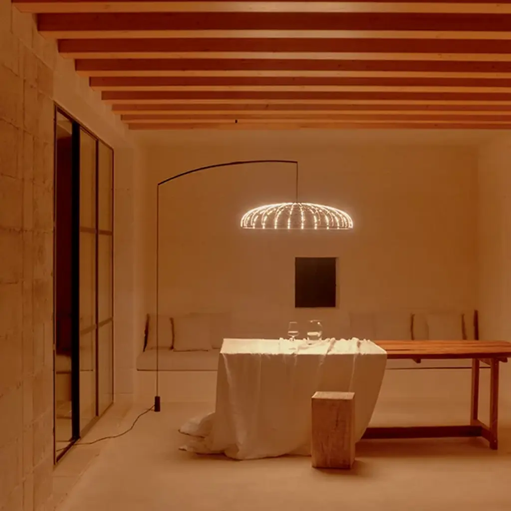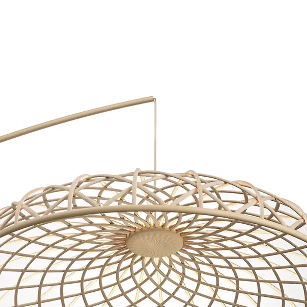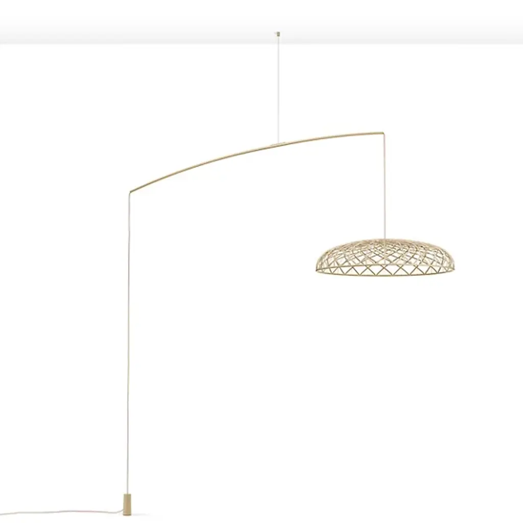 Provide lasting and light appeal to large interior spaces with the Skynest Motion LED Floor Lamp from FLOS. An enchanting design from the mind of Marcel Wanders, it’s made in Italy from a mix of aluminum and recycled fabrics, ascending from a small cylindrical base via a slim cord. The fixture features a slender but strong arm that functions as a balancing beam, suspended from a subdued ceiling mount and enabling perfect, self-correcting balance even on sloped ceilings. The fixture is carefully considered, powered by micro-connectors at the top of the dome shade that activate each lighting element individually, restrained by a horizontal ring structure at the base. The lamp takes on an airy appeal that adds a welcome rustic presence, while the lack of glue used in its assembly means it relies on excellent design and precise fit, remaining environmentally conscious, easily able to be recycled or repaired with the simple swap of modular pieces.