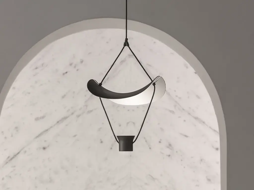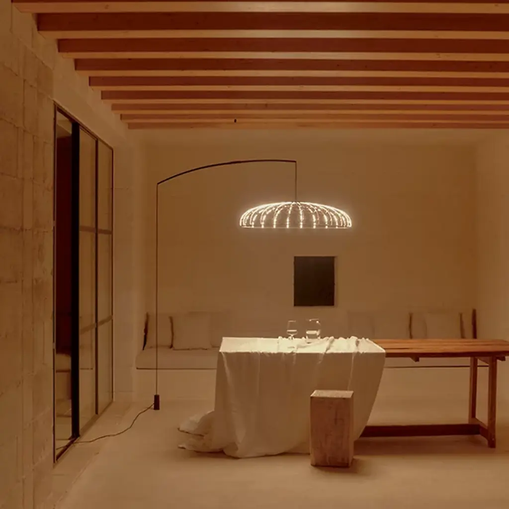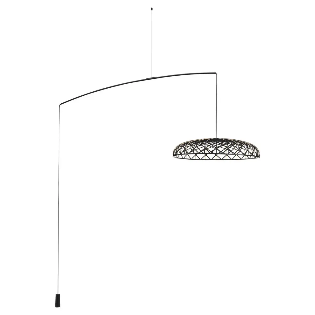 Provide lasting and light appeal to large interior spaces with the Skynest Motion LED Floor Lamp from FLOS. An enchanting design from the mind of Marcel Wanders, it’s made in Italy from a mix of aluminum and recycled fabrics, ascending from a small cylindrical base via a slim cord. The fixture features a slender but strong arm that functions as a balancing beam, suspended from a subdued ceiling mount and enabling perfect, self-correcting balance even on sloped ceilings. The fixture is carefully considered, powered by micro-connectors at the top of the dome shade that activate each lighting element individually, restrained by a horizontal ring structure at the base. The lamp takes on an airy appeal that adds a welcome rustic presence, while the lack of glue used in its assembly means it relies on excellent design and precise fit, remaining environmentally conscious, easily able to be recycled or repaired with the simple swap of modular pieces.