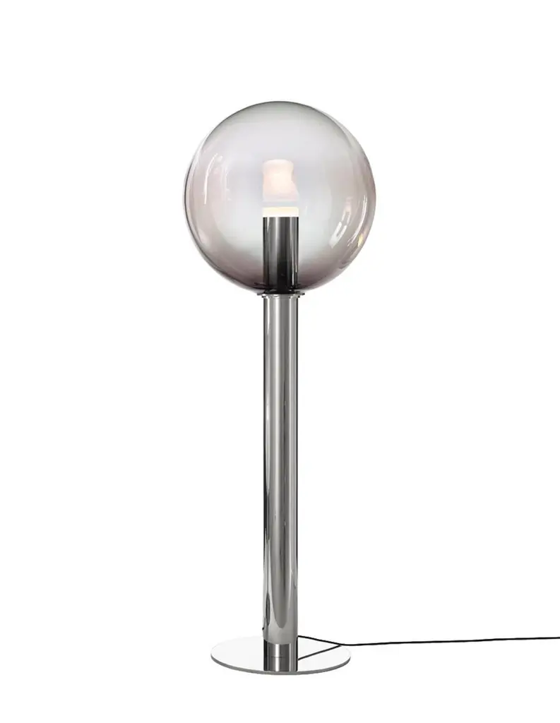 Smoke grey / silver blown crystal glass floor lamp, Phenomena by Dechem Studio for Bomma.The name chosen for this BOMMA collection, inspired by basic geometric shapes, comes from the Greek word for ‘appearances.’ According to Plato’s teachings, phenomena are mere transient images of eternal and perfect forms and thus inherently unreal. A fitting name for objects made of glass – a material that is both rigid and flexible, as well as strong, yet fragile. These lighting fixtures, in an array of fascinating sizes, are hand-blown into custom-made forms that combine both clear and colored glass. The color gradient is created by being gradually blown into the molten mass, as if breathing life into this collection. The flawlessly smooth shape of the crystal light is accented by a sophisticated polished mounting, highlighting a perfect blend of materials and aesthetics.Design: Dechem StudioMaterials: mouth-blown crystal glassproduct dimensions (dia): 400 mmproduct dimensions (h): 1600 mmlight source: led e27, max. 13 wbulb included: 1x e27, a60/a19 led, 8w, 800 lm, 2700k, ra90+dimming: dimmable with triac; on demand dimmable with dali, rf/wifi, for information on dimming with other systems please contact us directly.product weight: ± 38 kgcable length: textile cable 1,8 mNotes: The glass parts of pebbles are mouth-blown thus the intensity of color and gradient may slightly vary.Made by hand, in Czech Republic.BOMMA:Founded in 2012, Bomma continually brings the traditional Czech glassmaking craft to new and dynamic levels. With centuries of glassmaking tradition in East Bohemia behind us, we are now advantaged by a rich pool of talent and top-level skills. Instead of simply maintaining these traditions, Bomma moves a step beyond and sets today’s highest standards of glassmaking.Our master craftsmen are backed by some 300 enthusiastic team members in a new and ultra-modern production facility that thrives on in-house technology. Bomma produces 6 tons of refined extra-clear crystal each and every day. Our high-tech bespoke machinery for precise melting and measuring allows our craftsmen reach their maximum potential for manual finishing, enhancing what was always great and making it splendid. Our designed-to- purpose technology lends itself to otherwise unachievable customization and color-blending.Bomma know-how opens its doors to designers, business partners and private clients who continually challenge our technical teams and craftsmen. Bomma emphasis on contemporary design, outstanding glass quality and detail brought them many awards and world-wide recognition in a surprisingly short period of time. We now enjoy an exceptional position in the market, as well as countless interesting projects and collaborations.DECHEM STUDIO:DECHEM studio was established in Prague in 2012 by Michaela Tomiskova and Jakub Jandourek. They first met at the Novy Bor School of Glass, where they both fell in love with this earliest synthesised material in human history. While Michaela went on to study product design at AAAD Prague and later worked for several acclaimed design studios, Jakub continued to hone his skills in the lighting industry, specialising in glass workmanship, technology, and manufacturing. Since establishing Dechem studio they have focused on product design and maintained a special attention to glass, exploring traditional Bohemian craft techniques and the surprising connections of its various forms."Glass, just like people or trees, is perfectly capable of being shaped and formed. One can imprint just about anything into it, give it a form, capture a passing moment, breath a new life into it. Later it stiffens and freezes like a petrified fossil, like magma, like a witness. No one can move it. It is solid as a rock and if you urge it, it rather shatters into pieces than to surrender..."Michaela Tomišková & Jakub Jandourek.