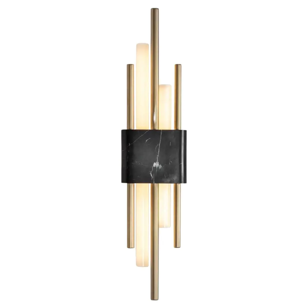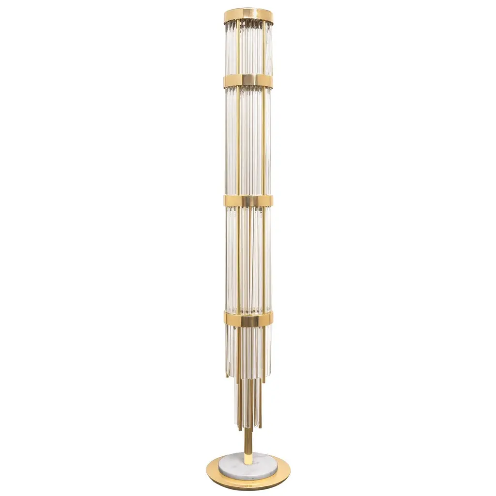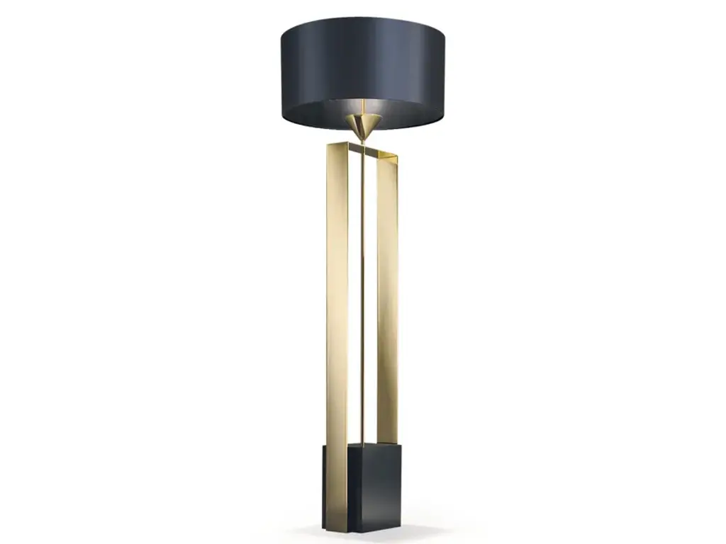 A silhouette that is as bold as it is glamorous defines the superb character of this brass floor lamp, borrowing neat geometric volumes and reinterpreting them in a captivating, luxe key. Two cylindrical diffusers in prized black silk envelop each a pair of E14 bulbs (60W) and appear as seemingly floating while an array of tubular stems passes through them. A smaller version and a table variant are also available options, please consult the Artemest catalog for details.