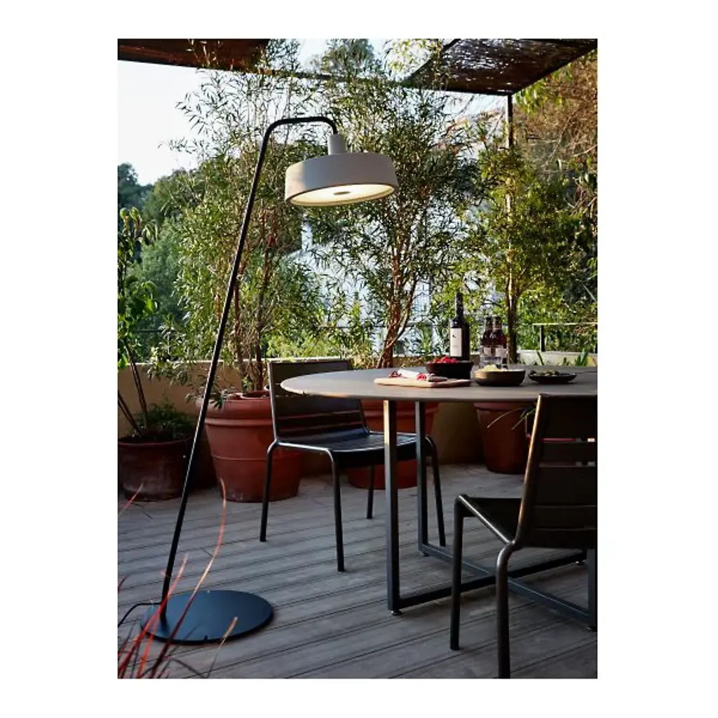 Make a statement in your favorite outdoor space with the Soho Outdoor Floor Lamp from Marset, a classic modern piece reminiscent of traditional lamps used in storefronts and markets. Designed by Joan Gaspar in 2010, a rounded base extends a lengthy, thin body that gracefully curves around, ending a wide, polyethylene shade that contains an opal diffuser and an integrated LED. The light emitted is at once transformative, washing the space in a warm and steady glow.