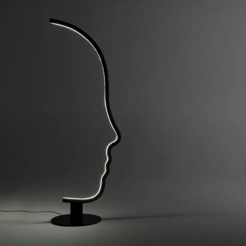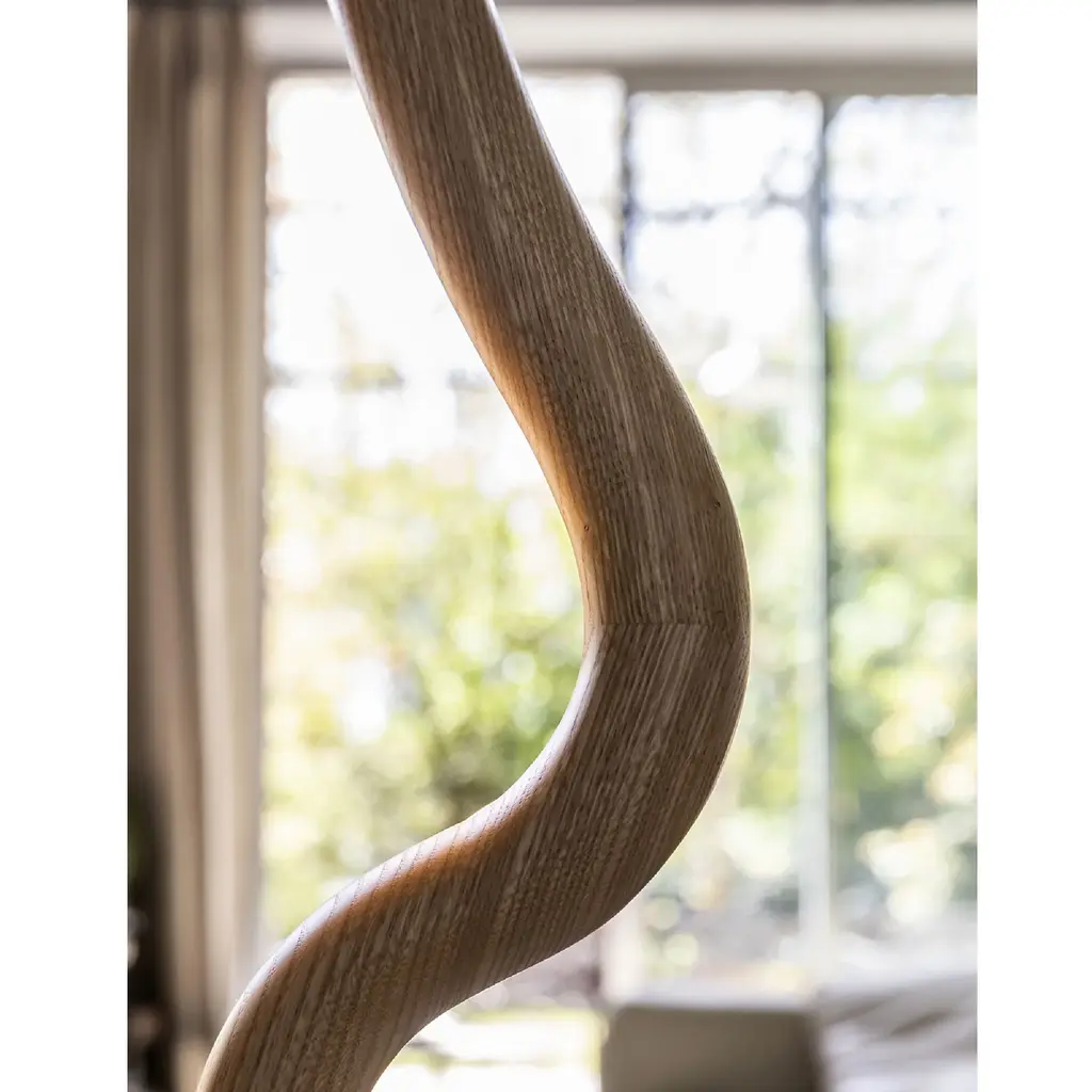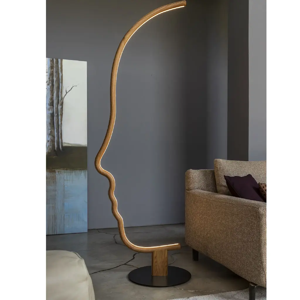 Indulge in the sophistication and exclusivity of the Solid Wood Graphic Floor Lamp from Mogg Vis a Vis. Crafted with precision from solid wood and finished with black paint, this lamp resembles a sculpture that adds an artistic touch to your home. With its LED light and metal base, it balances form and function seamlessly. Elevate your space with this micro-installation.