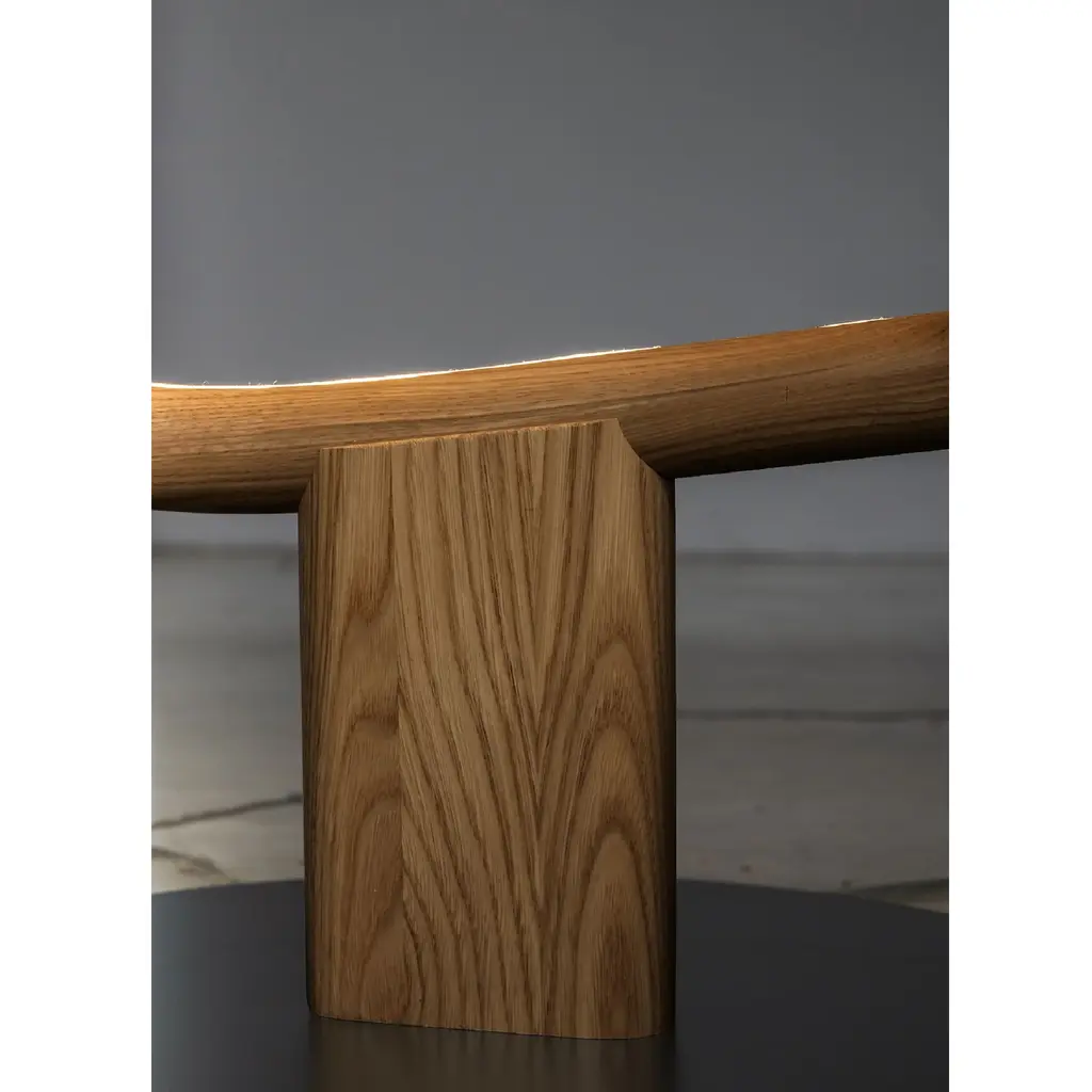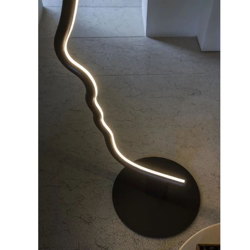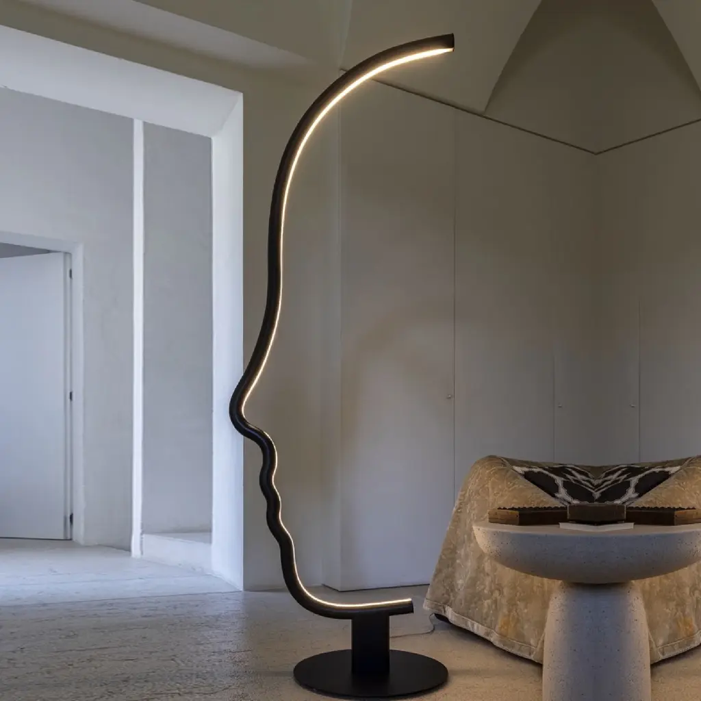 Indulge in the sophistication and exclusivity of the Solid Wood Graphic Floor Lamp from Mogg Vis a Vis. Crafted with precision from solid wood and finished with black paint, this lamp resembles a sculpture that adds an artistic touch to your home. With its LED light and metal base, it balances form and function seamlessly. Elevate your space with this micro-installation.