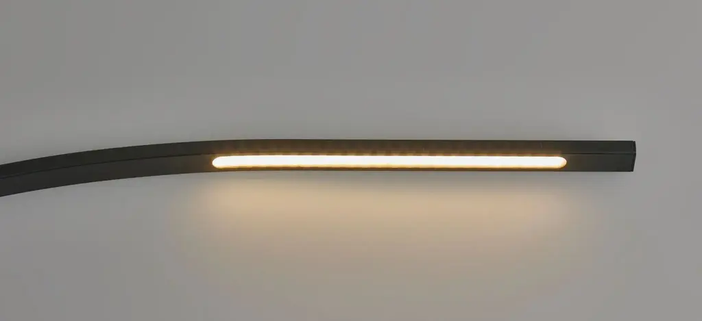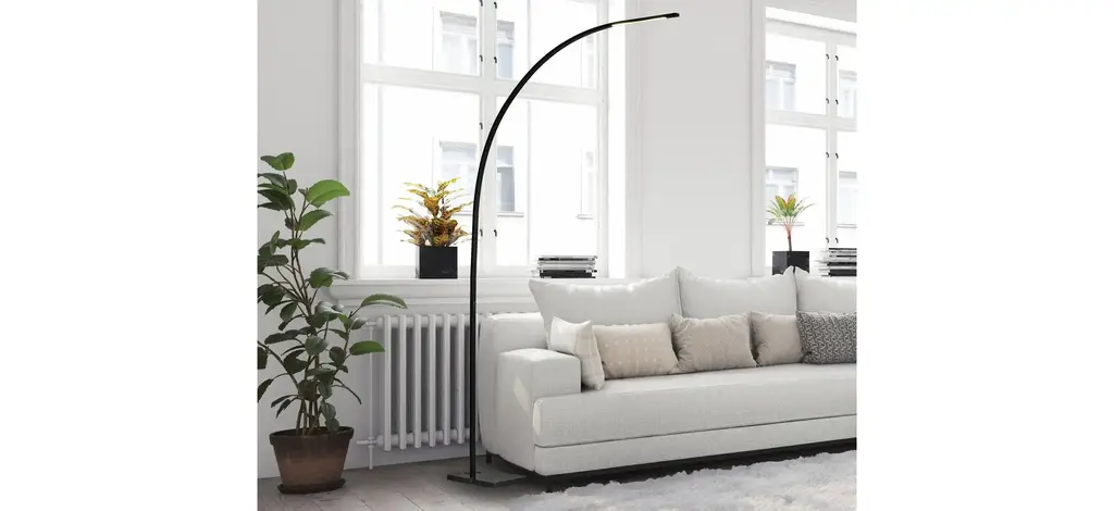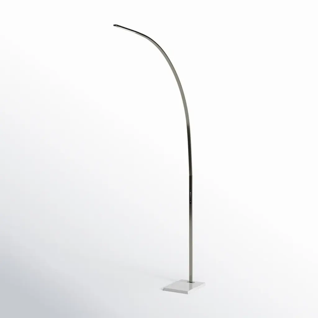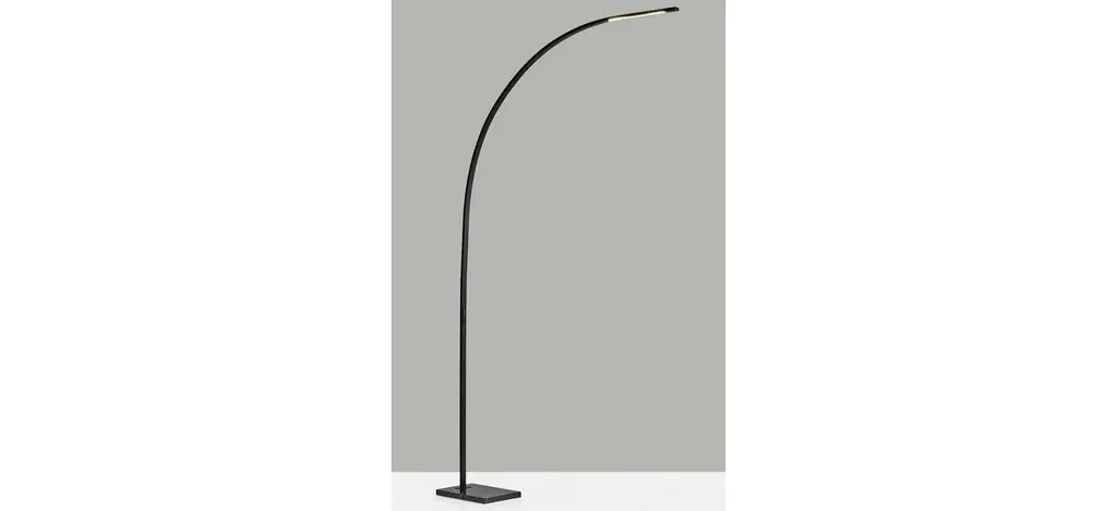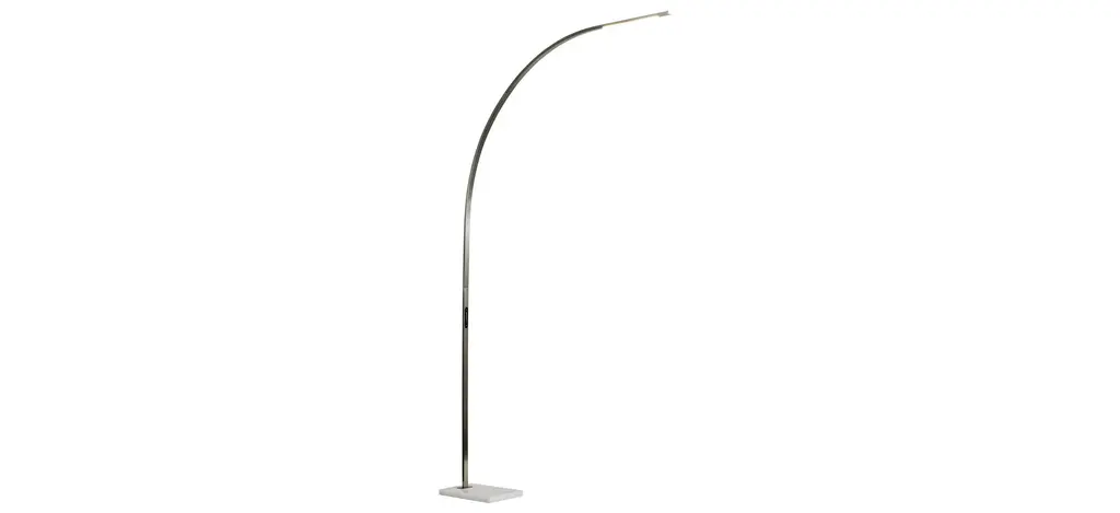 The Sonic Floor Lamp's dramatic arc of metal illuminates any room with 2,000 lumens of energy-efficient 24W LED lighting. Rated to last 50,000 hours, the LED lighting is integrated into the lamp and softened by a frosted diffuser. The slender rectangular tube extends more than 7' and offers a smart switch with a full-range dimmer and five settings to find the perfect color temperature for your mood, from crisp to warm, at the touch of a finger. Anchoring the lamp is a rectangular marble base that adds a hint of elegance. This lamp is powered by a 5' cord. The Sonic LED arc lamp is also available with an antique brass or brushed steel finish.