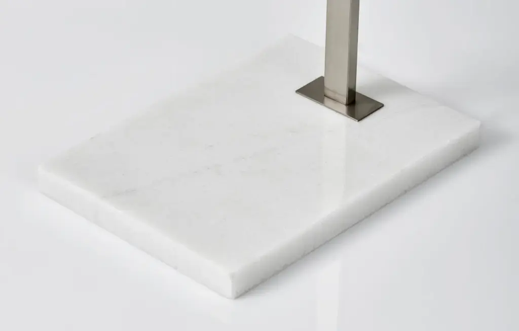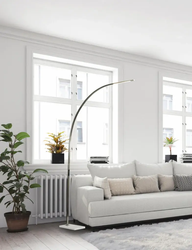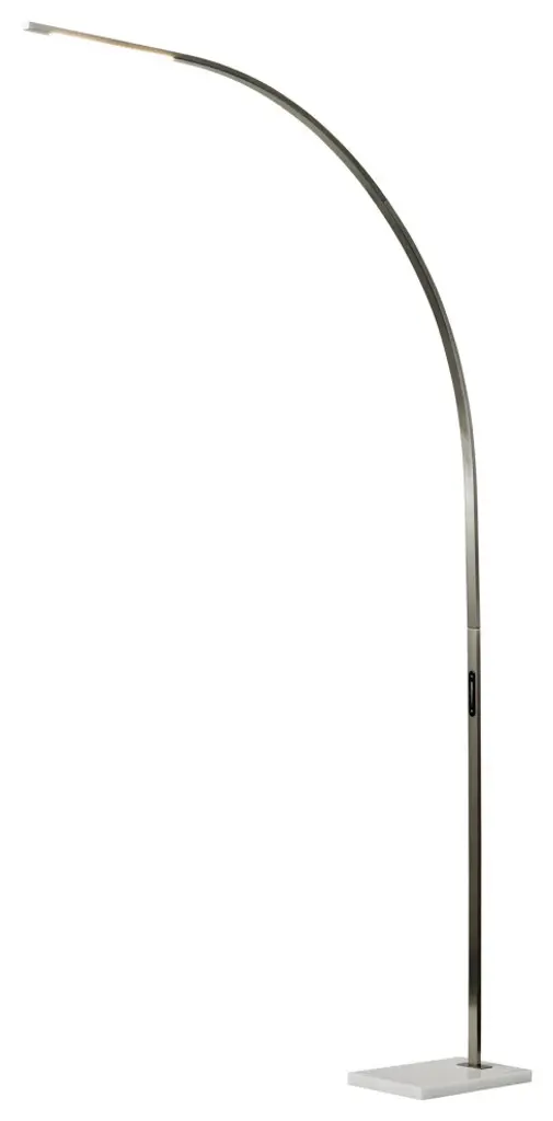 The Sonic floor lamp''s dramatic arc of brushed steel illuminates any room with 2,000 lumens of energy-efficient 24W LED lighting. Rated to last 50,000 hours, the LED lighting is integrated into the lamp and softened by a frosted diffuser. The slender rectangular tube extends more than 7'' and offers a smart switch with a full-range dimmer and five settings to find the perfect color temperature for your mood, from crisp to warm, at the touch of a finger. Anchoring the lamp is a rectangular white marble base that adds a hint of elegance. This lamp is powered by a 5'' black cord. The Sonic LED arc lamp is also available with an antique brass or black metal finish.With a compact footprint and slender design, this lamp is the perfect addition beside couches, loveseats, and armchairs.Integrated LED lighting is energy efficient.A touch switch located on the pole adjusts the full-range dimmer.Five color temperature settings are controlled by the smart switch: 2700K, 3300K, 3900K, 4500K, and 5000K.The white marble base creates a polished look while providing sturdy support to the lamp.24W LED