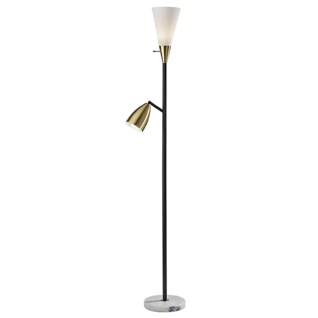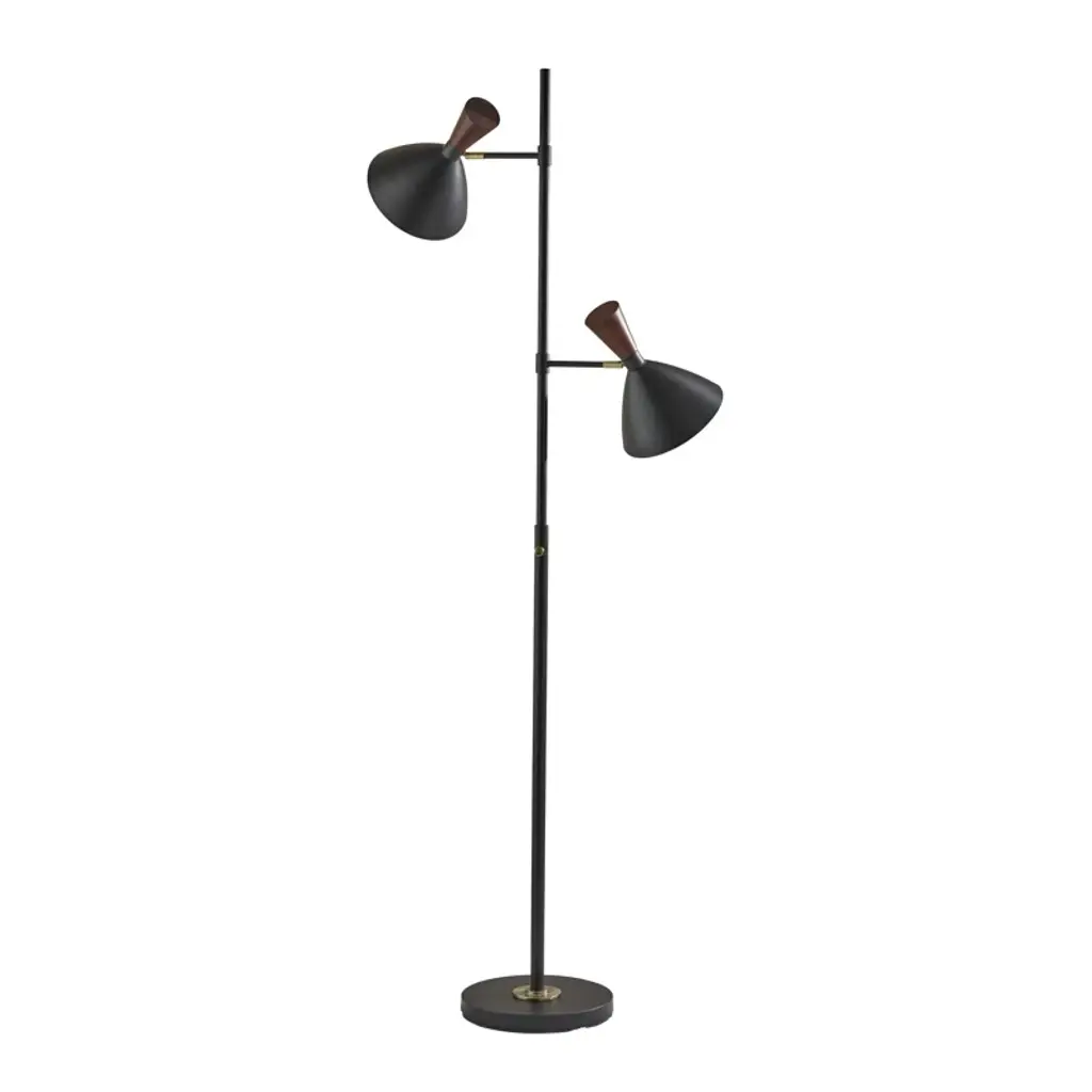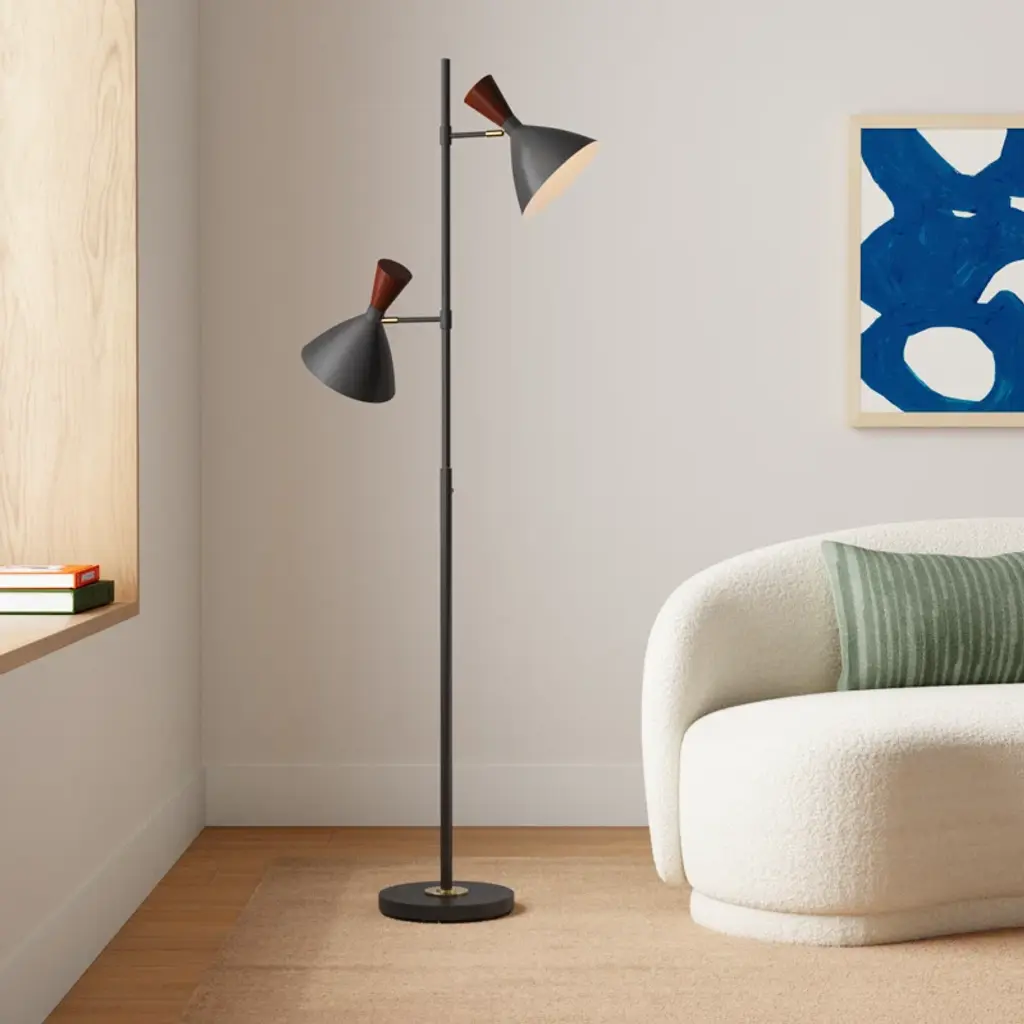Add a touch of modern to your living space with the Sonoma Tree Lamp. The Sonoma Collection channels mid-century modern styling with an accentuated oversized shade silhouette. With two shades, this floor lamp offers both directive and ambient lighting. Walnut wood accents create a warm contrast to a matte black finish. Adjust the shades to direct light where it is needed. Bulbs are not included.