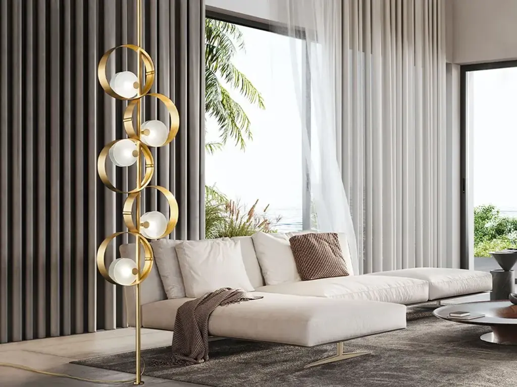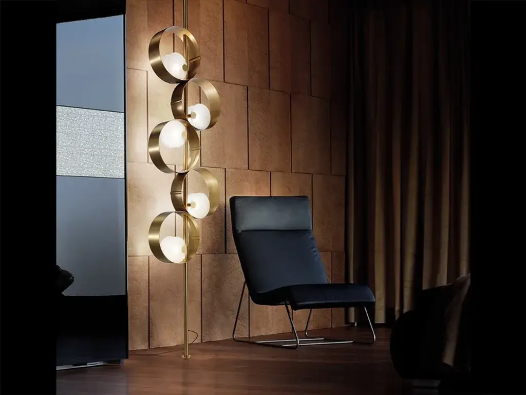 Sound STL5 is a floor lamp made of metal.Electrical characteristicsStandard:5XG9X10WCELED:LED X 44W CRI>90 3000 K 6500 LMLED X 44W CRI>90 2700 K 5520 LMDIMMABLE: OWN BUTTONCE LEDCCC LEDCB SCHEME LED Sound is a collection of lamps made of metal with decorated glass diffuser. Available in 2 different finishes, brushed gold and two-tone matte black / brushed brass